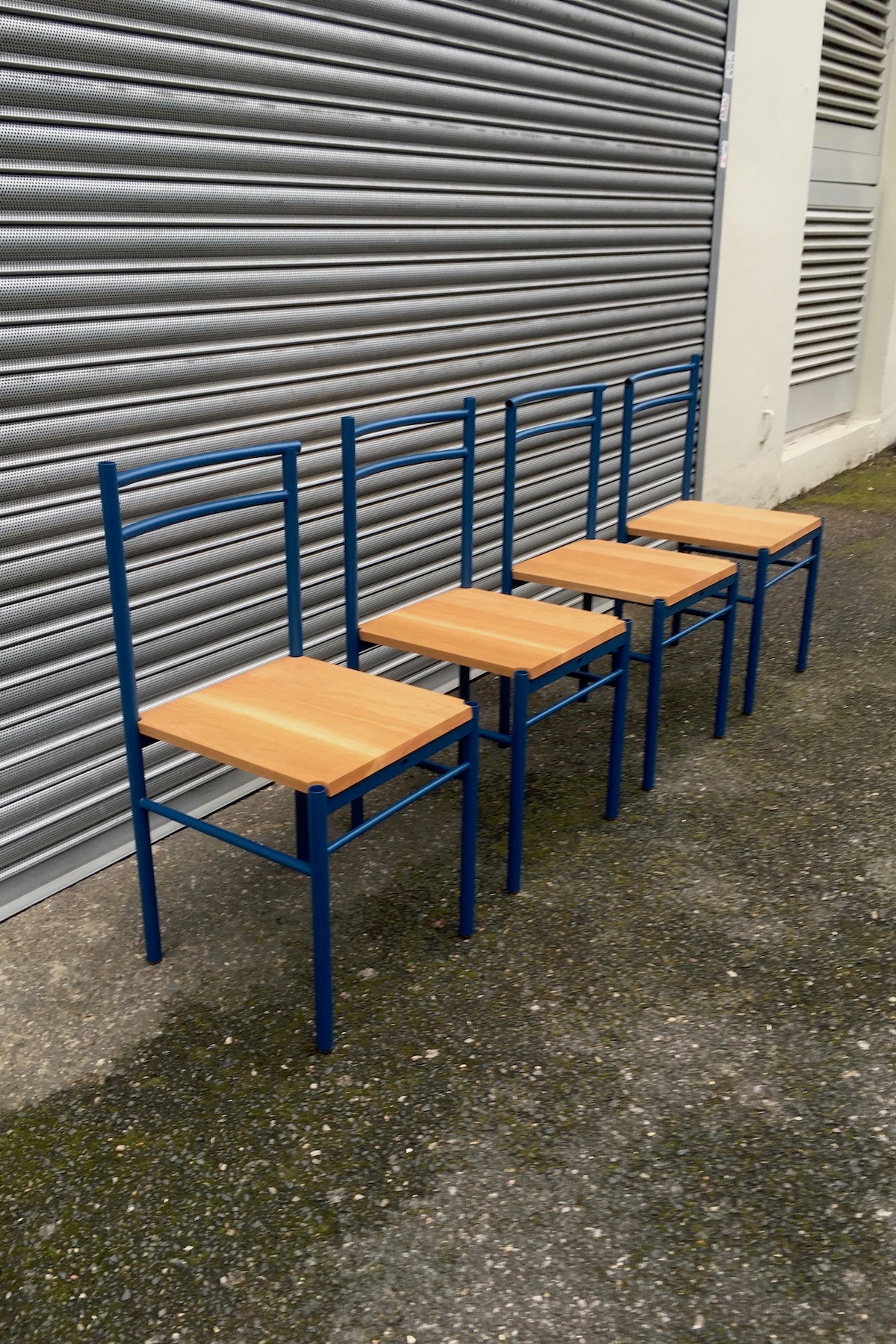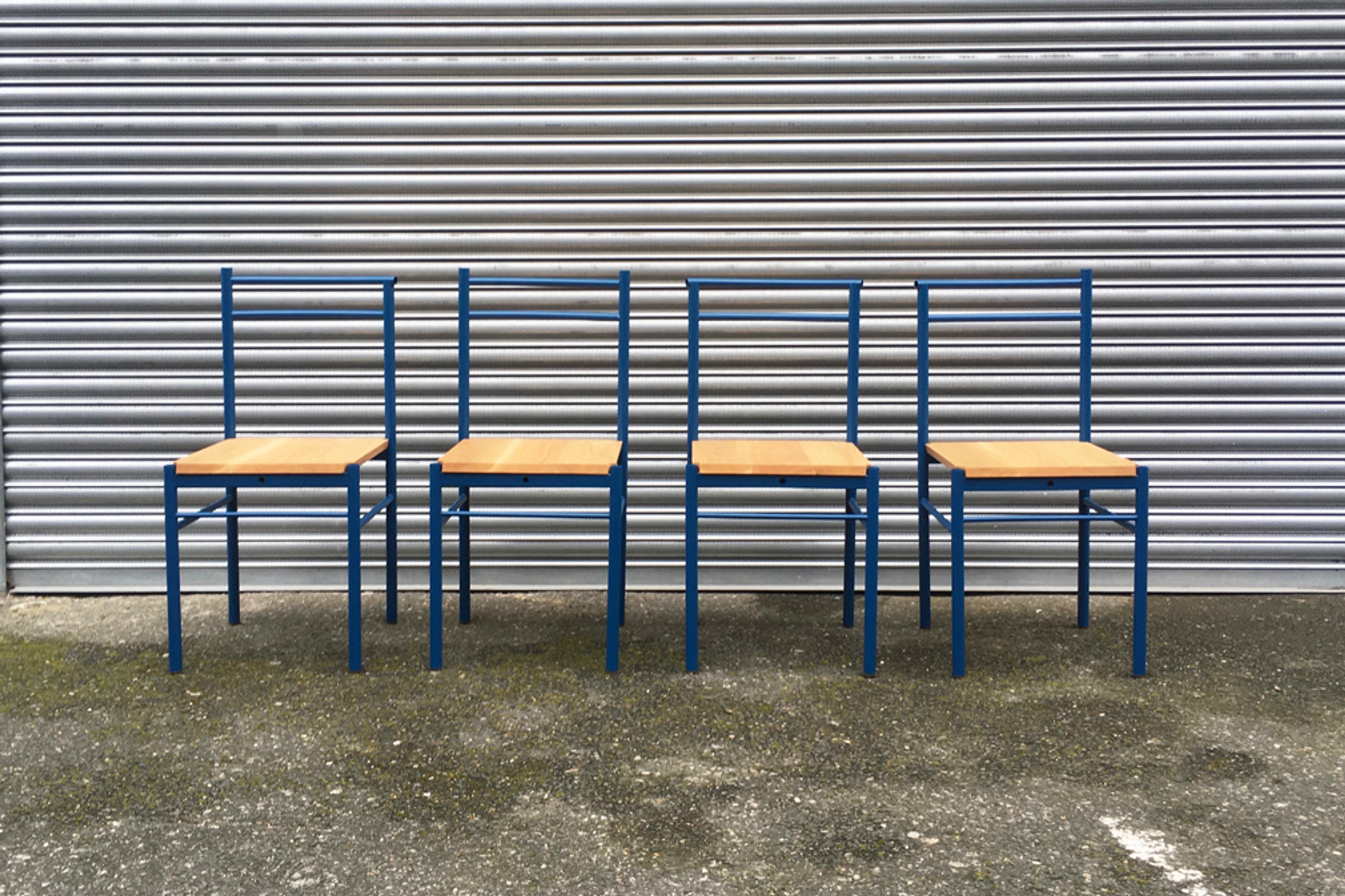A tubular steel take on a shaker chair, each frame is unique using a different backrest configuration. Set of four.