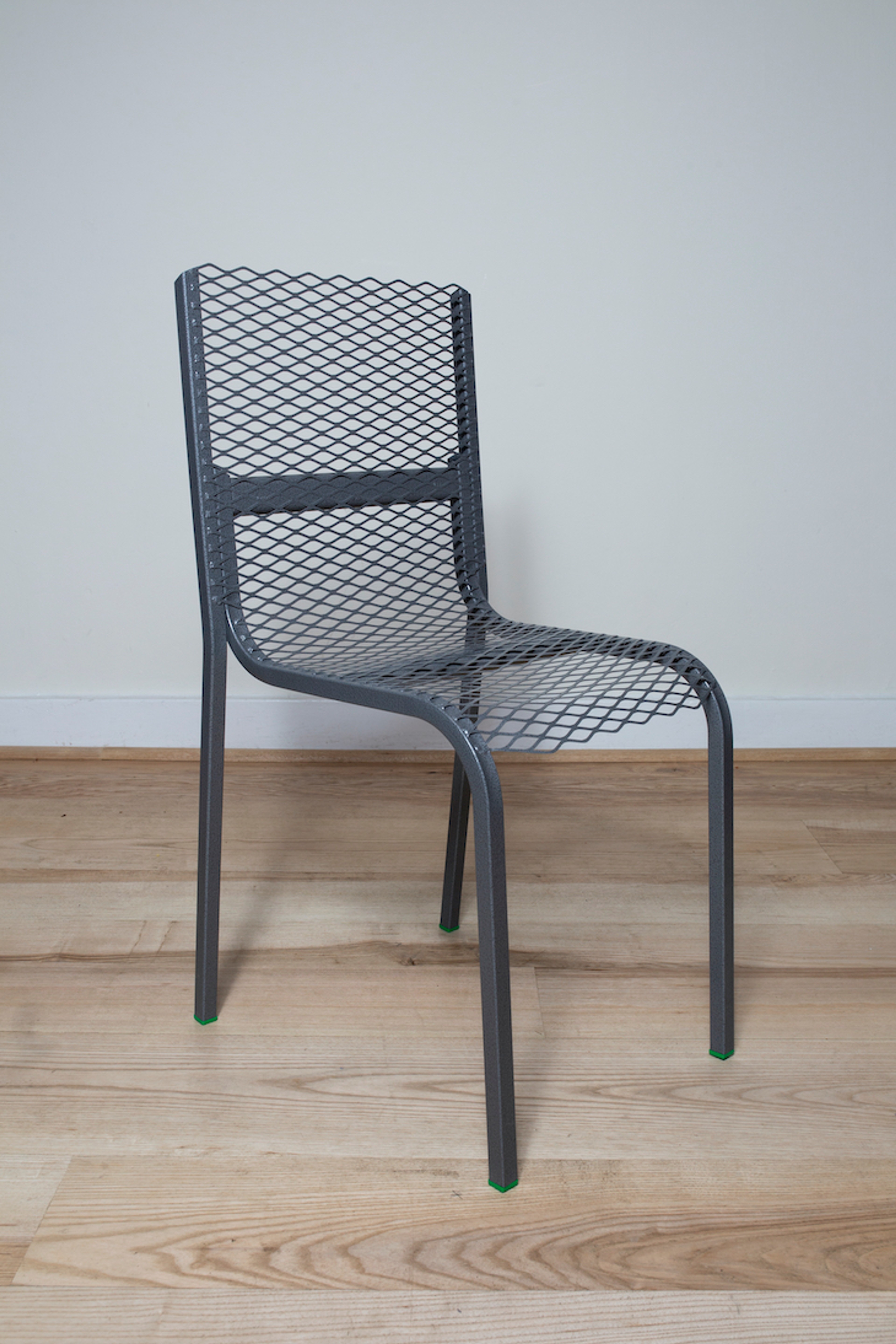 A lightweight chair in bent box section and expanded mesh. Part of a series of one-off/improvised chairs for Redemption Roasters.