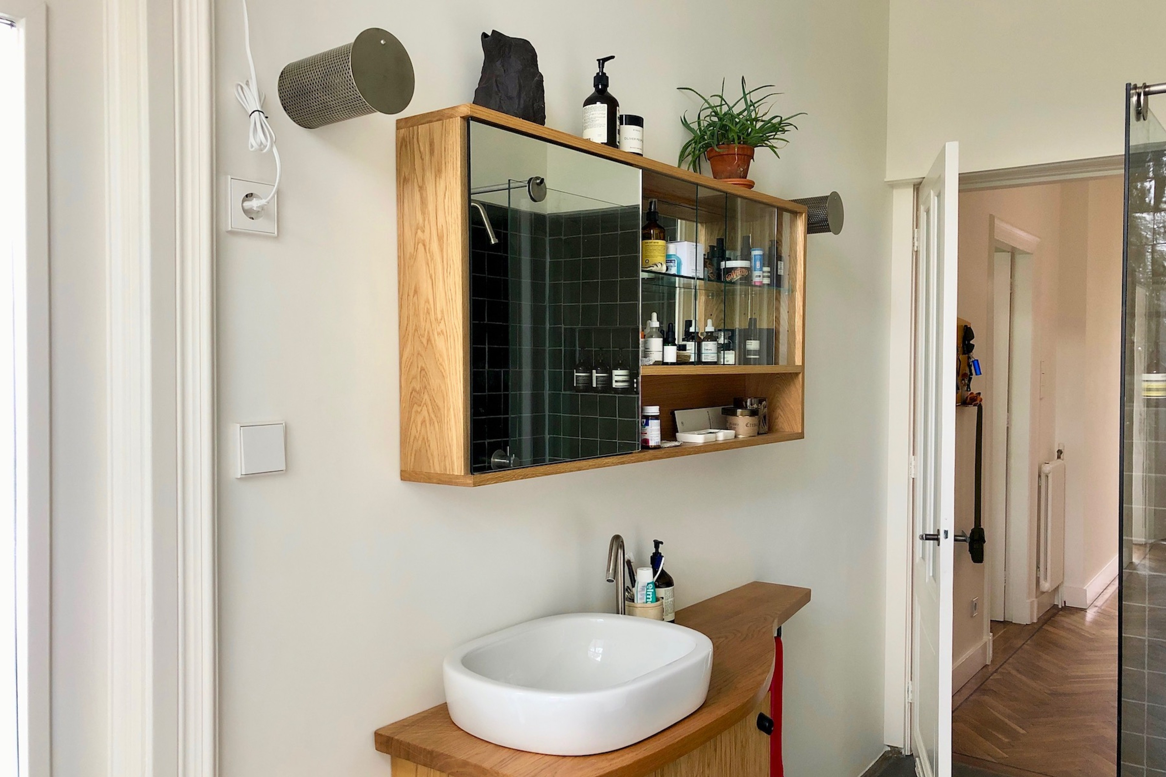Oak, Stainless Steel, Powder coated steel, Glass – August 2020
