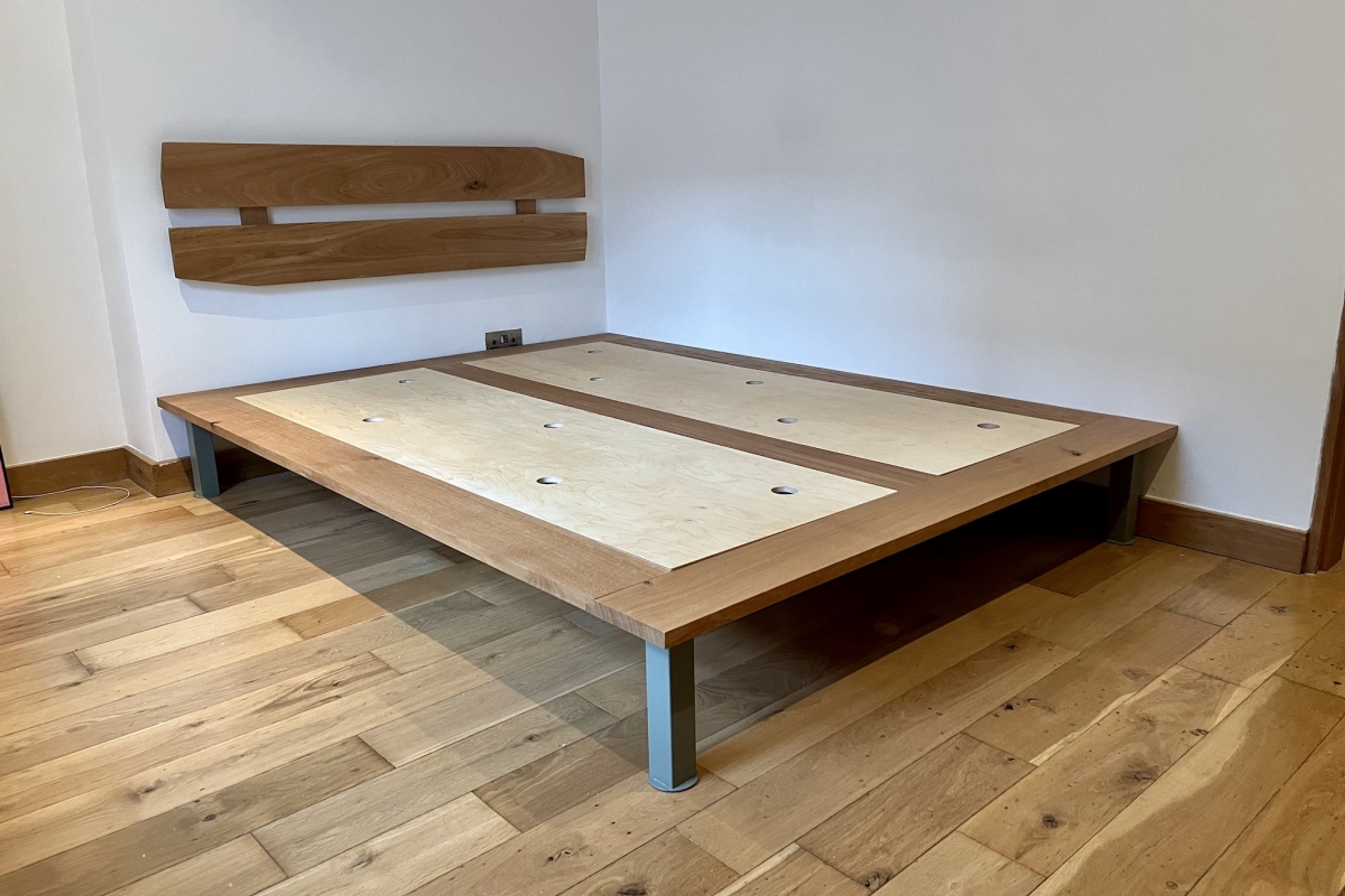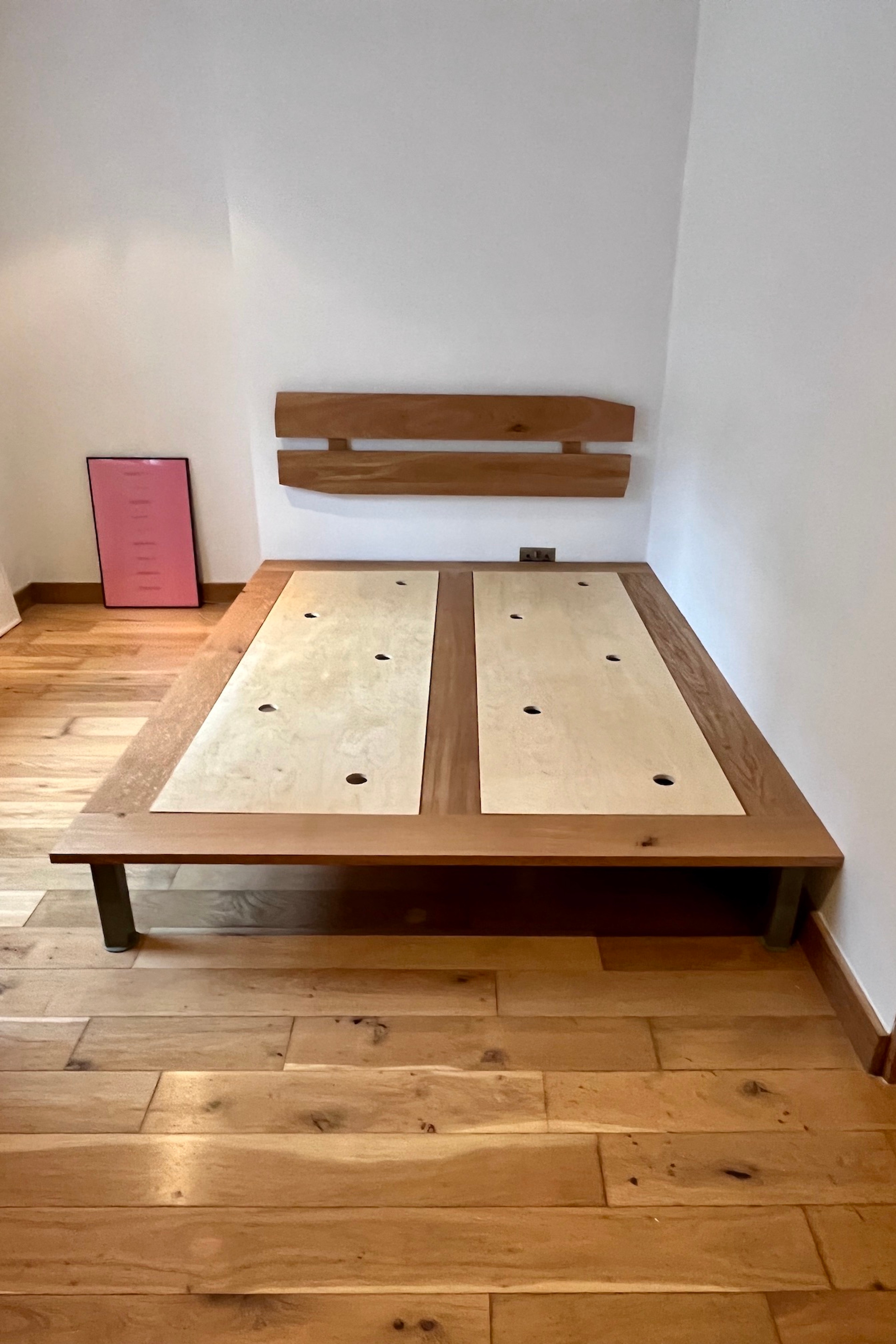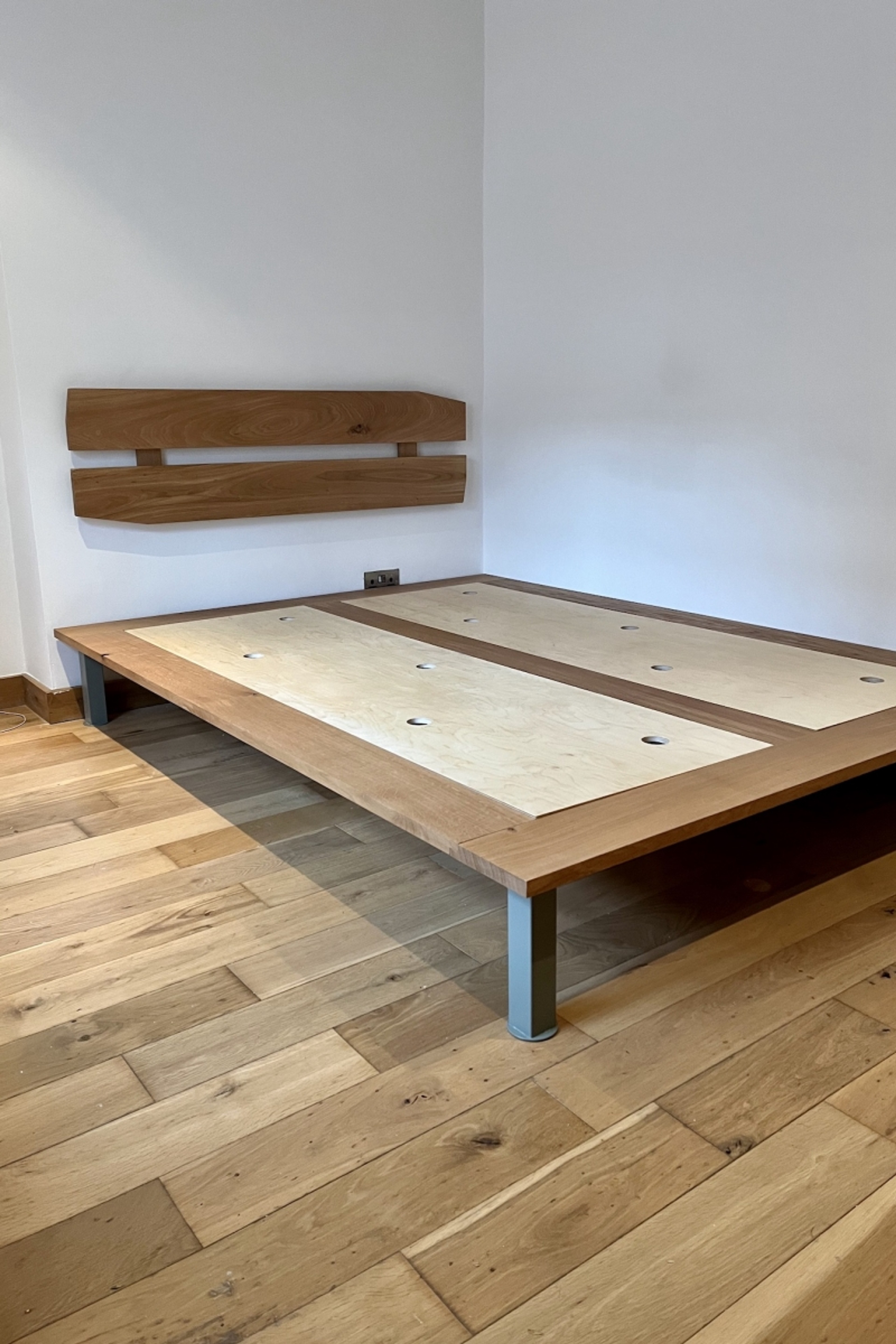 An updated version of Bed II. Bed base with separate wall mounted headboard. The base structure is bolted, allowing it to be easily unassembled when needed.