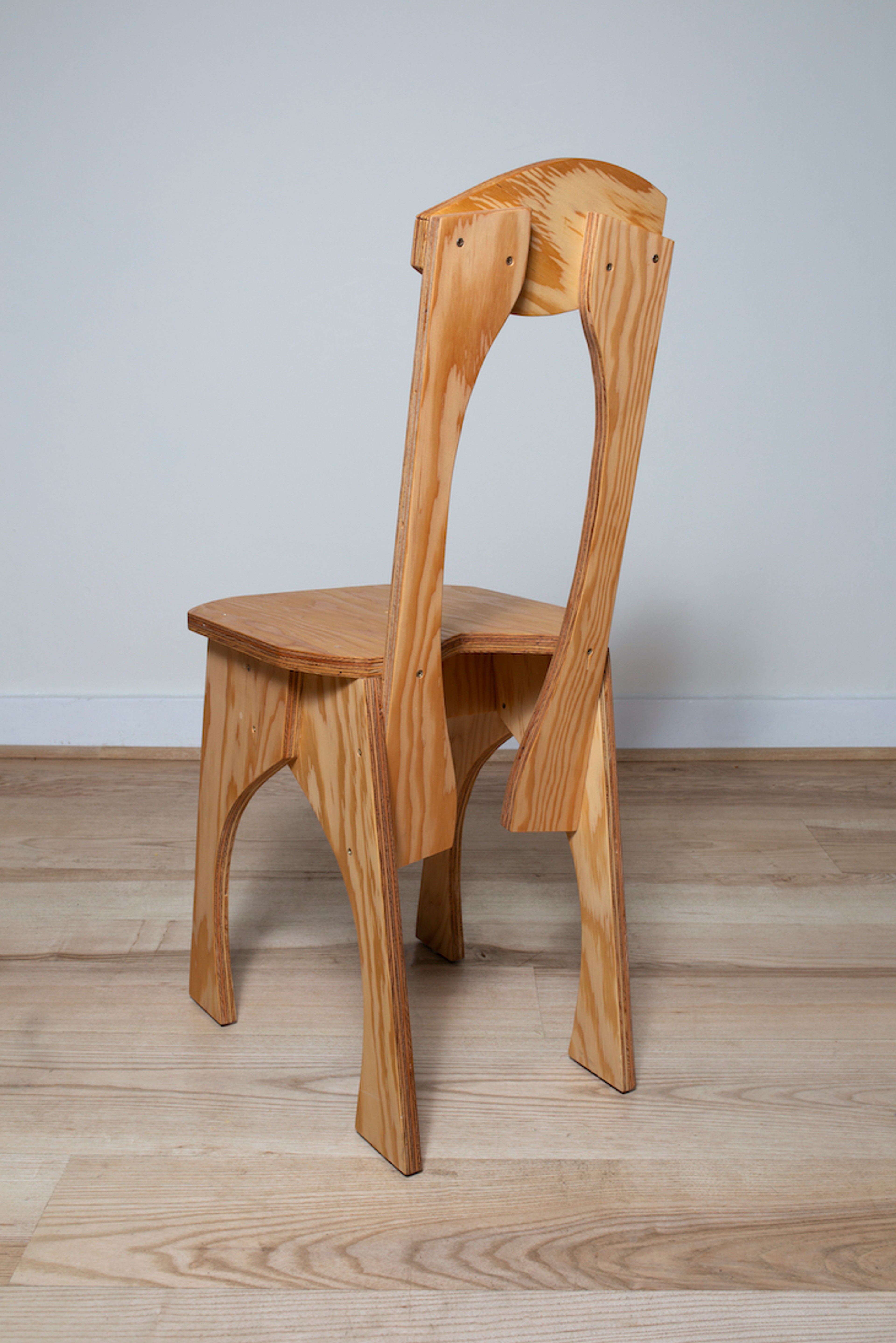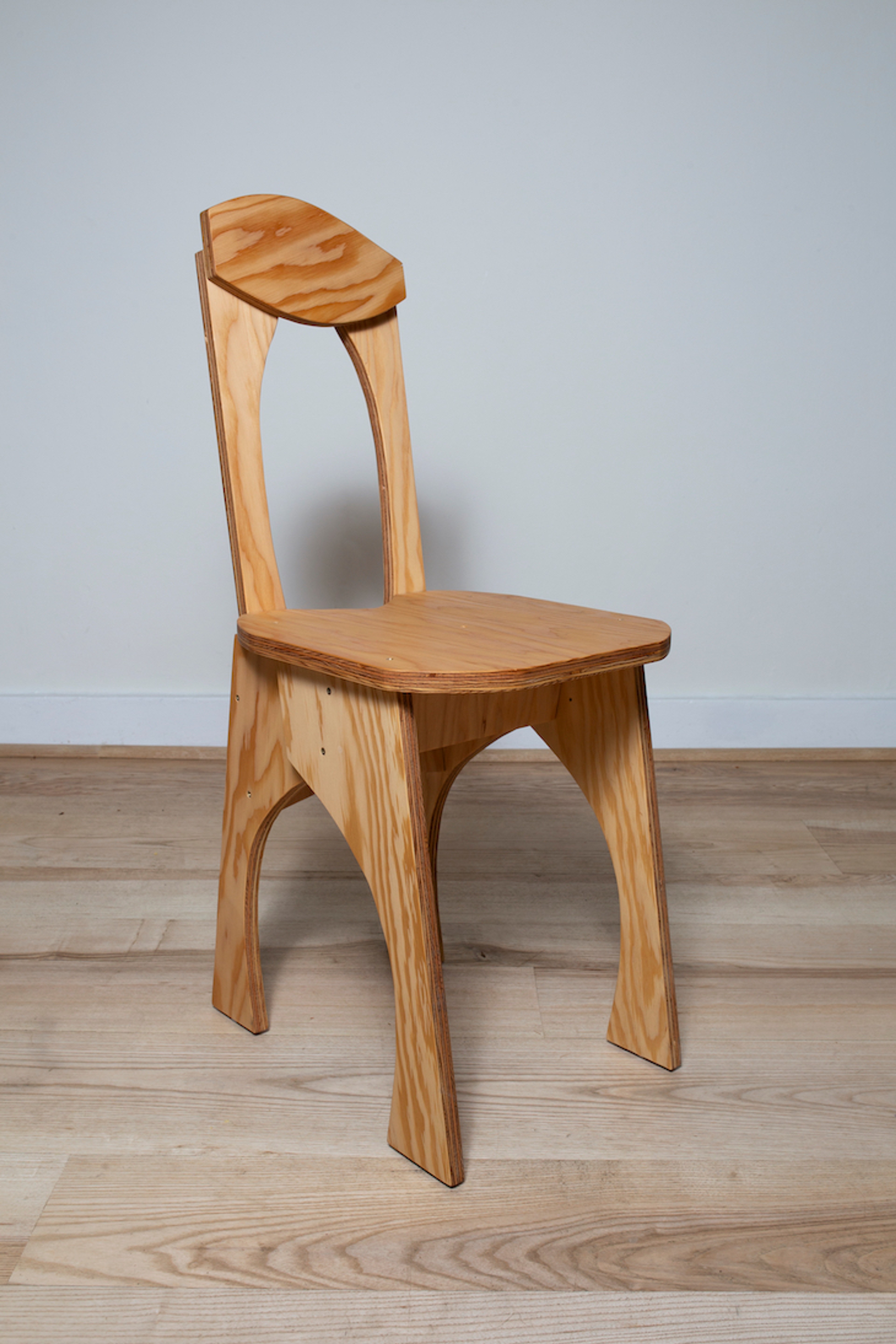 Chair with much of the components cut freehand on a bandsaw using both sides of the cut. Part of a series of one-off/improvised chairs for Redemption Roasters.