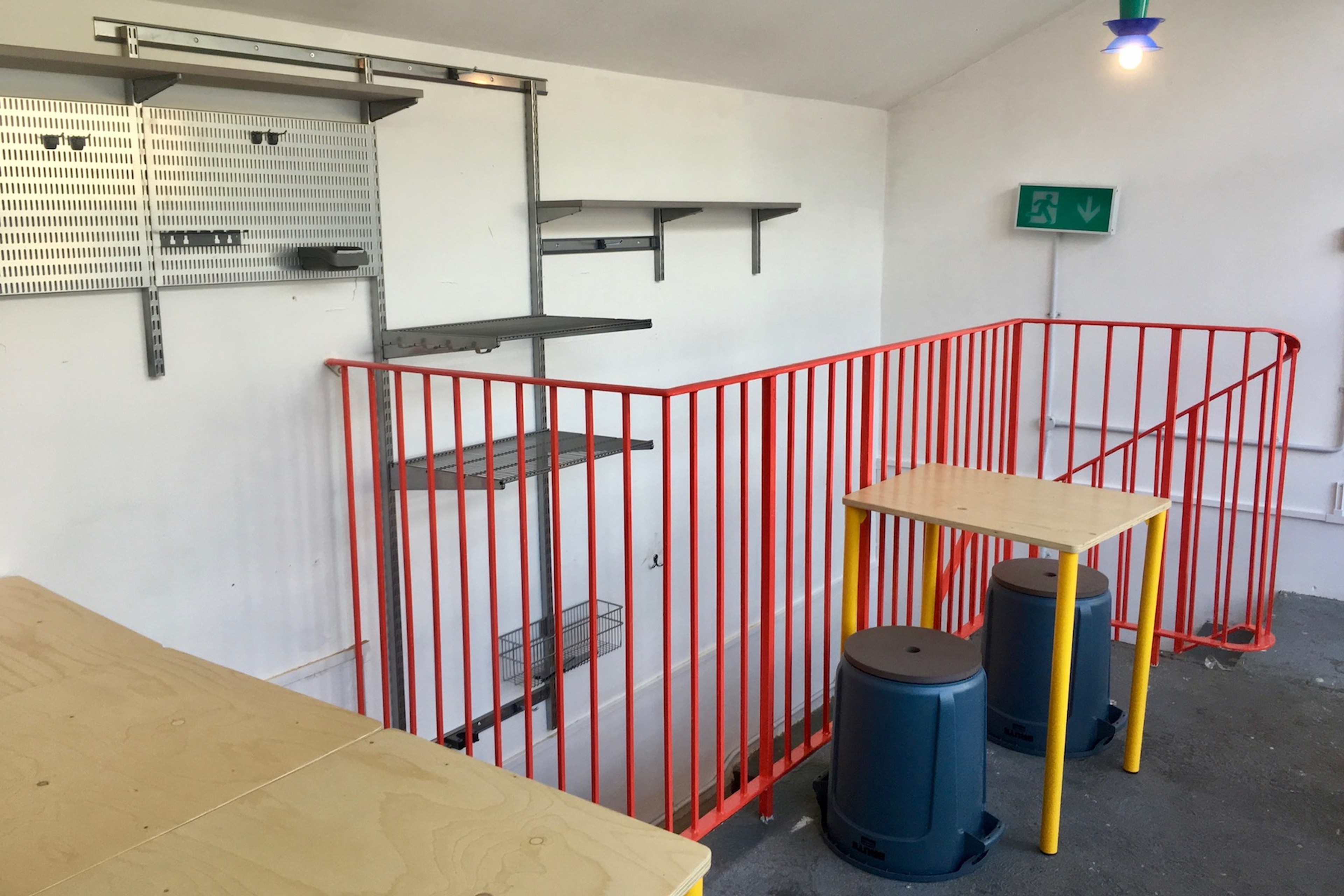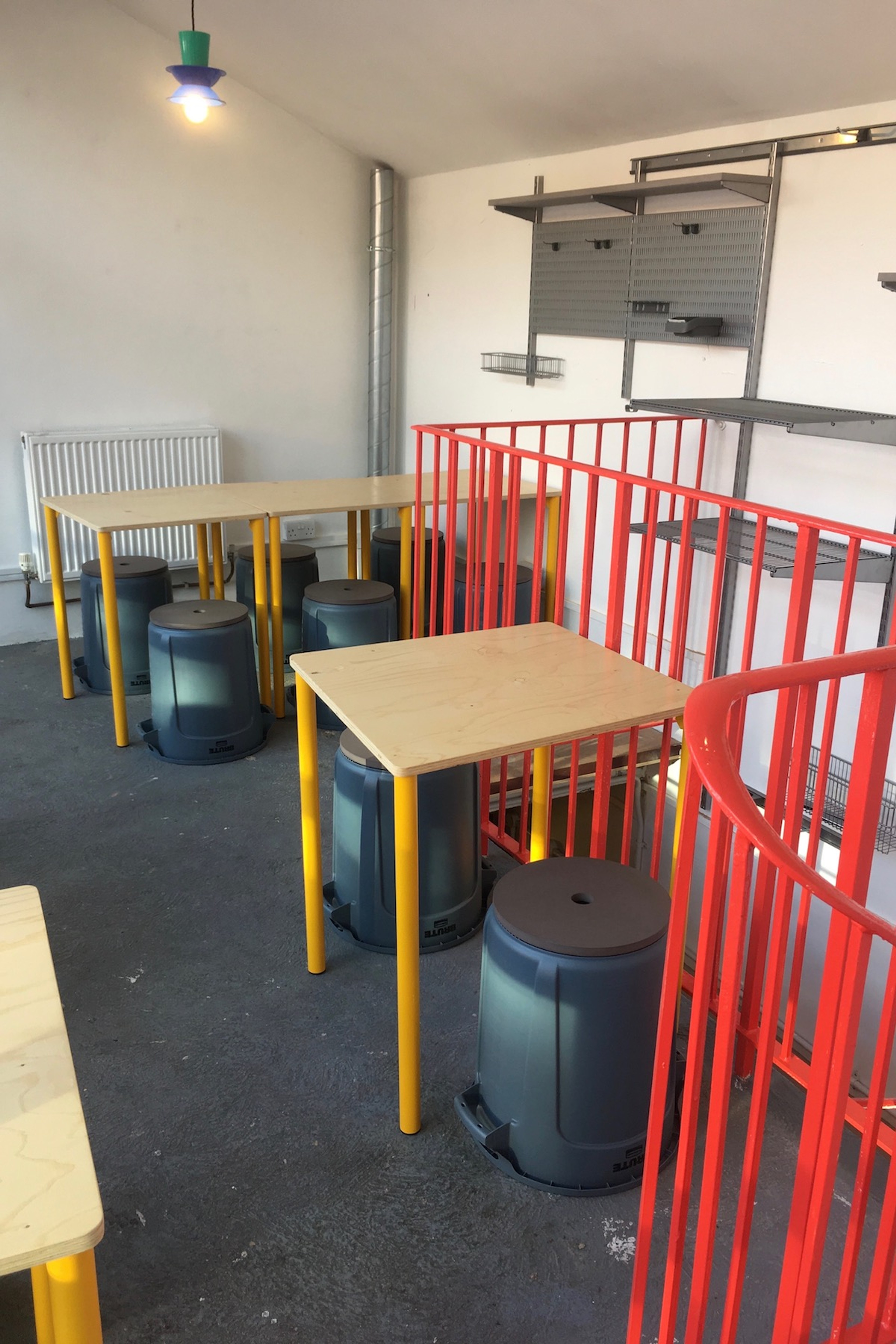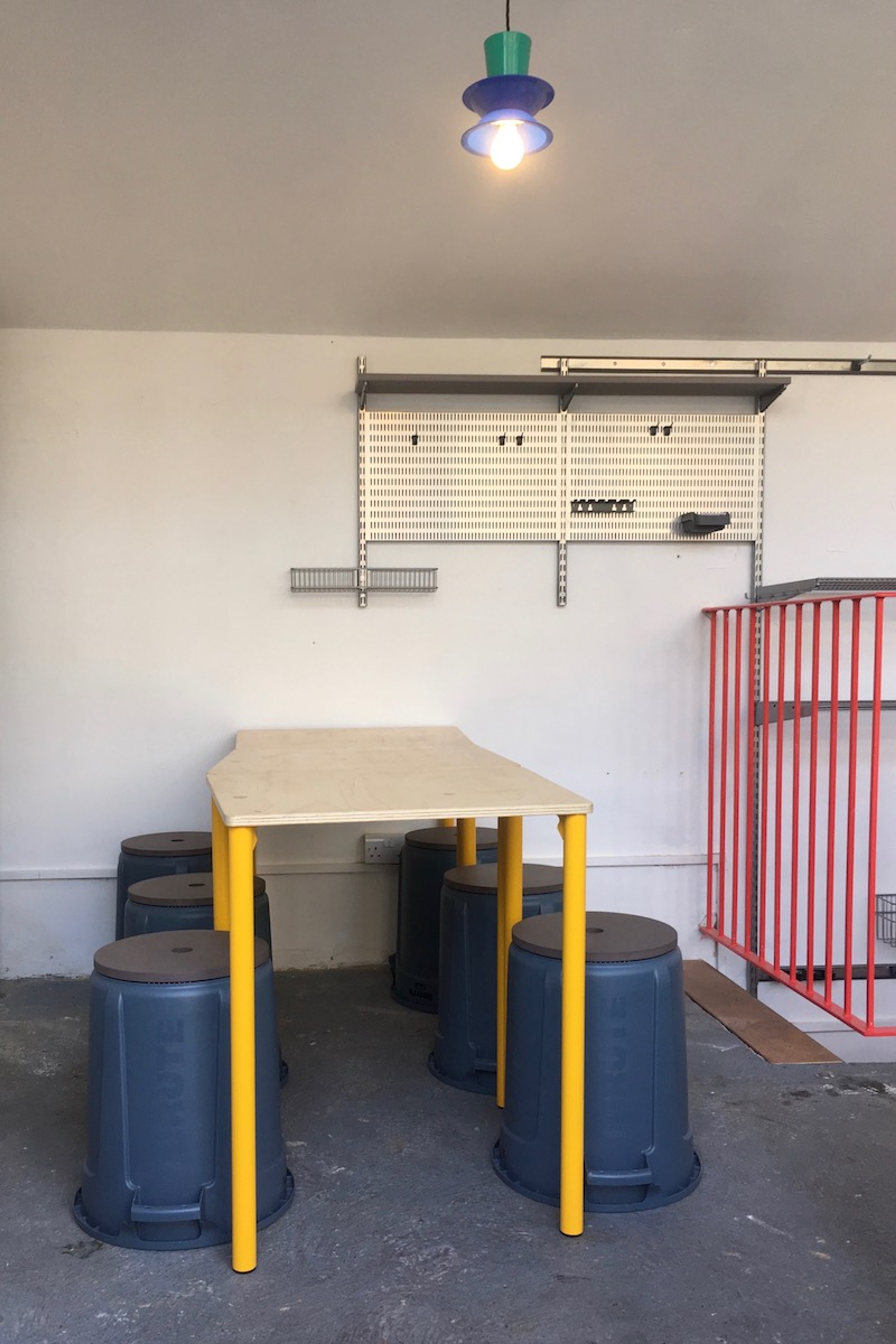 Brute containers, Kristallon crockery, Powder coated steel, Plywood, Custom Elfa storage system, Valchromat – October 2018