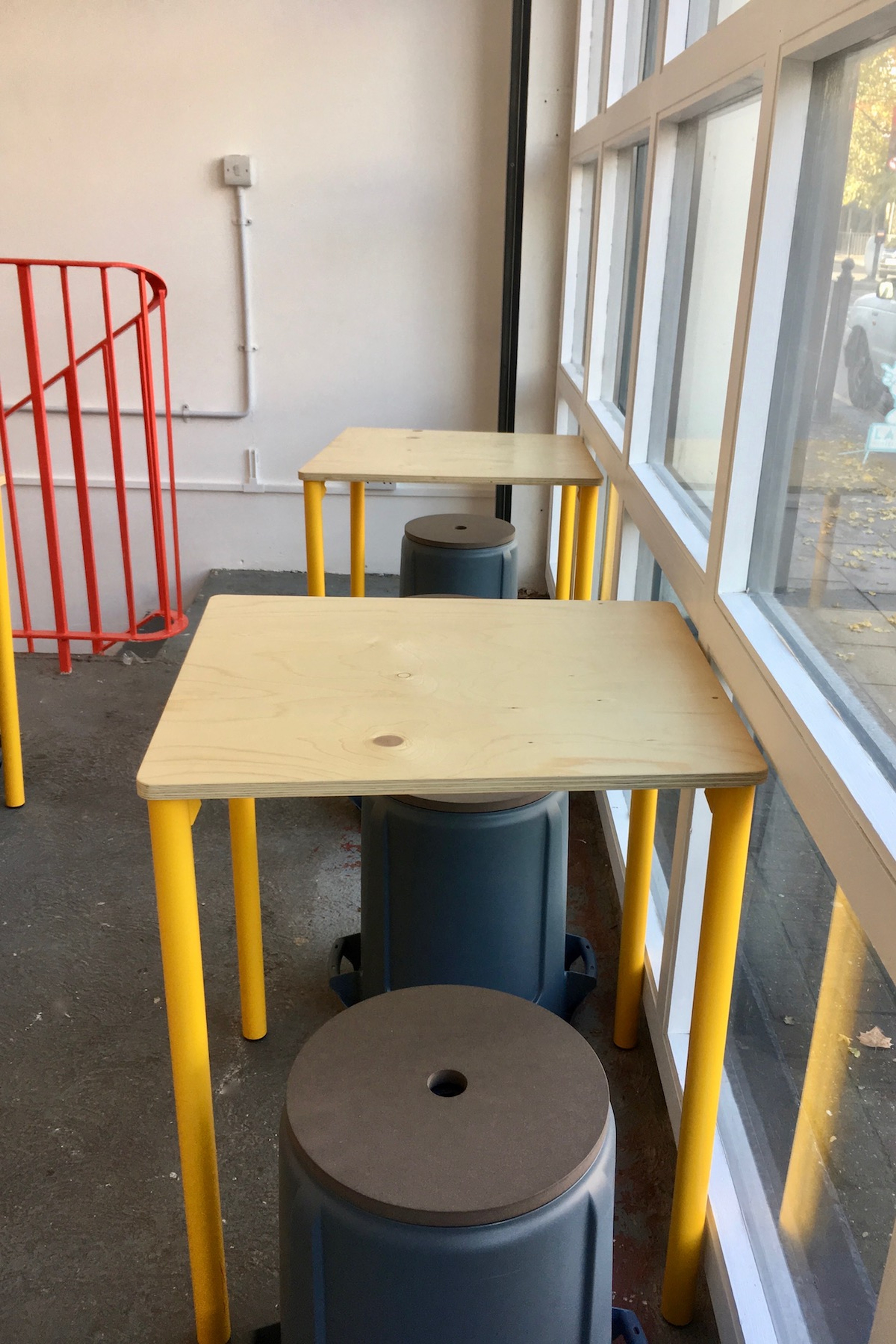 Furniture/interior design for Lanark Coffee‘s new space J.Bell. The space which is next door to the original Lanark will provide extra seating and a rotating display/retail wall. All furniture was designed to use ready made items and hardware where possible, re-purposing catering supplies and readily available materials. With the tables this idea of repurposing was not possible so we opted to go with a design with minimal waste and labour involved. The irregular tops are cut from a single sheet of ply that is divided into a grid of 10 and 5 degree angles this uses the board entirely producing no waste. The shapes are intended to be easy to slip past in the tight space while also allowing interesting configurations for large groups if needed. The legs are a repeat of the same design utilising a laser cut bracket and tubular upright, there is no need for further supporting structure which means the tables can also stack in to towers of three.