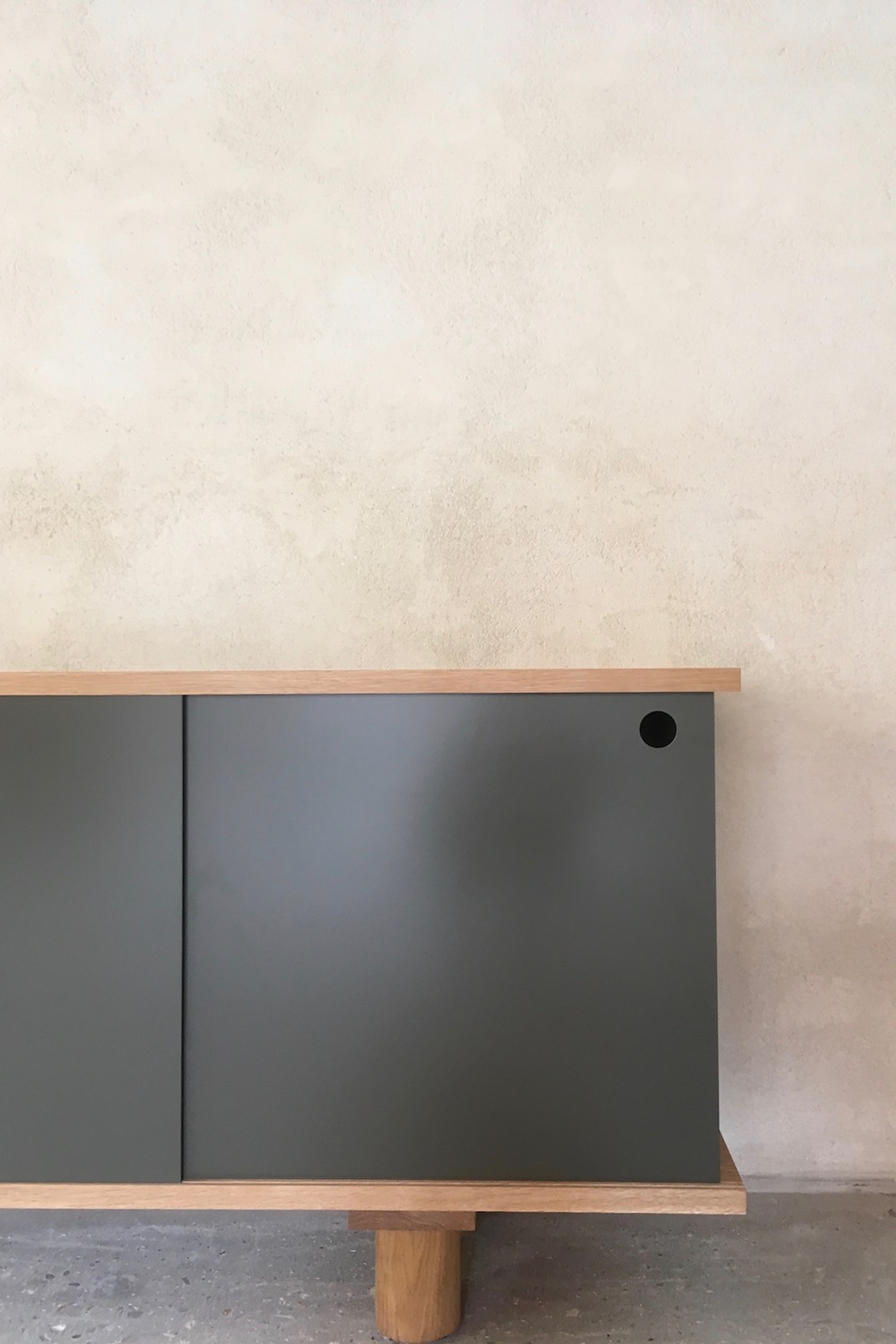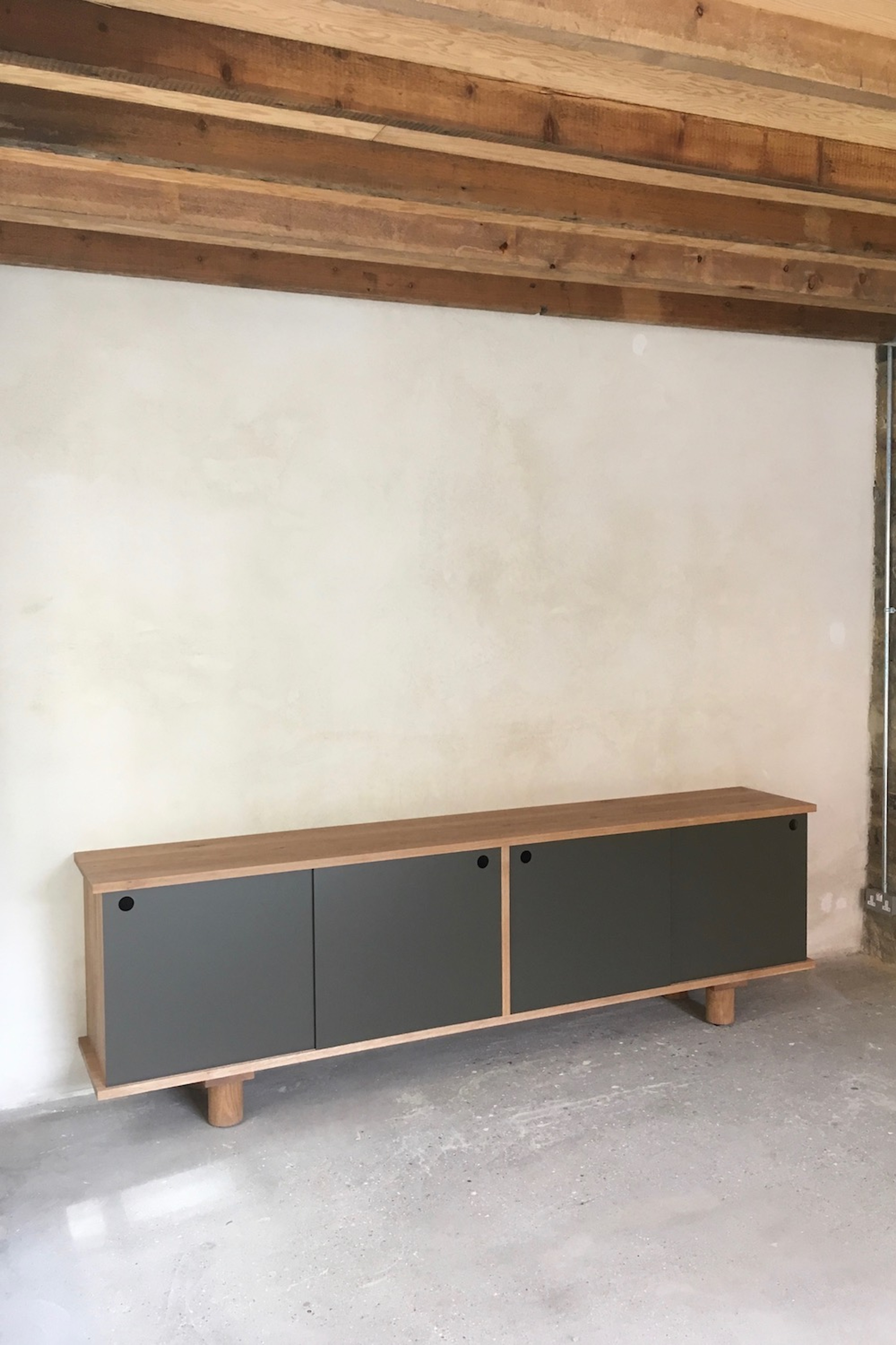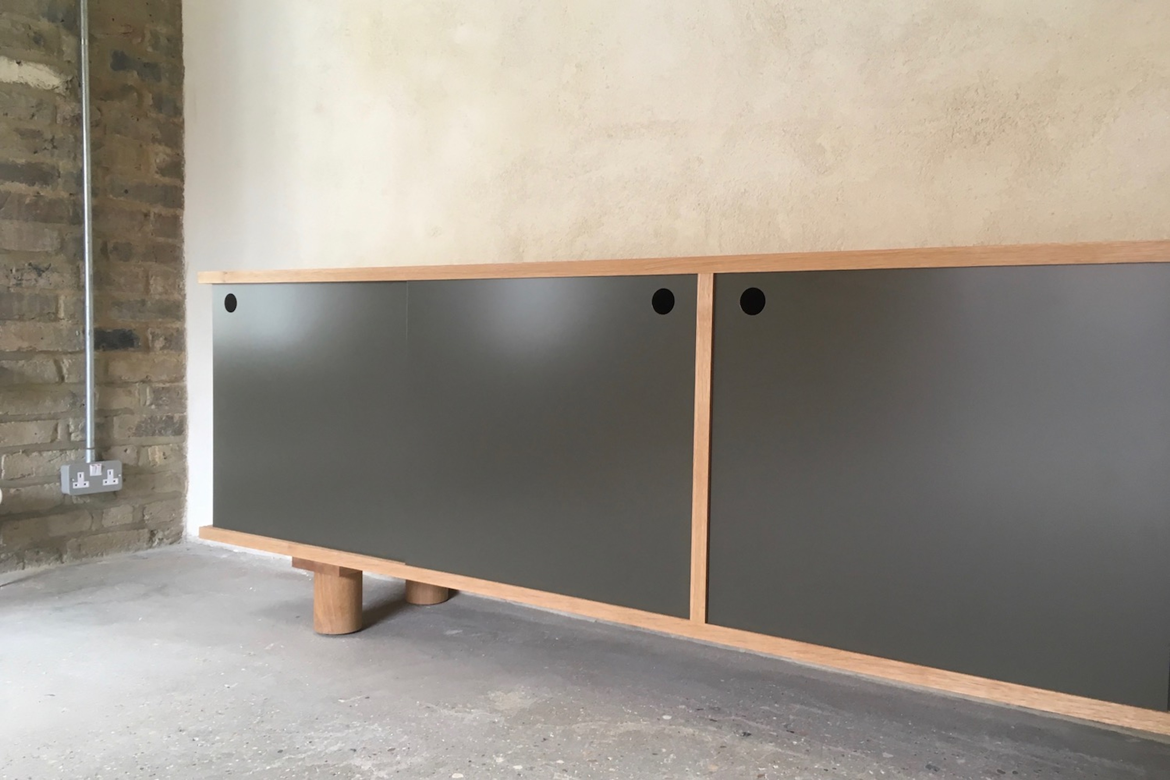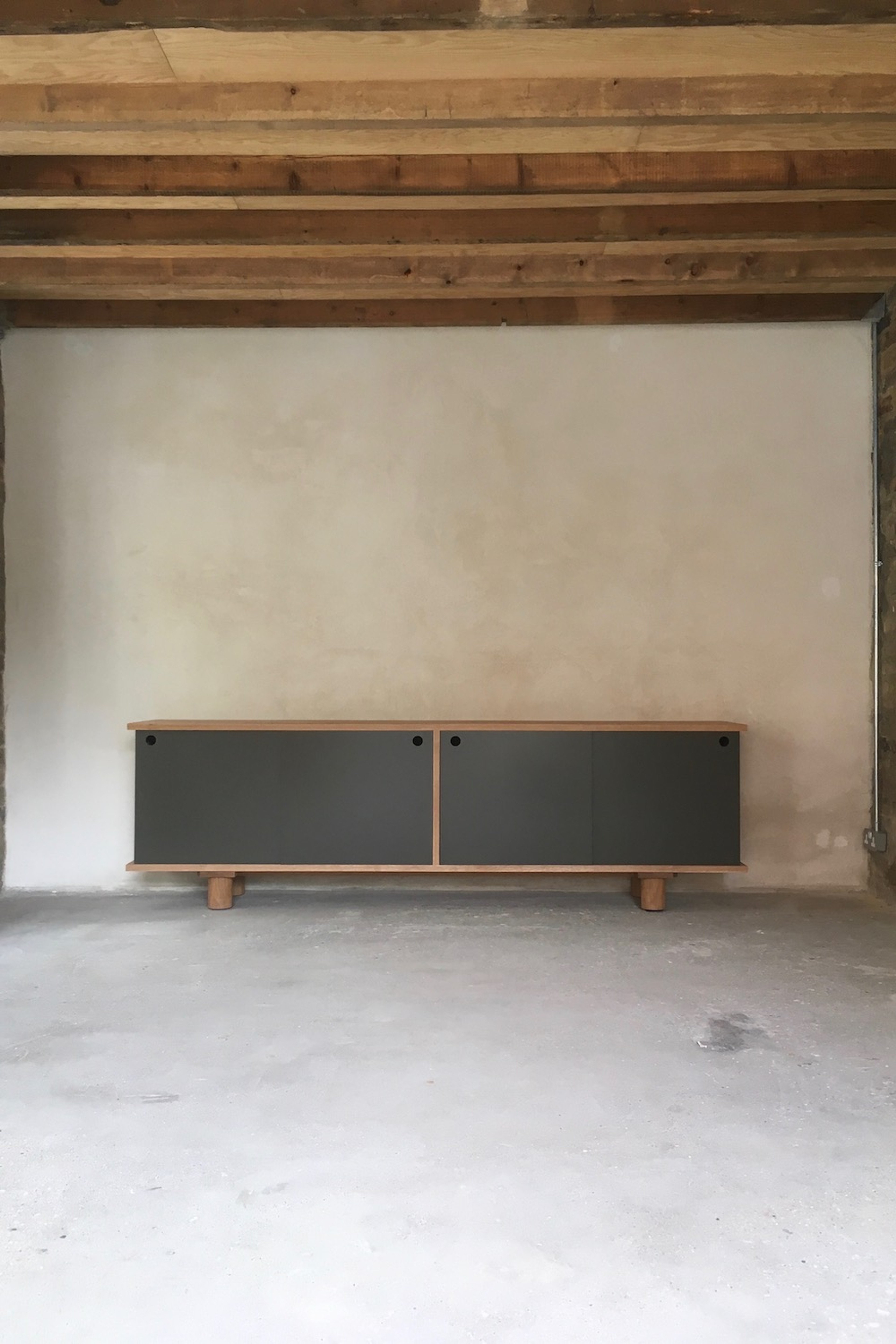 A 2.4m long sideboard with middle divide that acts as a mirror line. Each side is identical with four sliding doors opening from the centre. The sideboard was designed to fit within a purpose built dining room for a Japanese supper club, the materials colour and aesthetic are intended to compliment the room and use.
