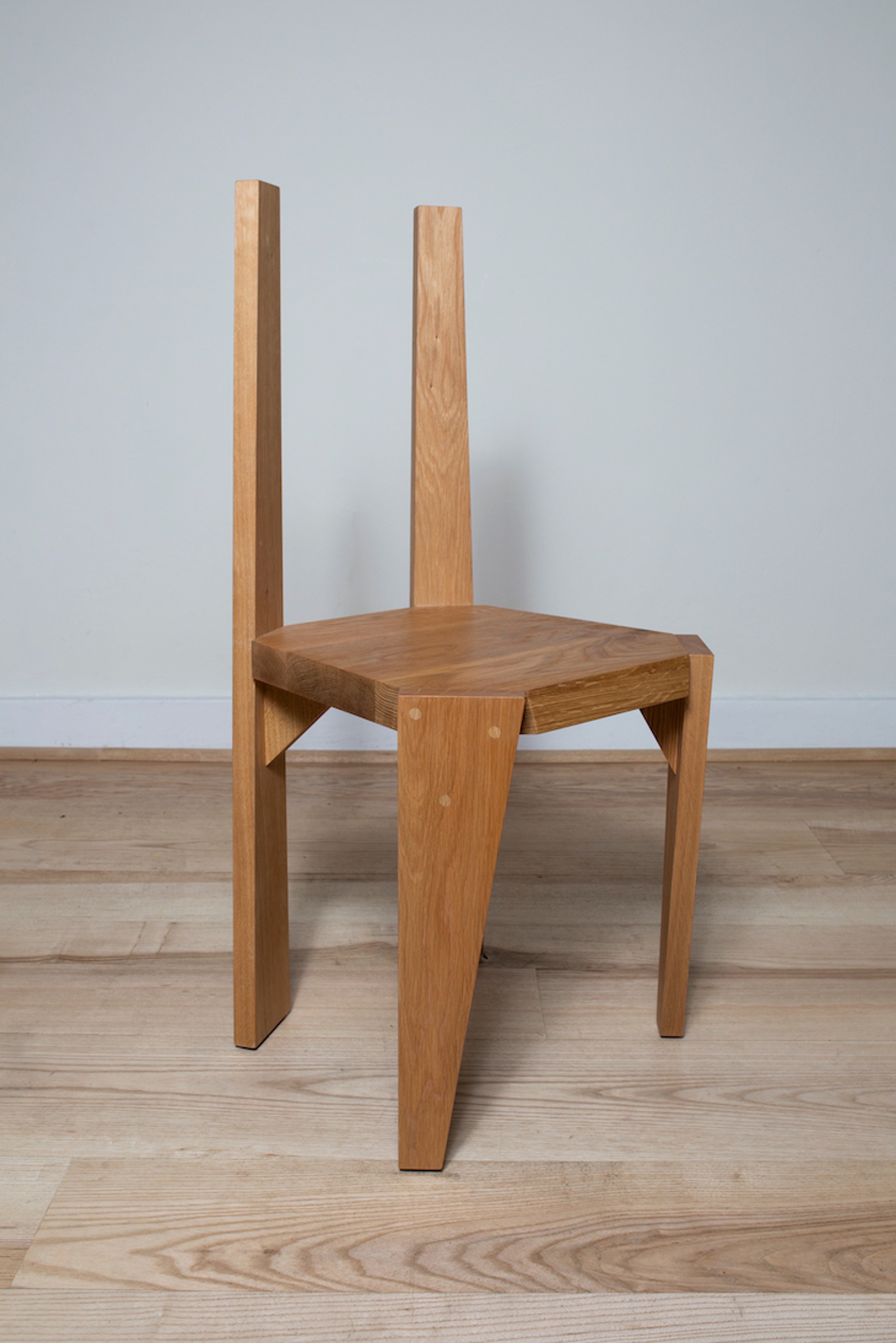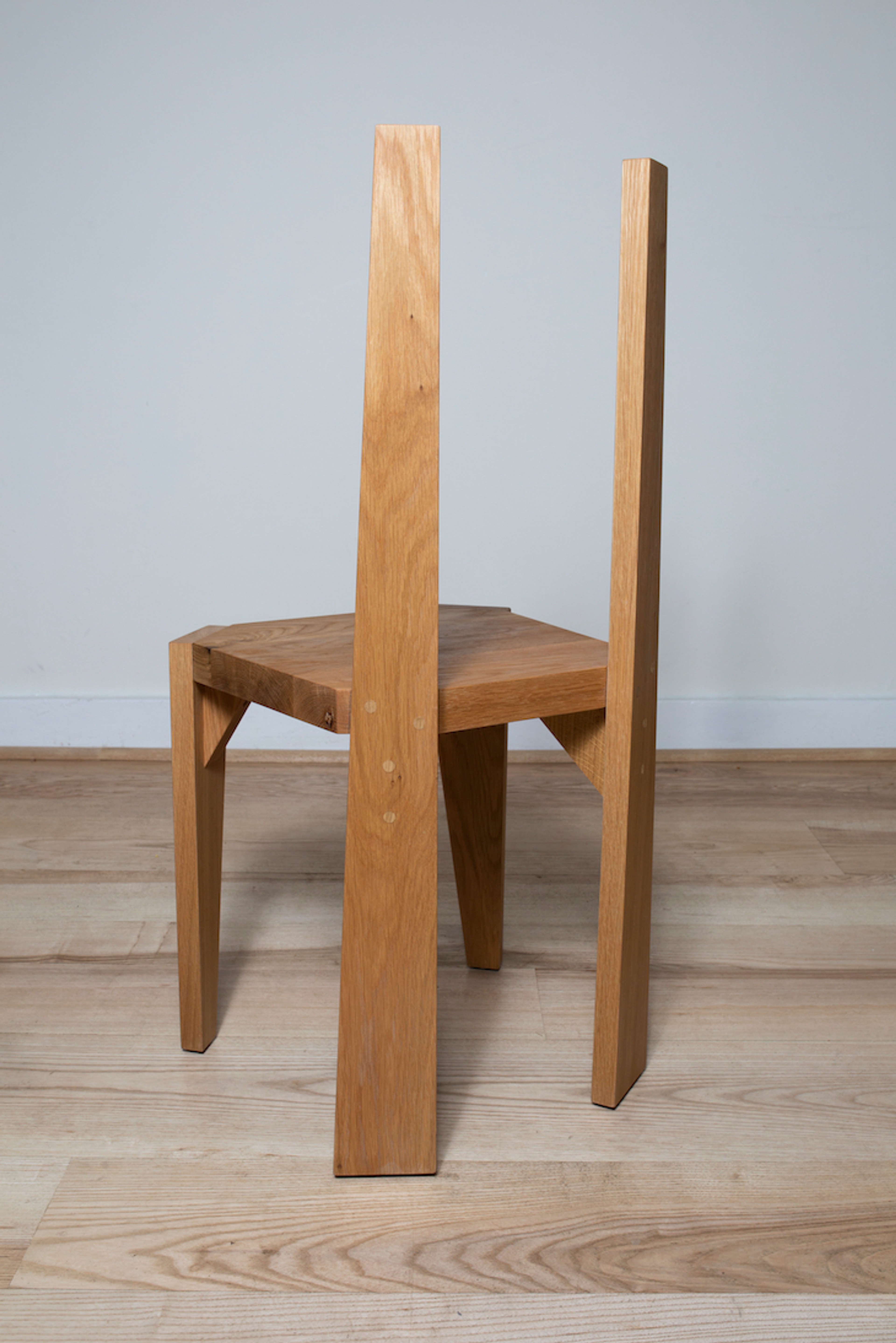 A Chair in Oak with no back. Although not joined the extended legs work surprisingly well as a backrest. Part of a series of one-off/improvised chairs for Redemption Roasters.
