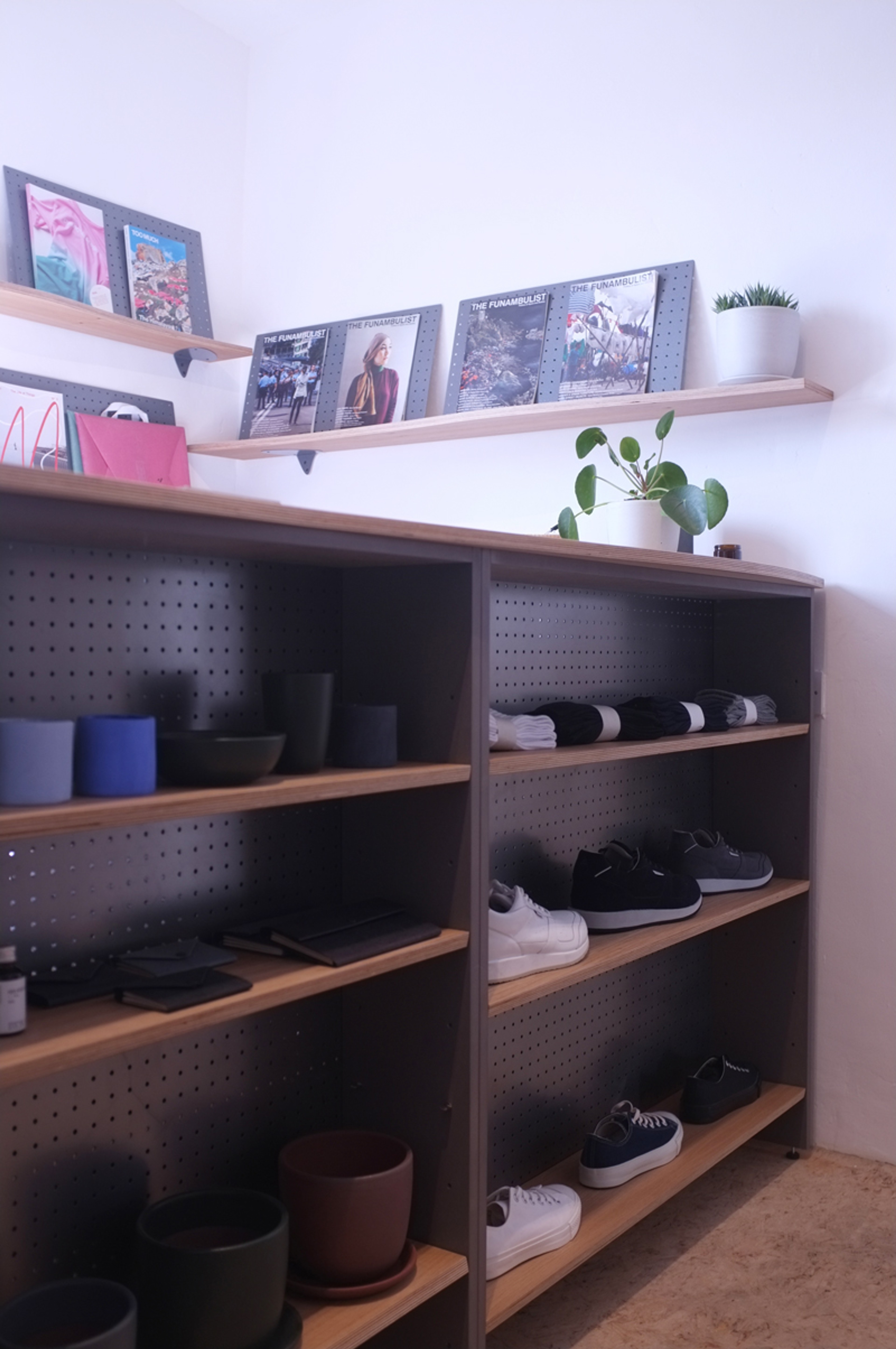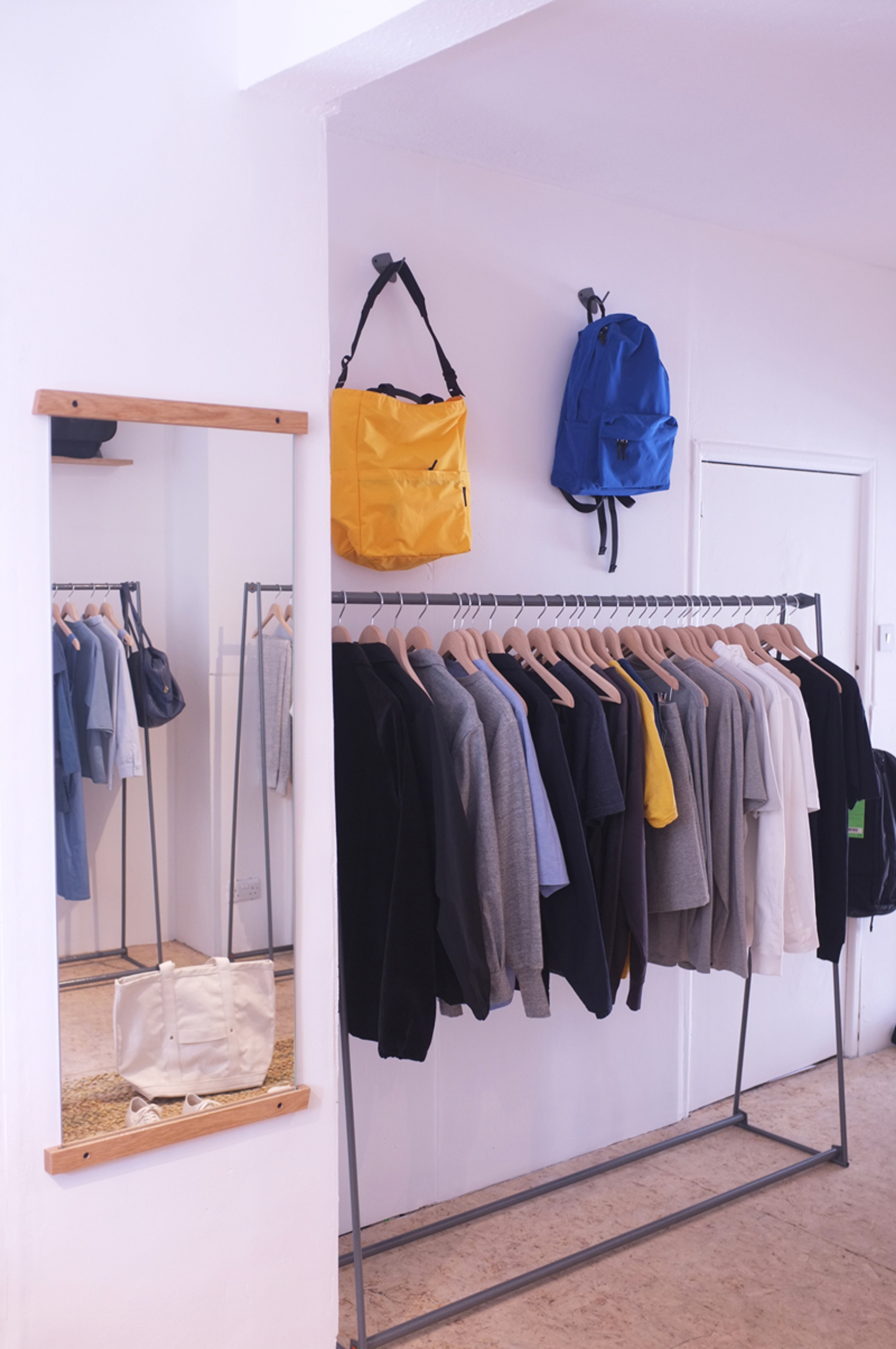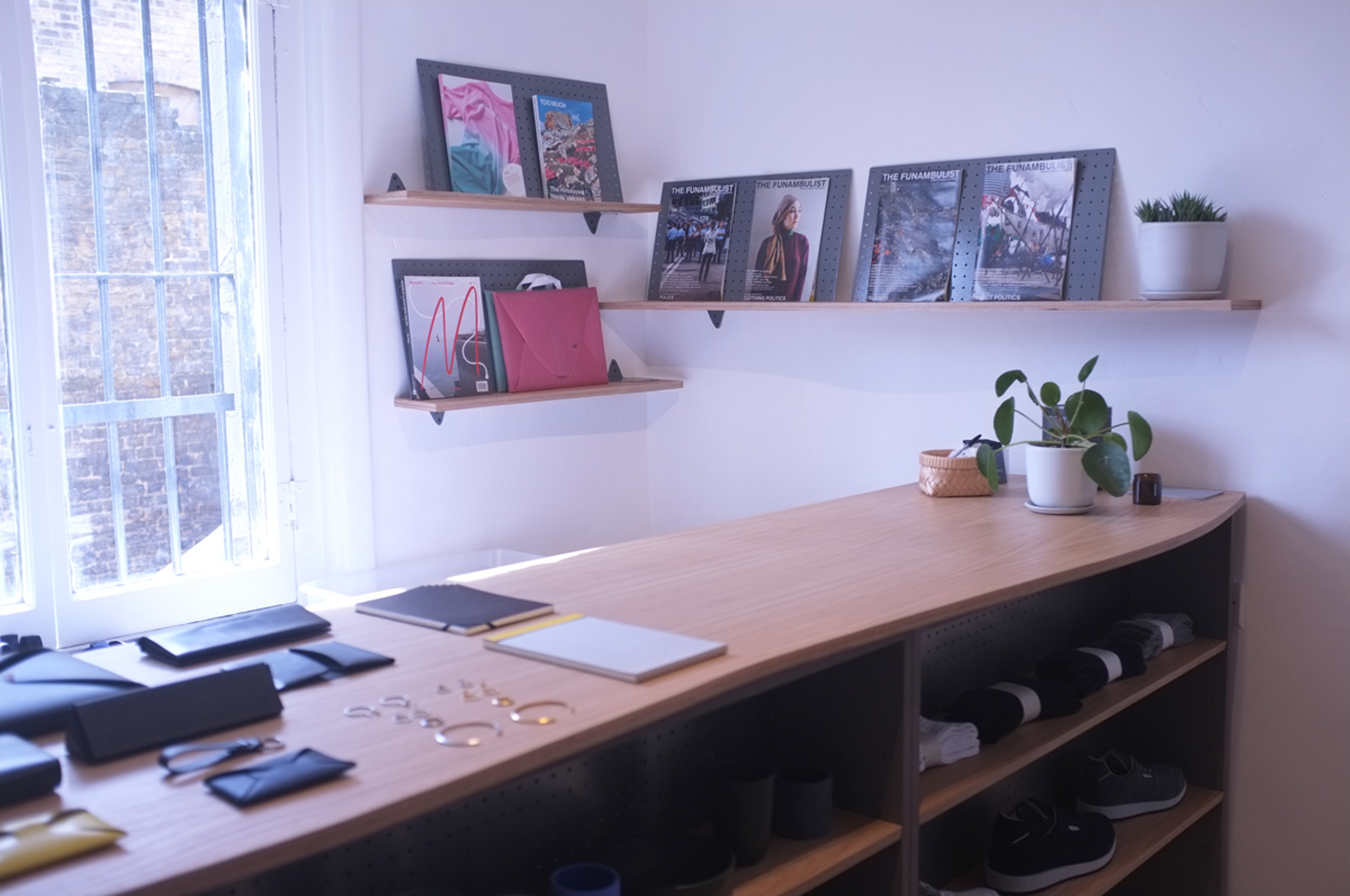 Store fixtures for Open As Usual. Rails, Counter, Hooks, Shelving, Mirror.