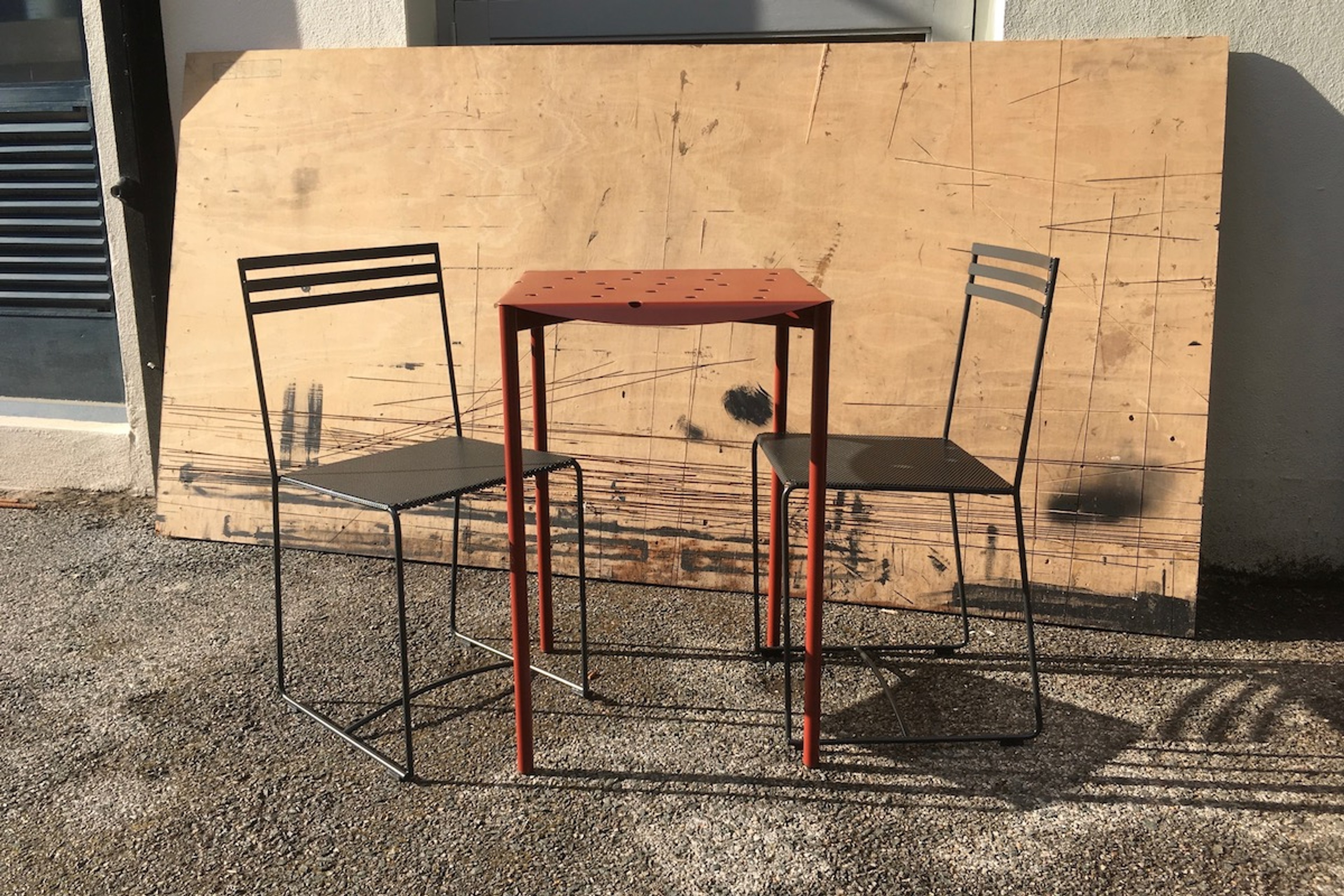 Outdoor table and chair set. Intended to be light yet robust with an all steel construction and powder coat finish.