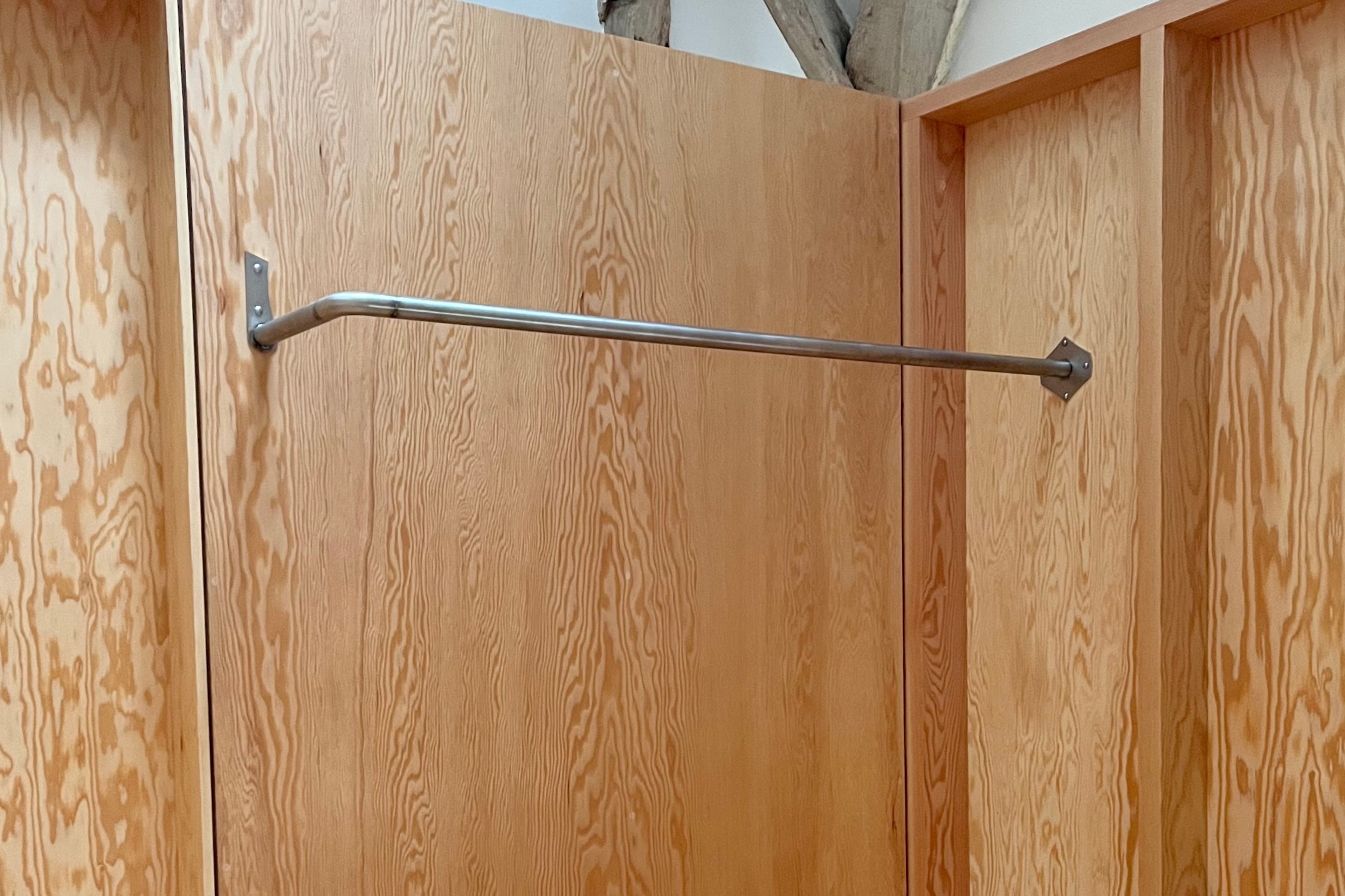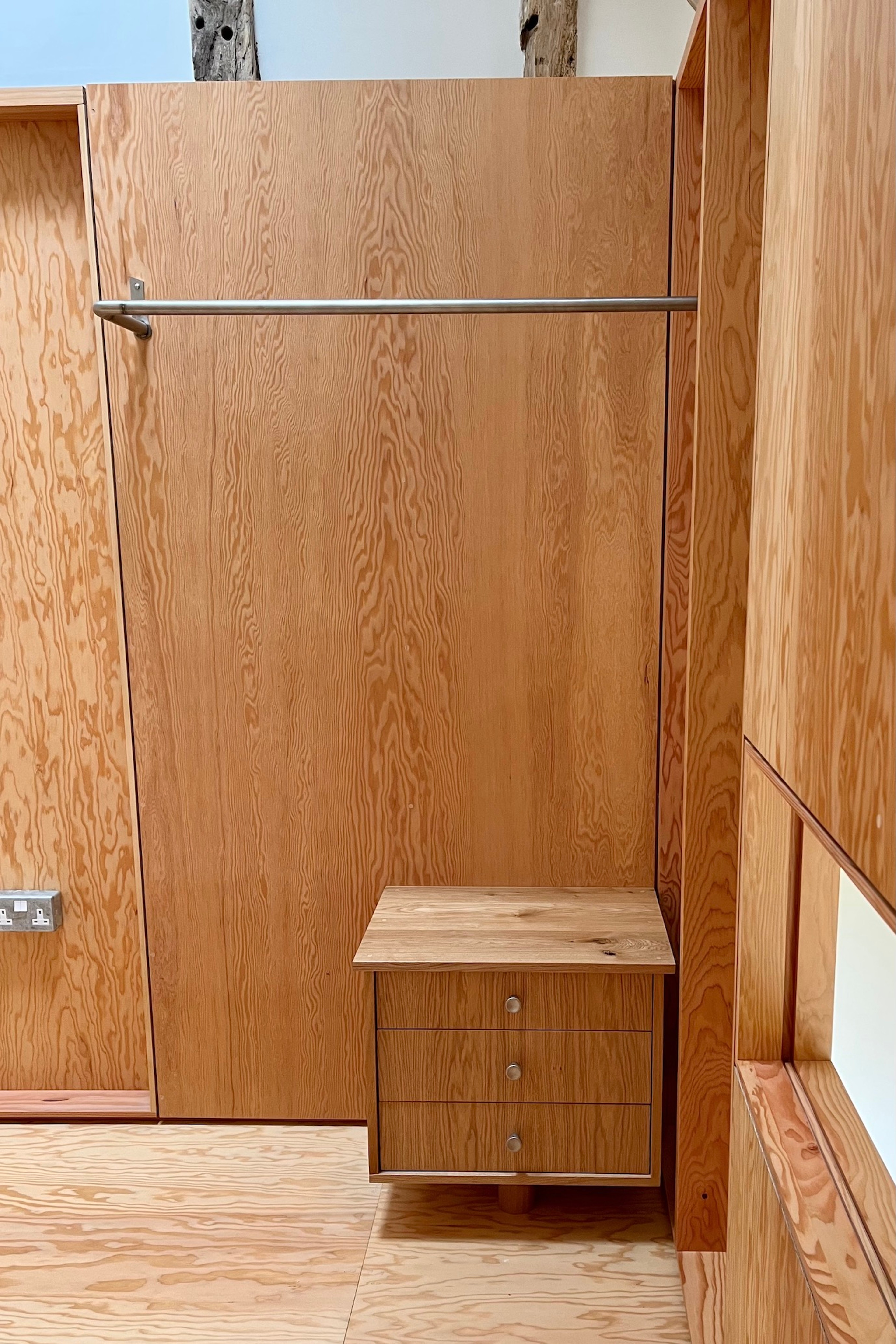 Open wardrobe designed for short stays. Part of the same project as Stair cabinet