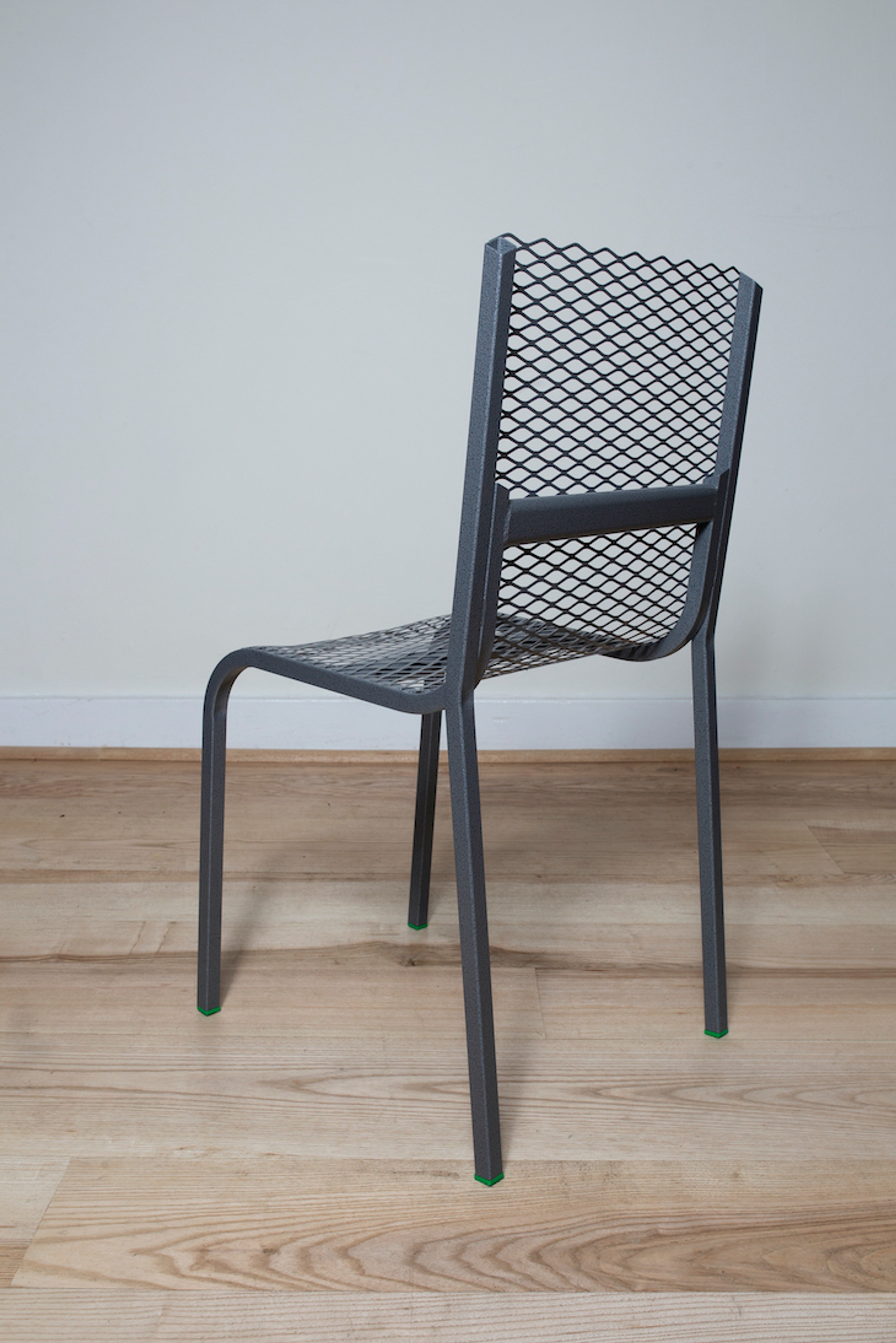 A lightweight chair in bent box section and expanded mesh. Part of a series of one-off/improvised chairs for Redemption Roasters.