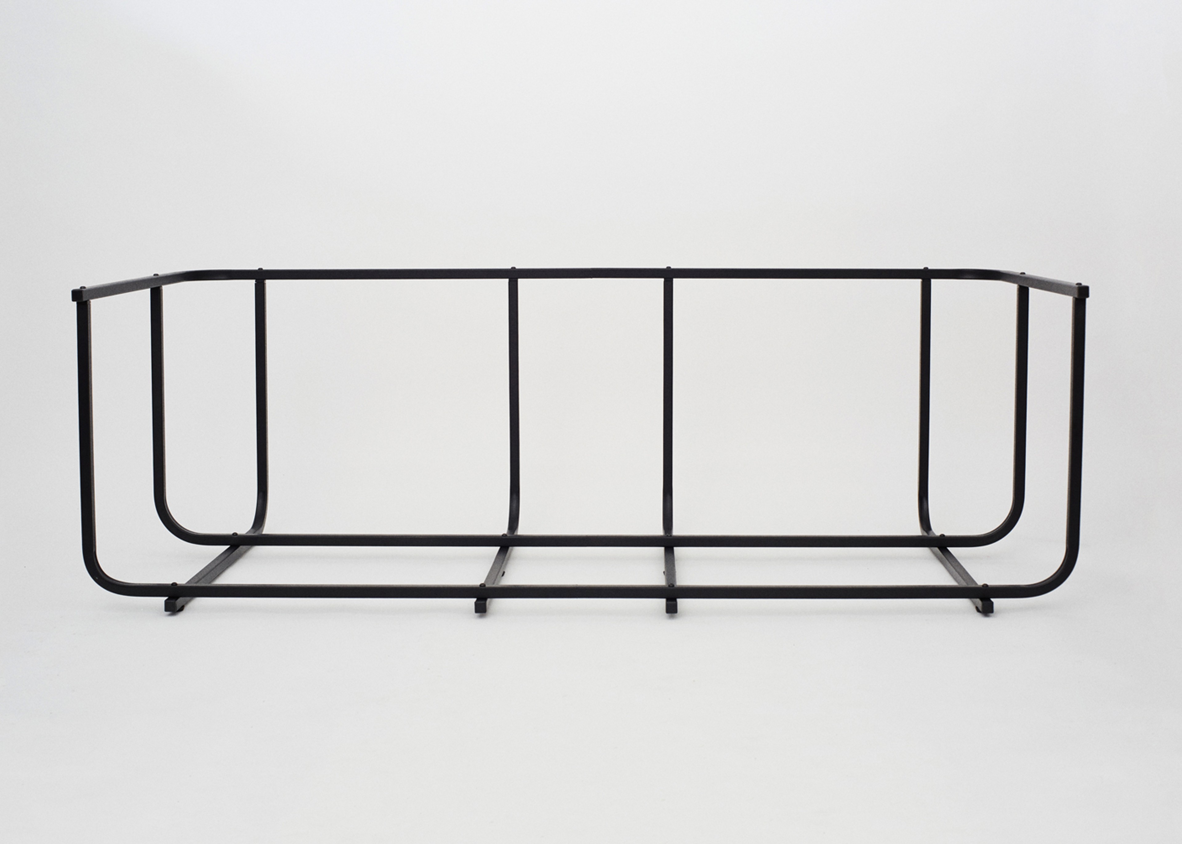 A sofa designed for my step son Nicholas, his only requests – It has to be comfy, Seat himself and two friends and he was to choose the fabric (to match his green velvet Vans). From there I decided to keep all elements beyond the upholstery to a minimum, all that seemed to be needed was a simple frame to keep the cushions together. The frame consists of two U shapes and four angles bent from 3/4 inch ERW box section by my Dad on a machine he uses daily in his workshop. The frame requires no welding and little finishing, bolting together allowing for an easy to assemble and less labour intensive construction. The overall idea being to create an economical sofa that can be knocked down and reassembled multiple times with the hope that Nicholas can take it with wherever life takes him.