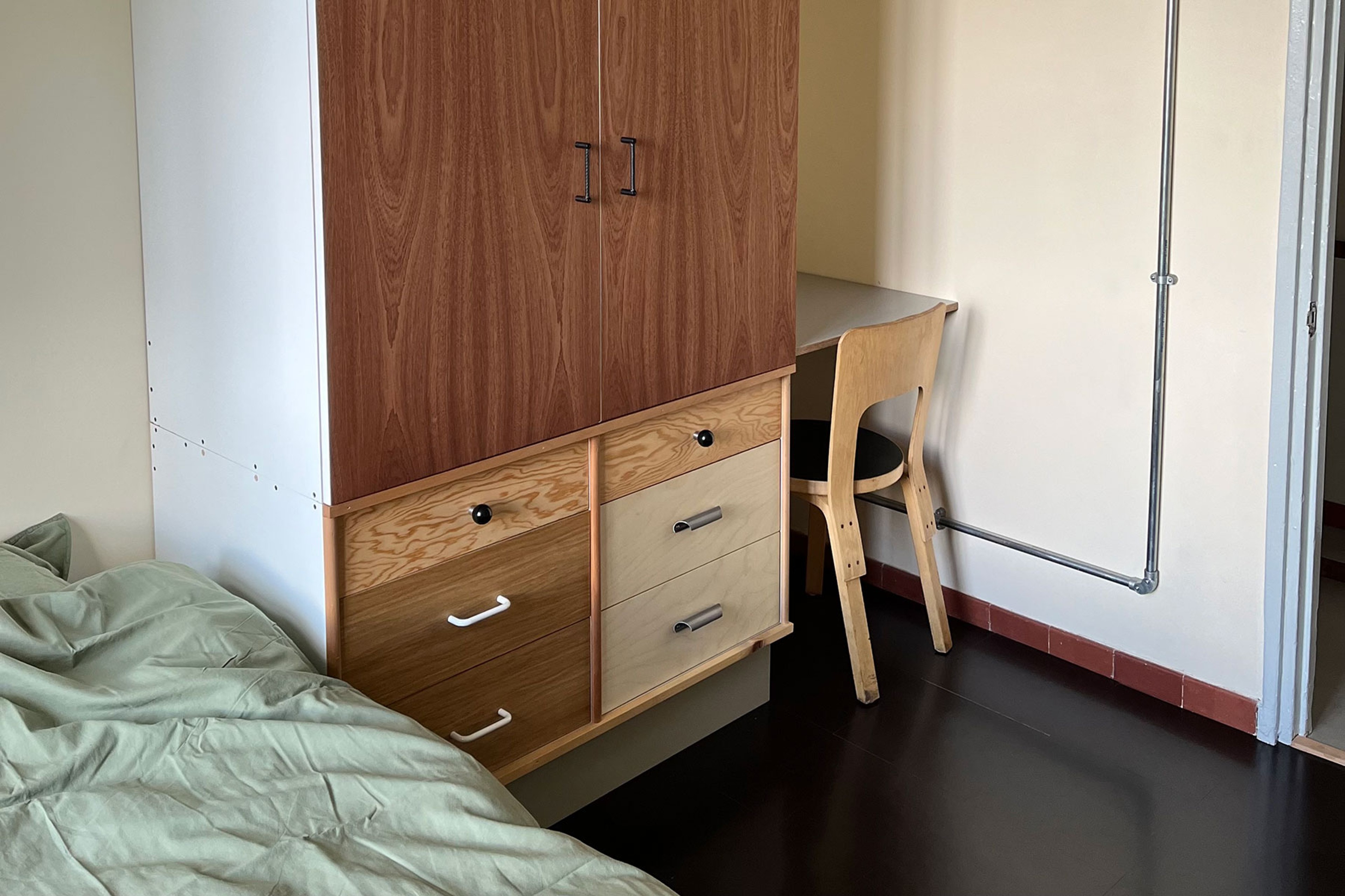 Bed and surrounding cupboards using materials mainly from our stock. Incorporating a clothes rail, desk, bedside cabinet, doored storage and bed.