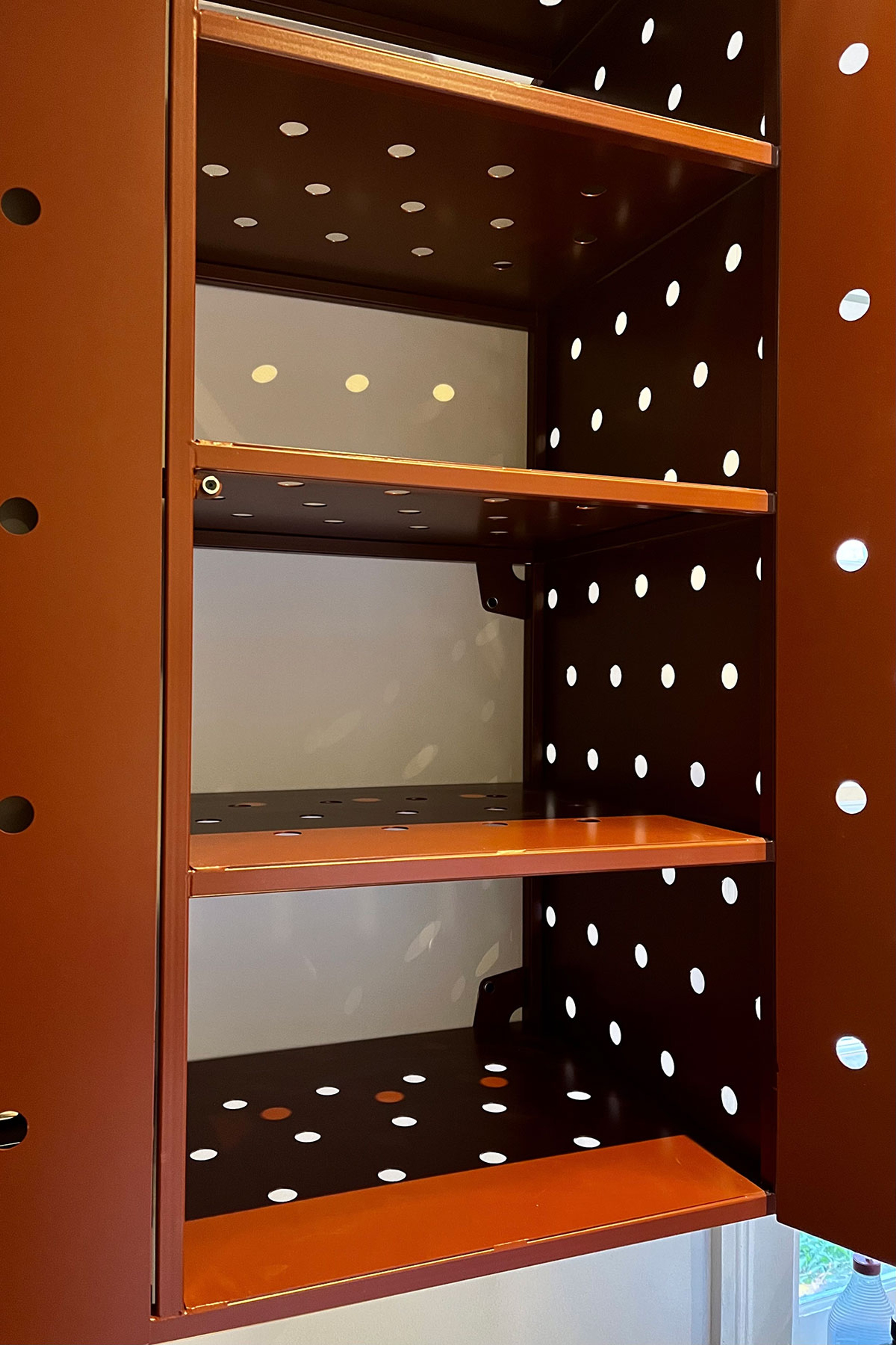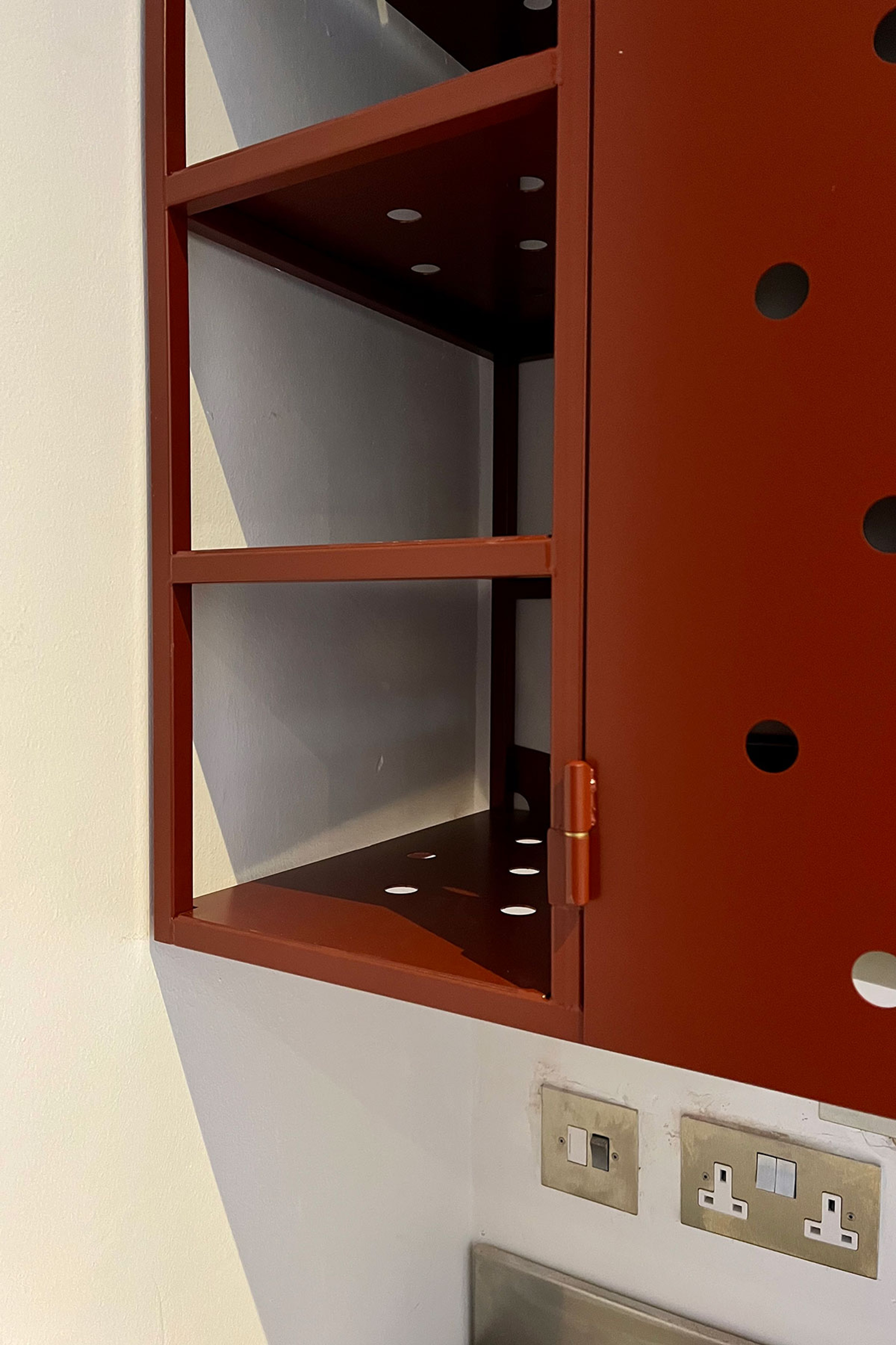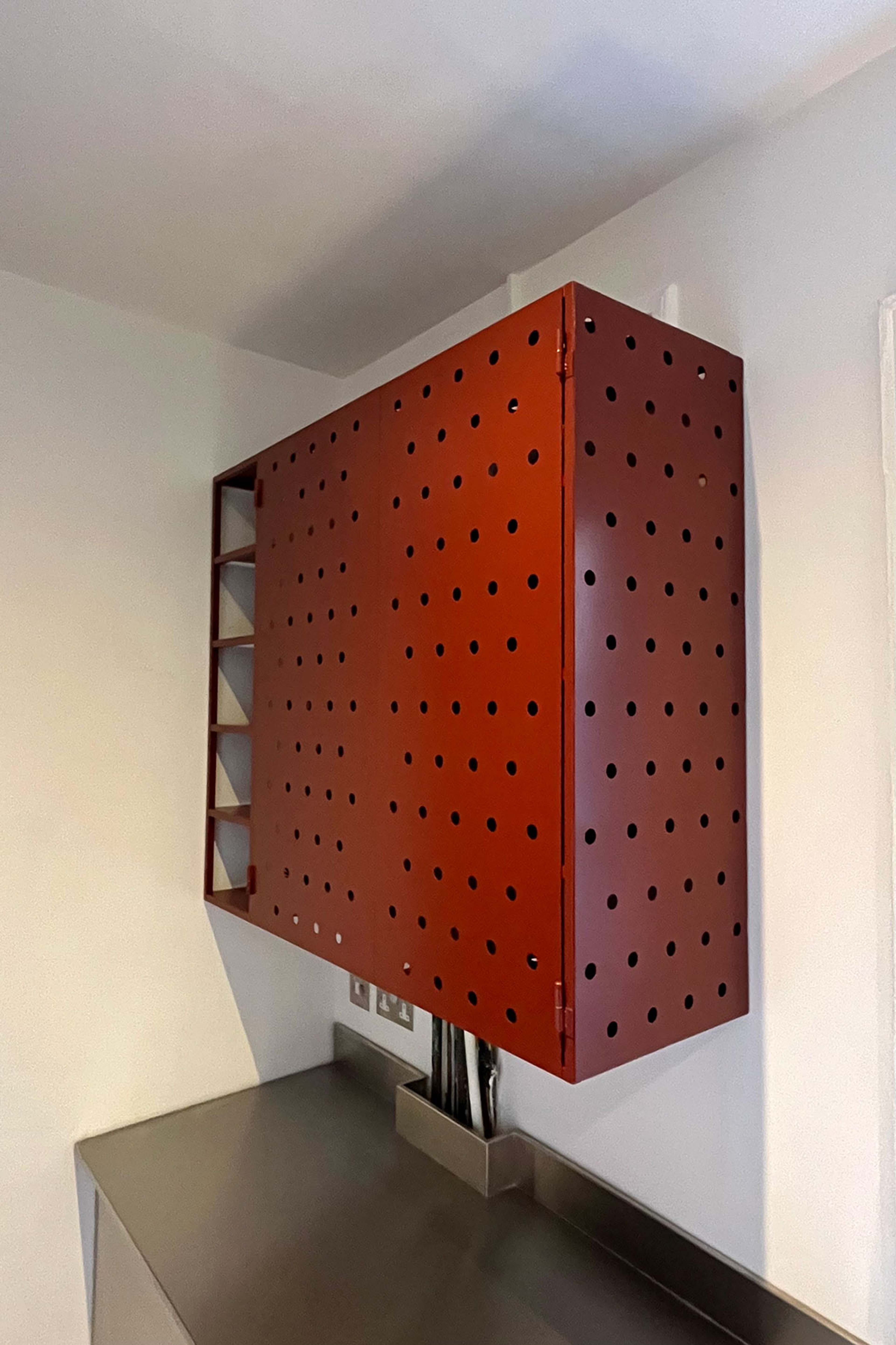 All steel cabinet designed to encase a boiler. Split into three compartments, open shelves to the left, boiler centre, covered shelves right. The doors are hung on lift off hinges and secure with a magnetic catch.