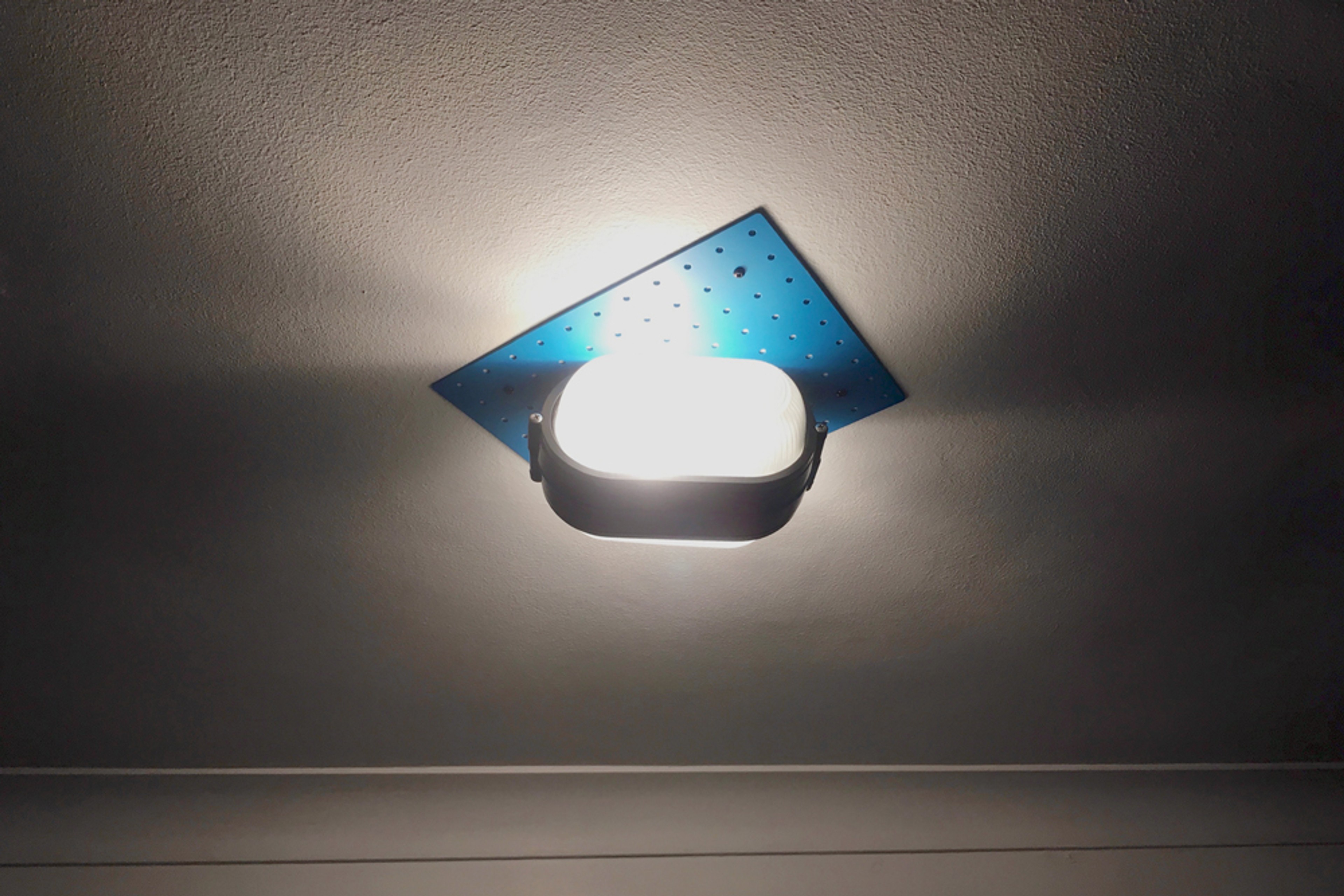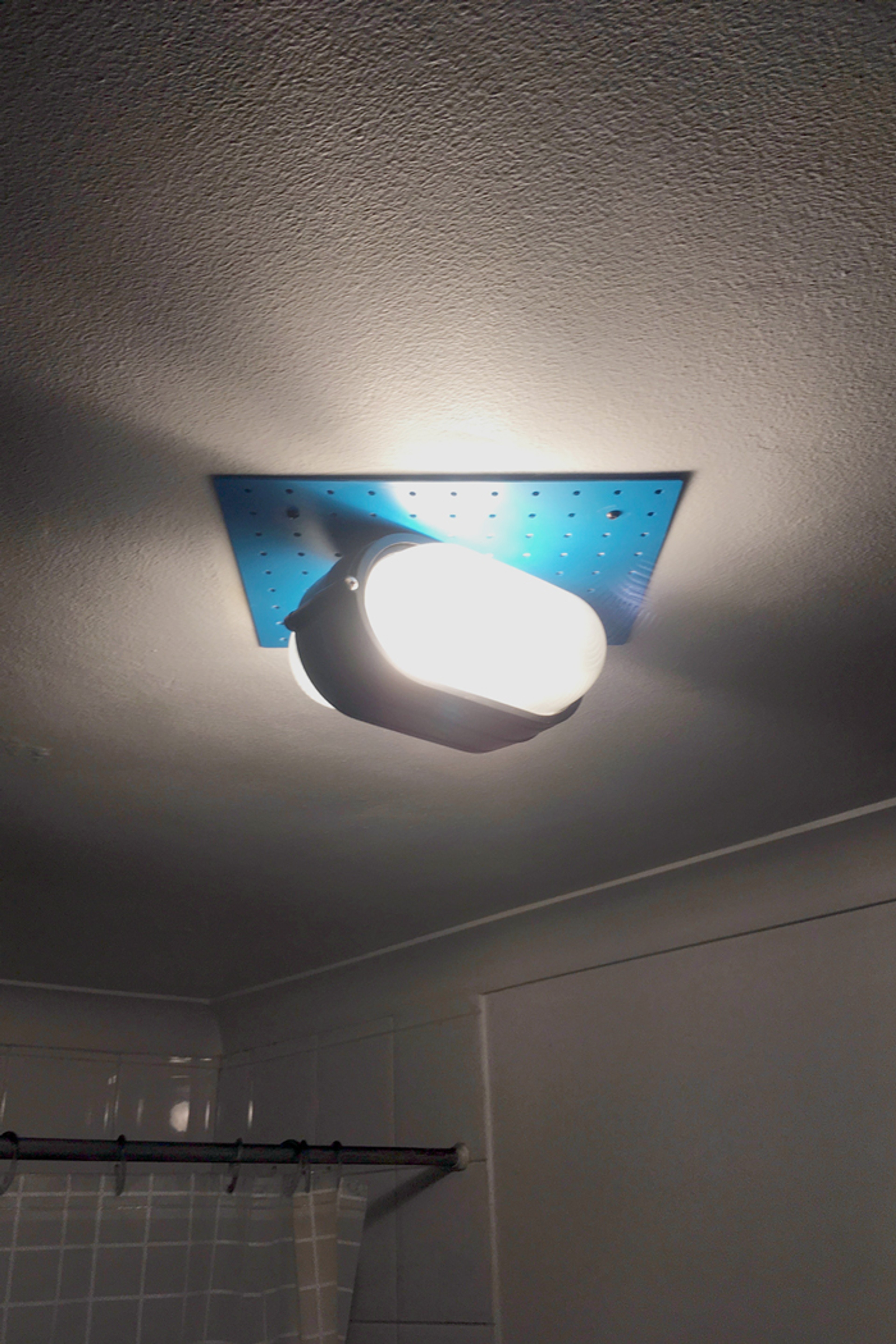 A ceiling lamp designed and made in a hurry to replace a broken bathroom lamp. Using ready made Hardware store outdoor Bulkhead lamps that are customised and fitted to a perforated steel mounting plate.
