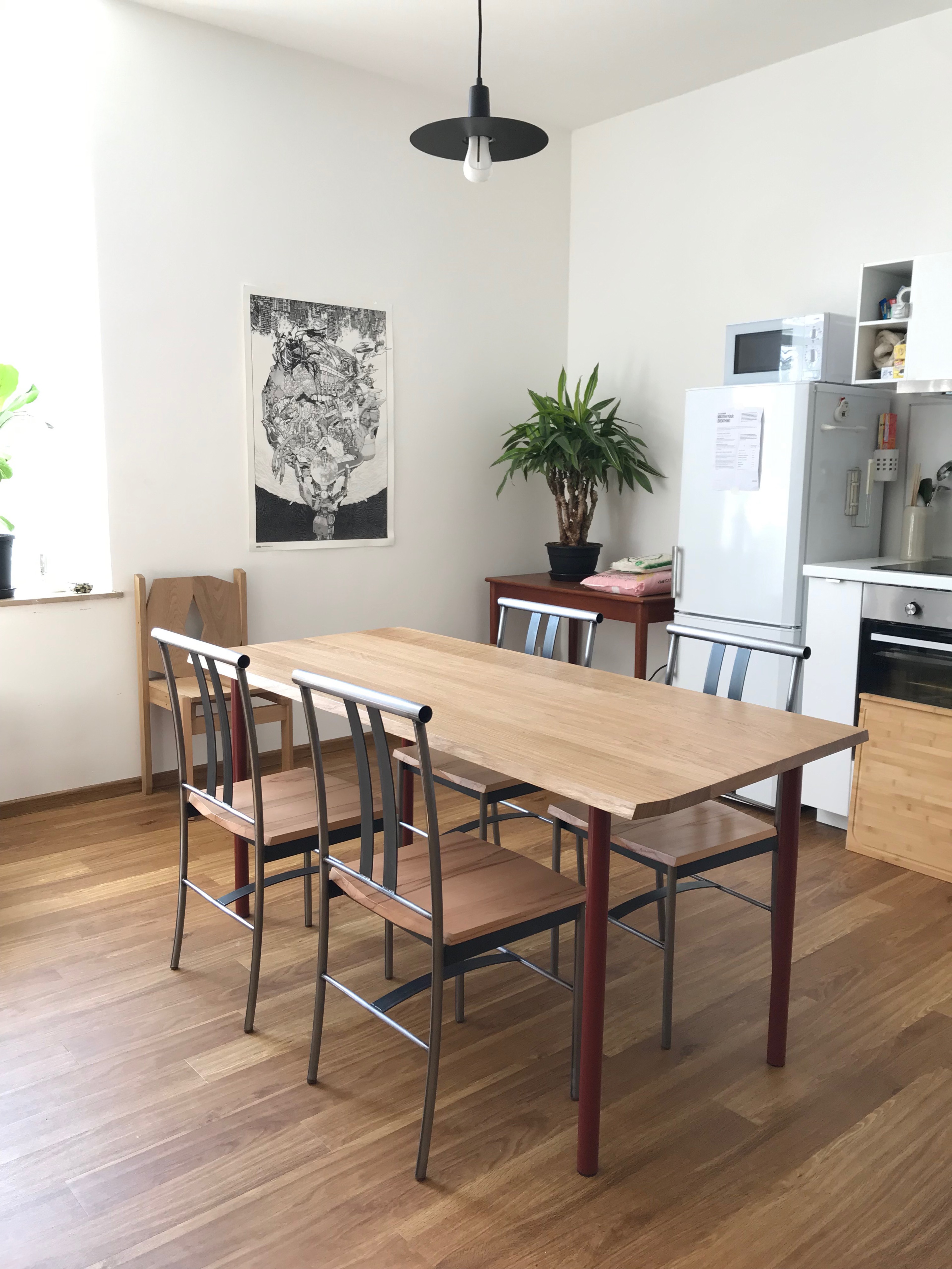 Dining set. Steel legs with Solid wood tops. The table flat packs, with legs demounting from the main structure.