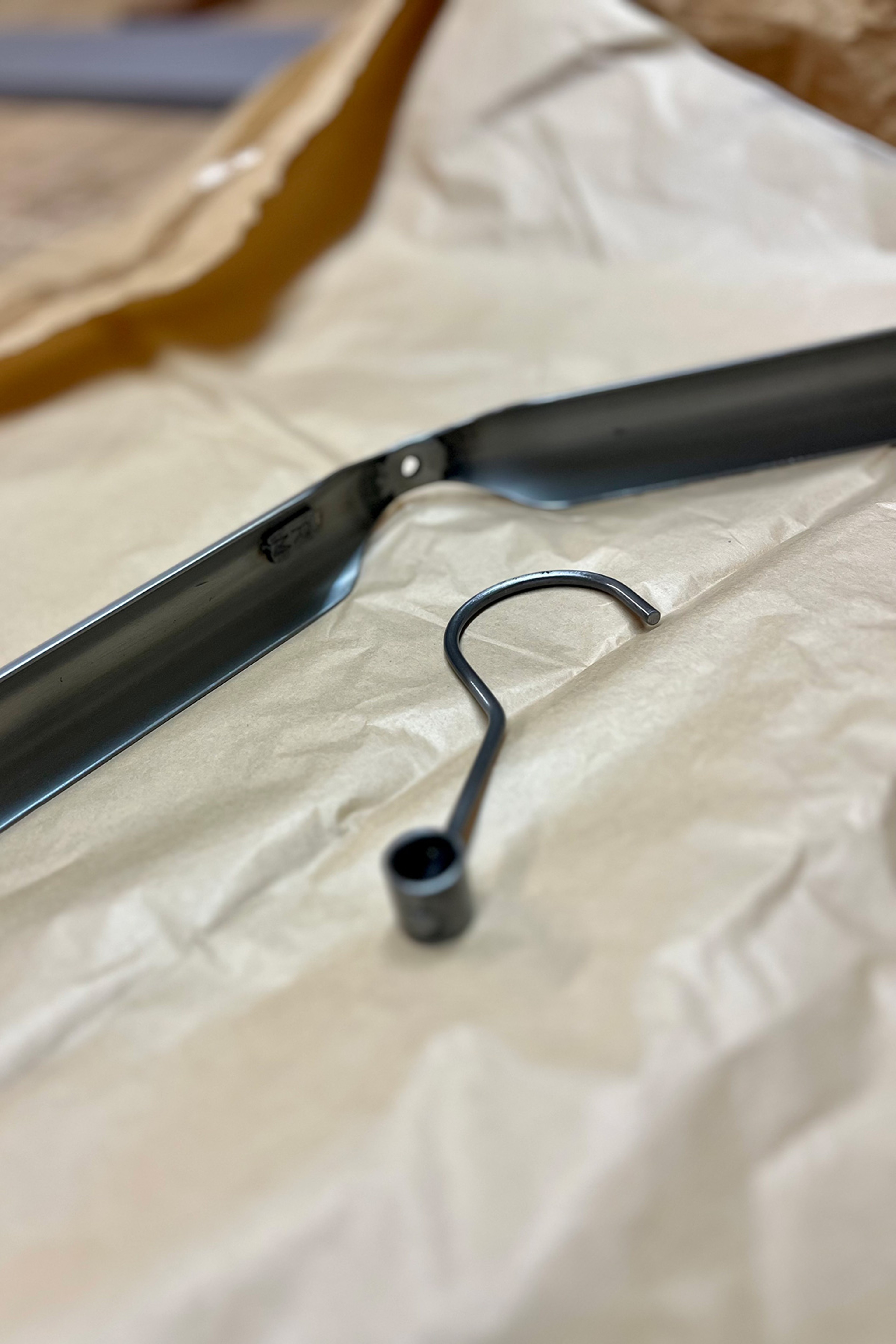Clothes hanger made with a section of 30mm diameter ERW tube cut and formed by hand.