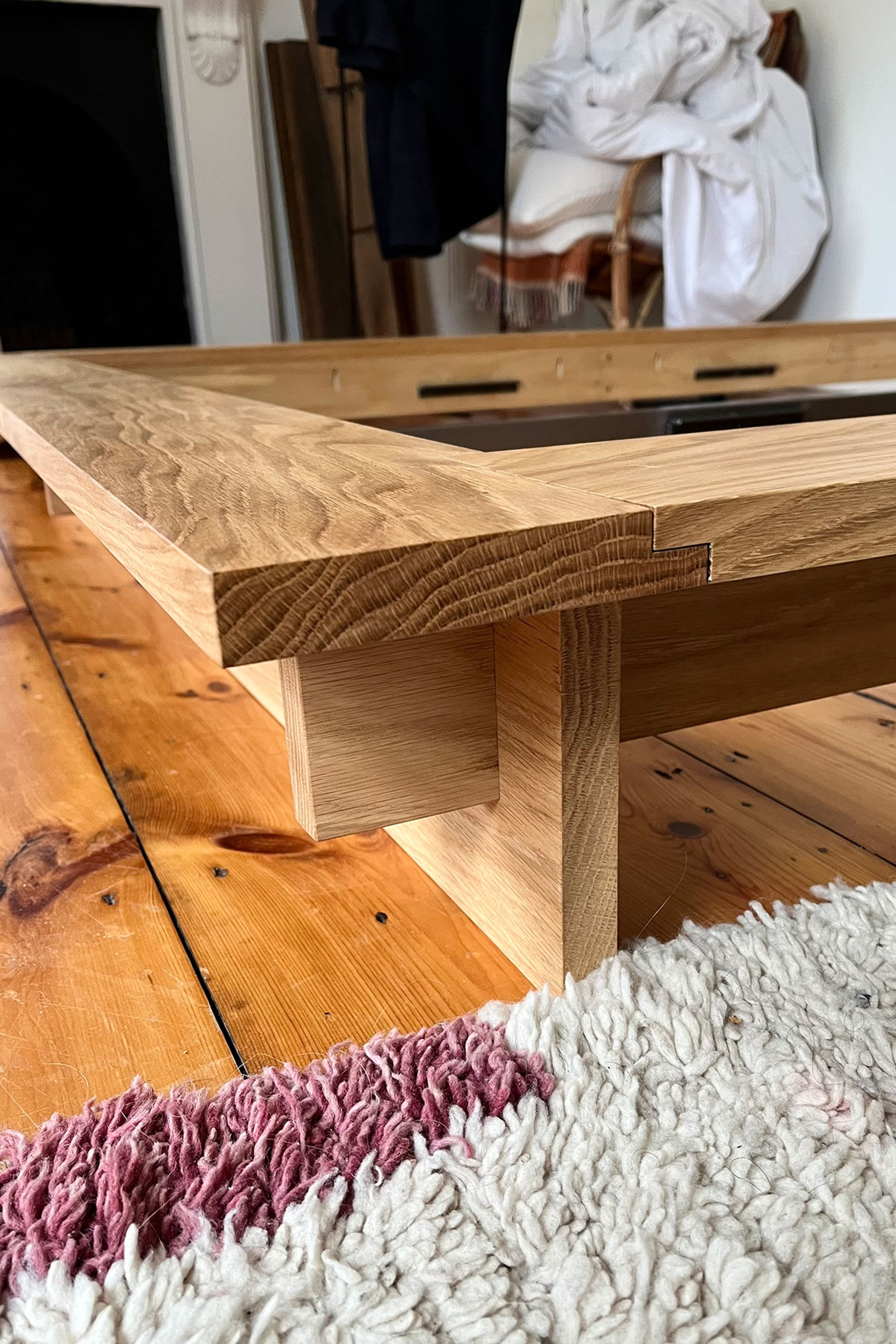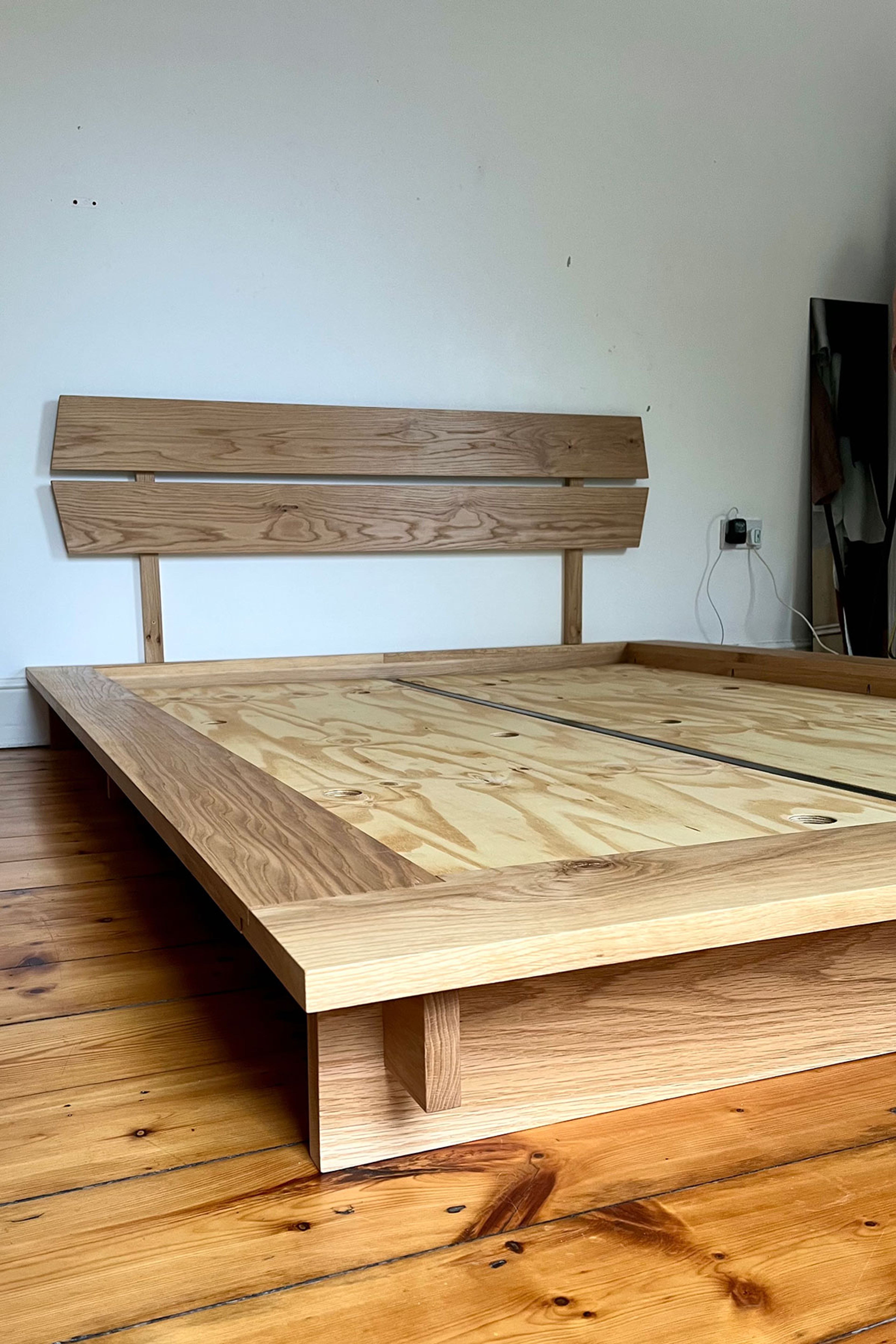 A low King size bed in Oak. The structure is bolted to allow easy assembly/dis-assembly when needed.