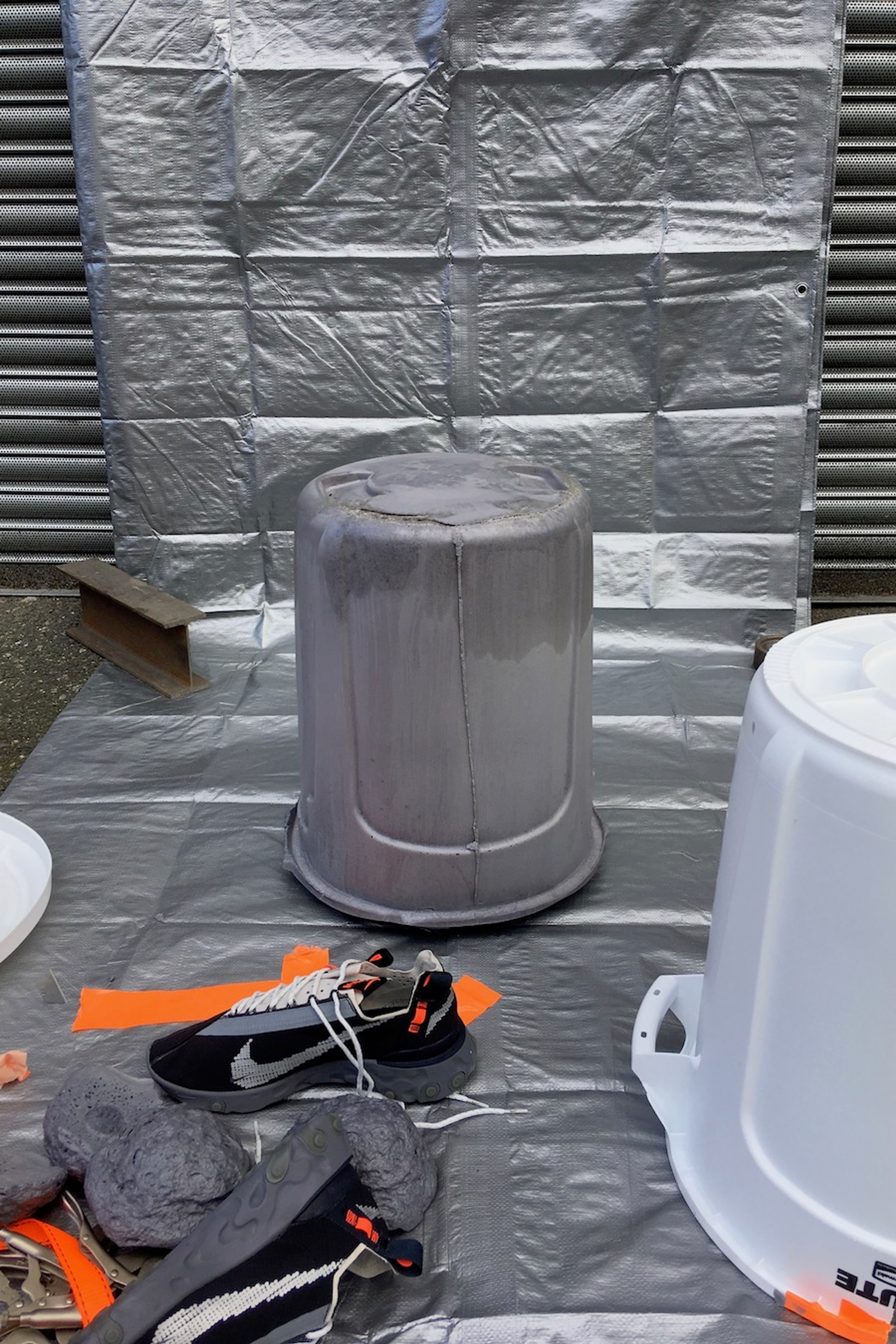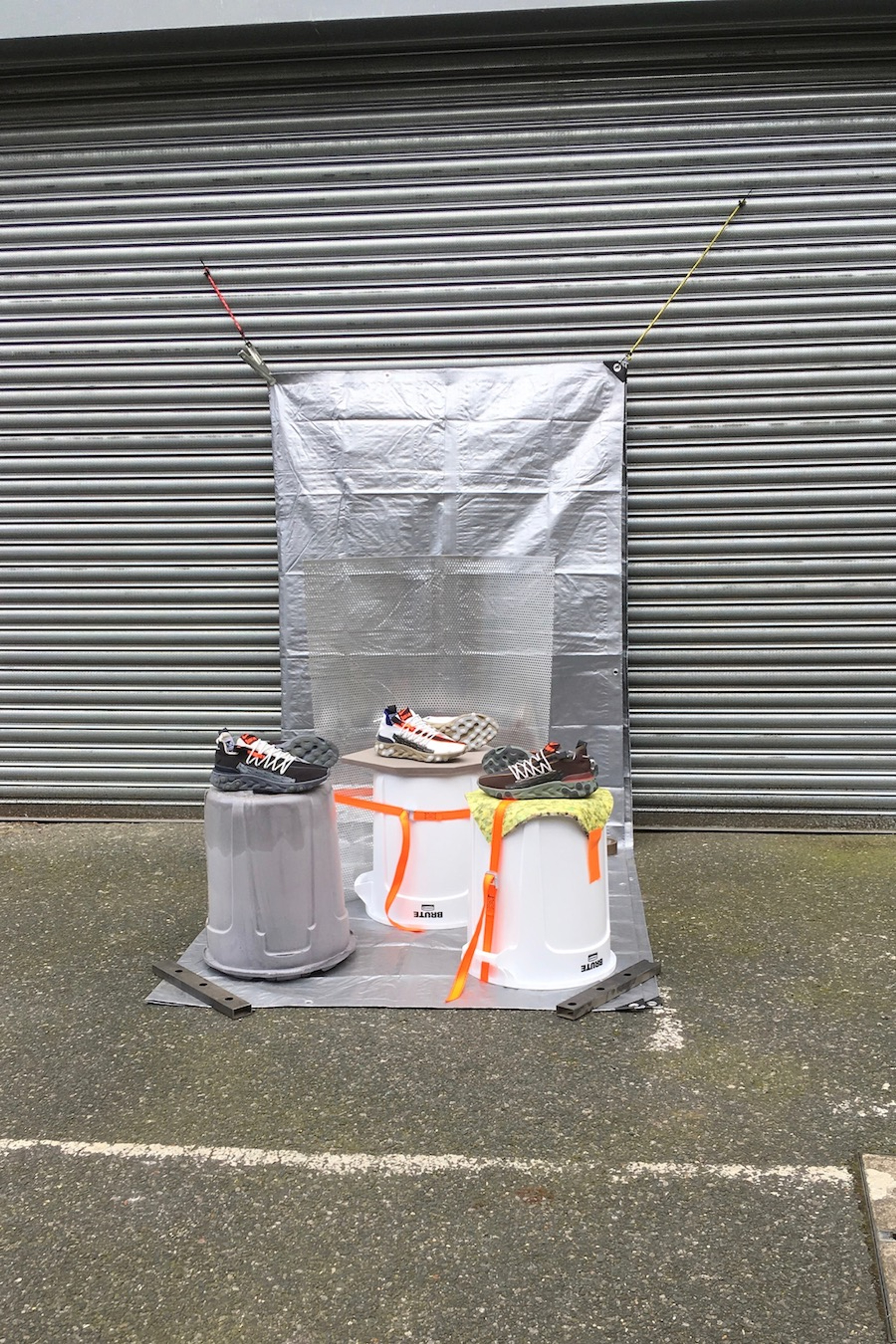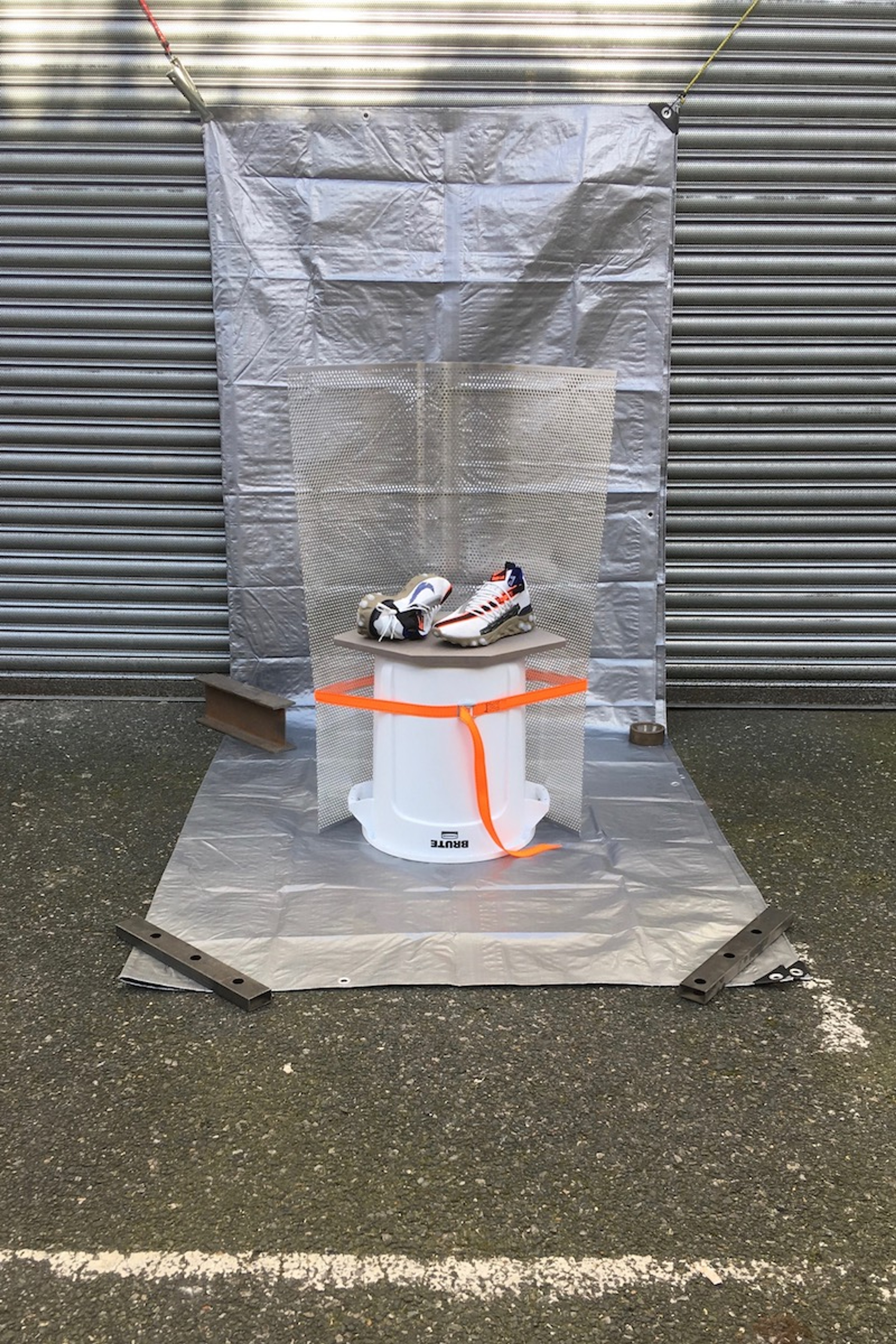 Improvised seating solutions using Brute containers. Intended as a direct response to the written manifesto of Nike ISPA. Three stools – One simply flipped with foam seat added, the second with perforated aluminium backrest and the third using the Brute itself as a mould to produce a soft flexible foam stool. The stools are intended as improvised three-dimensional sketches using readi