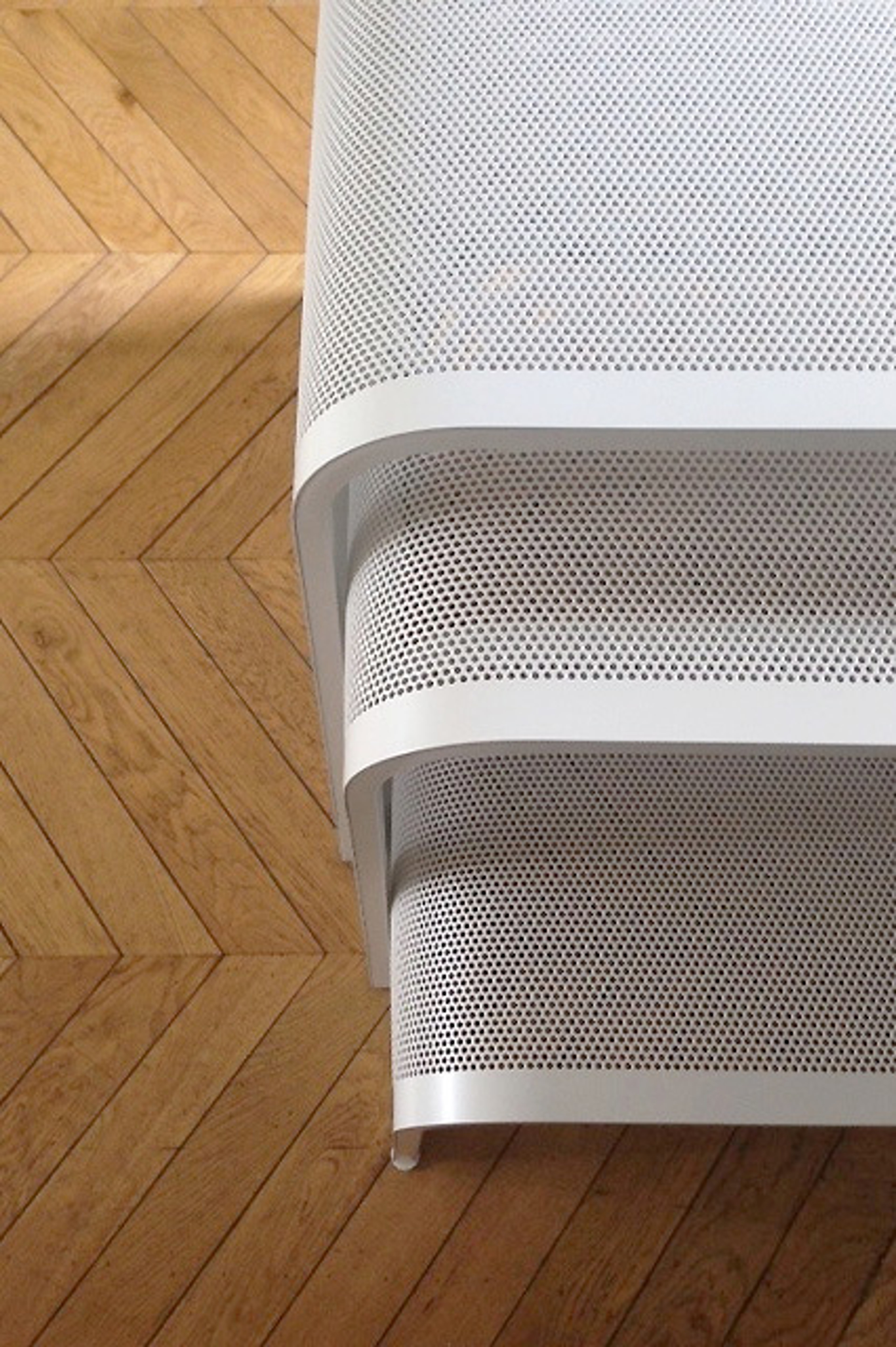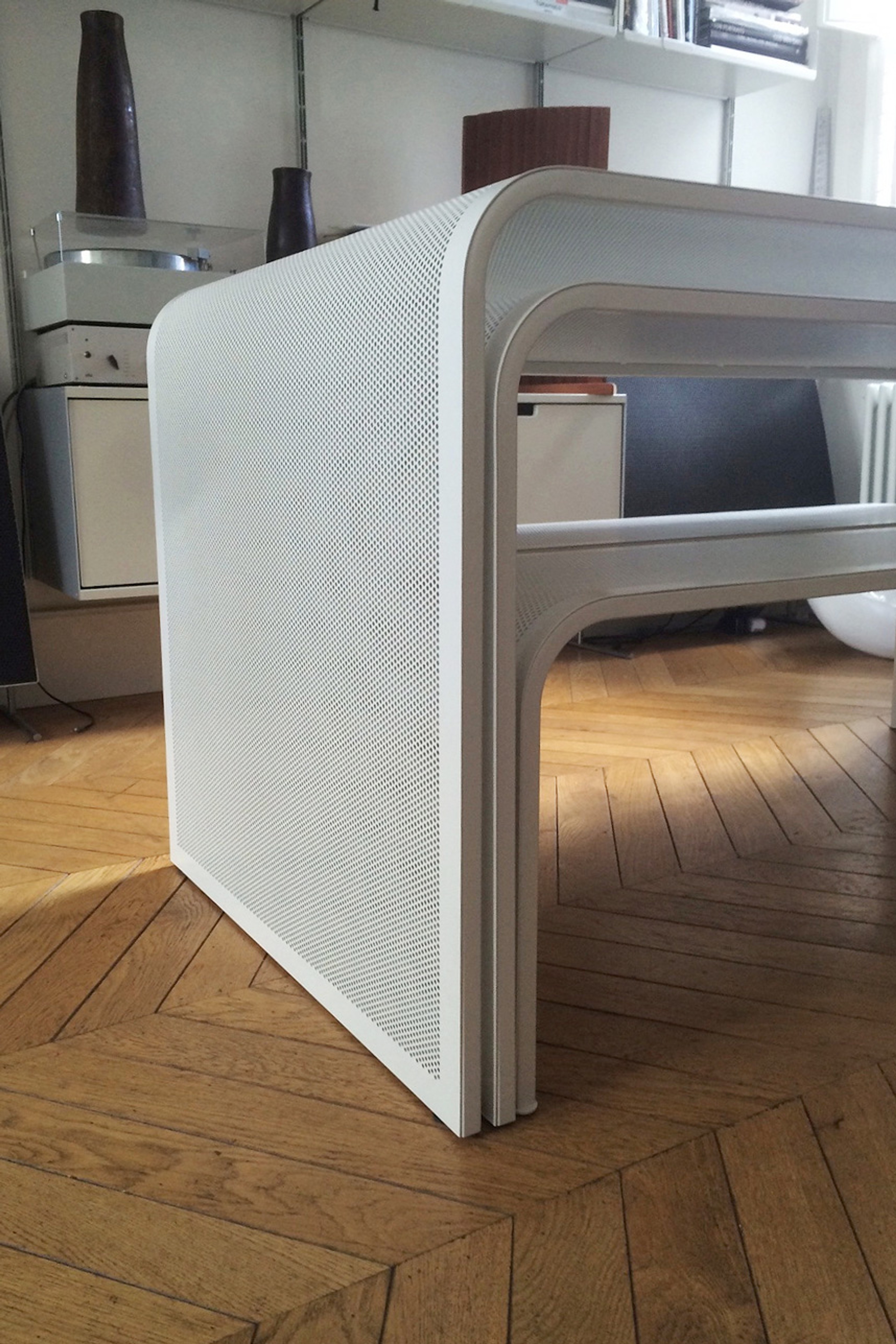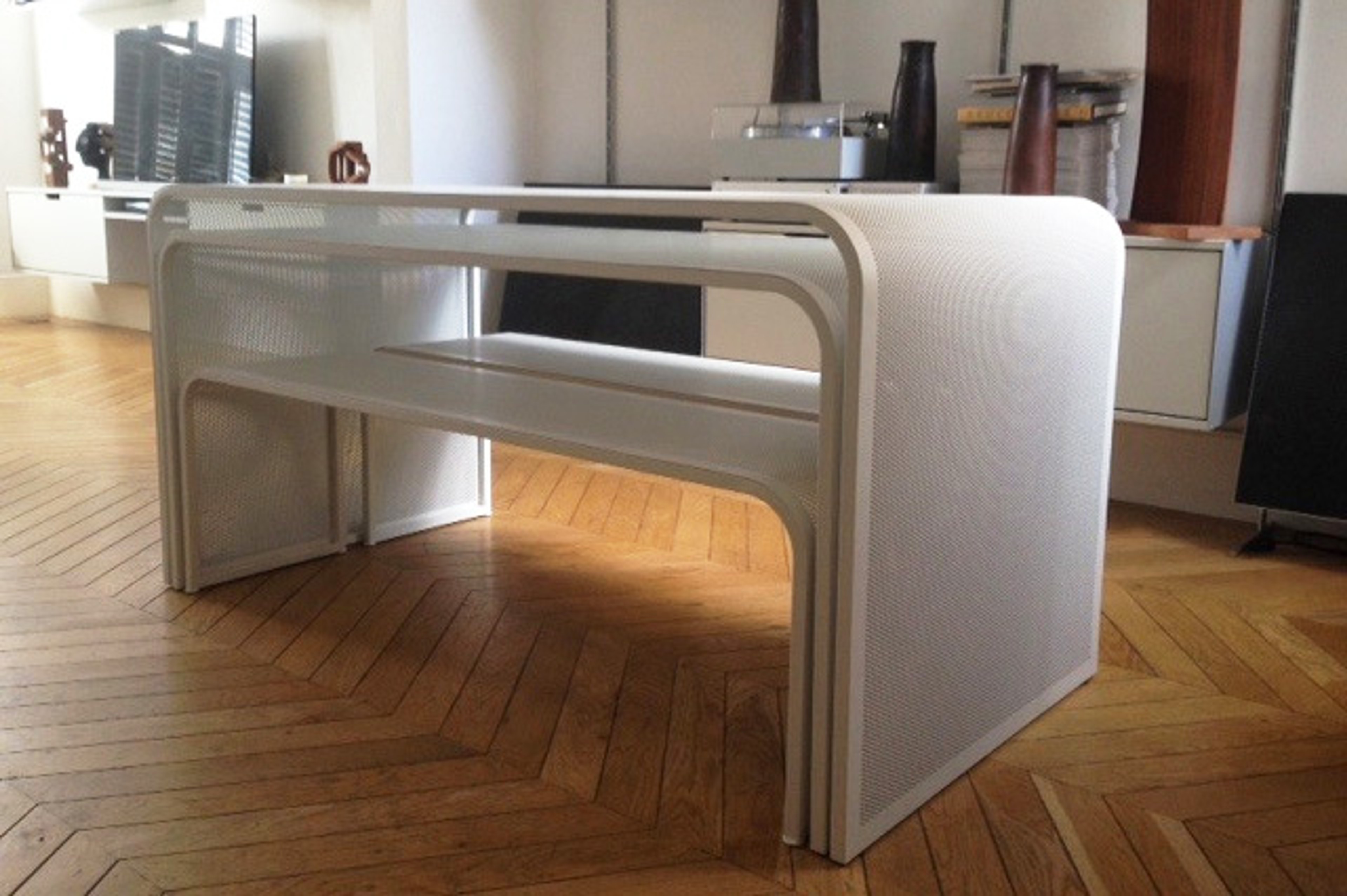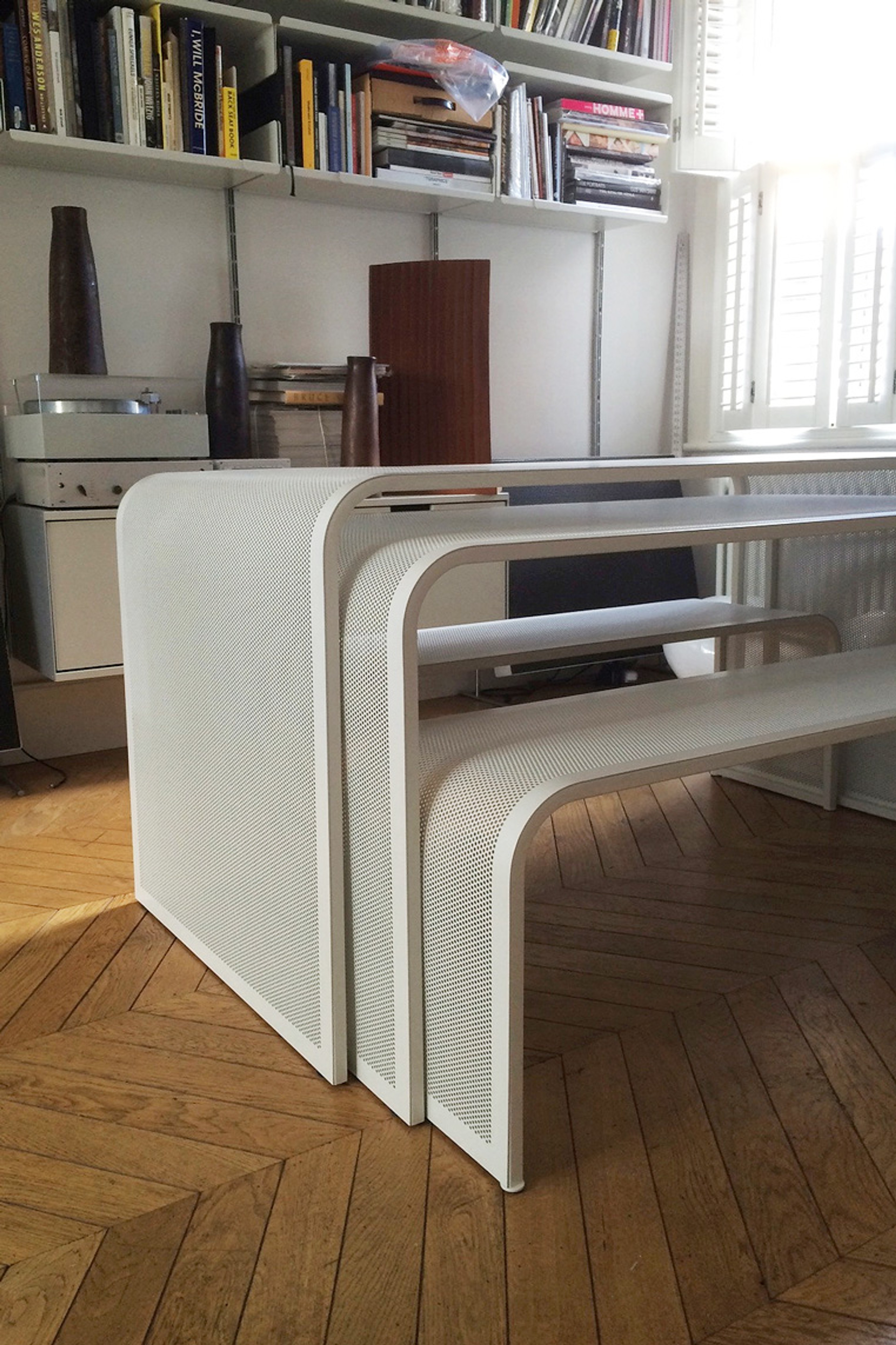A nesting dining set, two tables with benches. Designed to accompany and compliment an extensive Vitsoe/Rams collection.