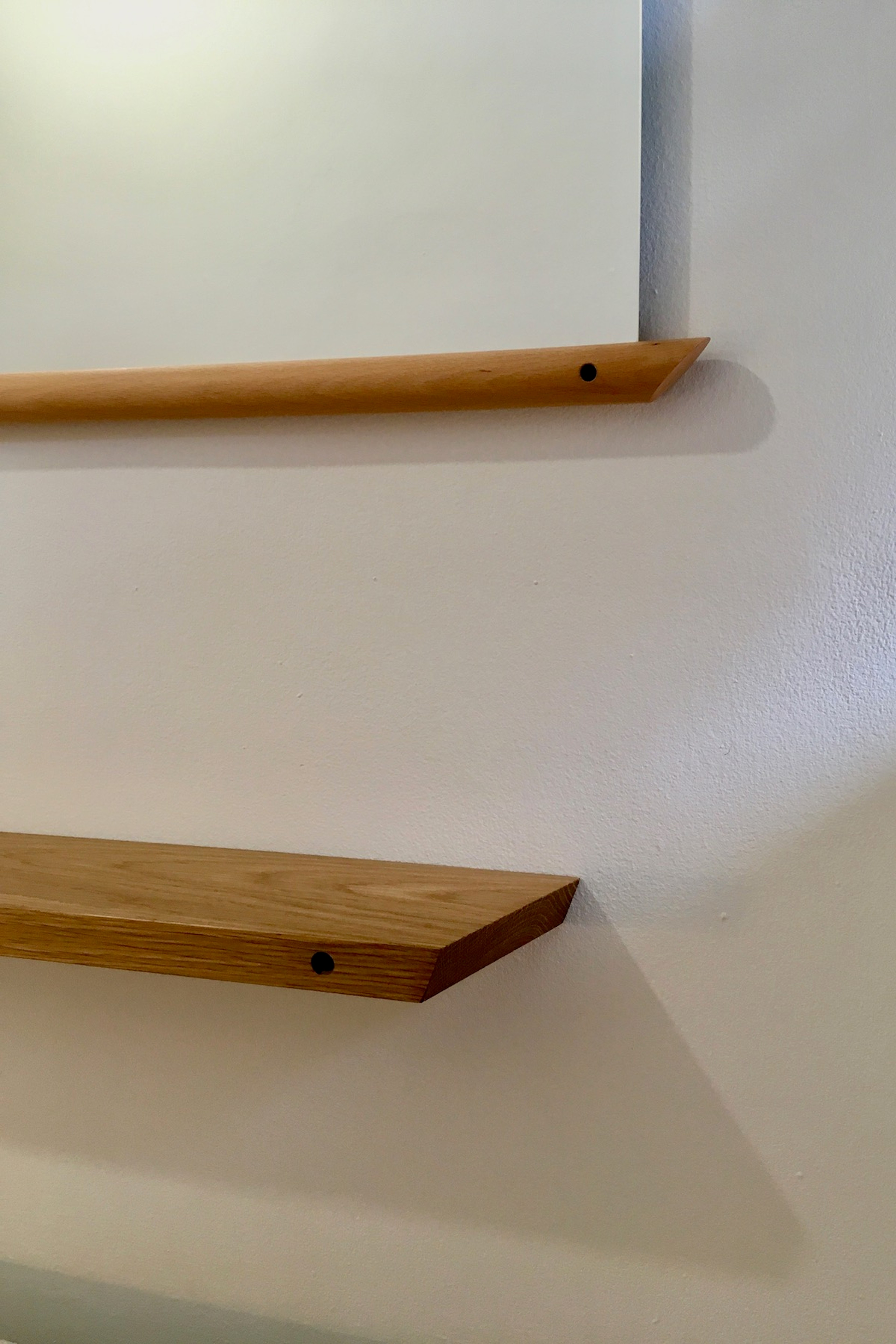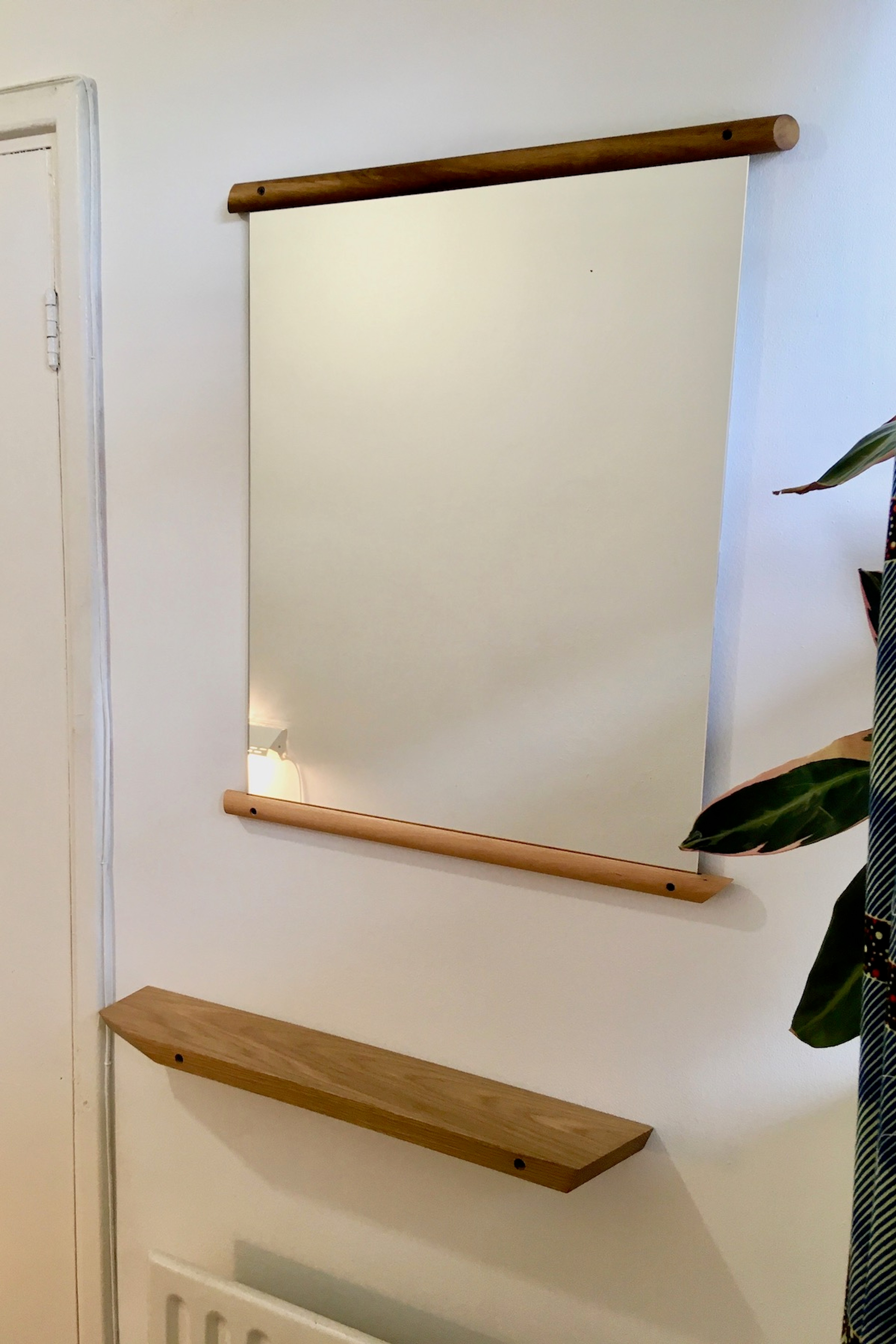 A mirror and shelf in Sapele, Maple and Oak. The Mirror frame consists of two routed dowels.