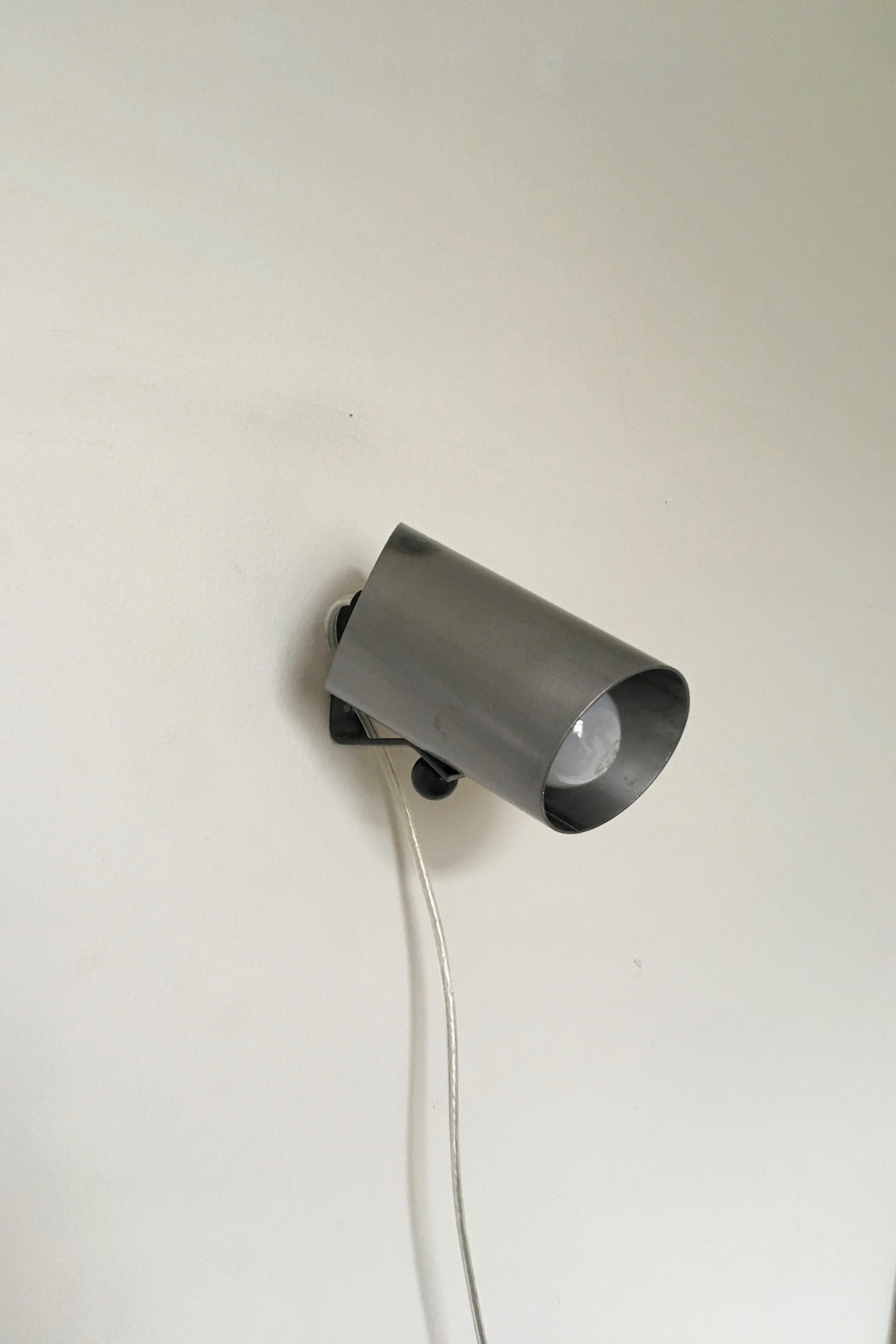 Pivoting wall lamps designed to fit with an earlier pice of furniture and mirror. The shade is mounted to the wall bracket via steel thread which can be adjusted and fixed with a bakelite ball knob.
