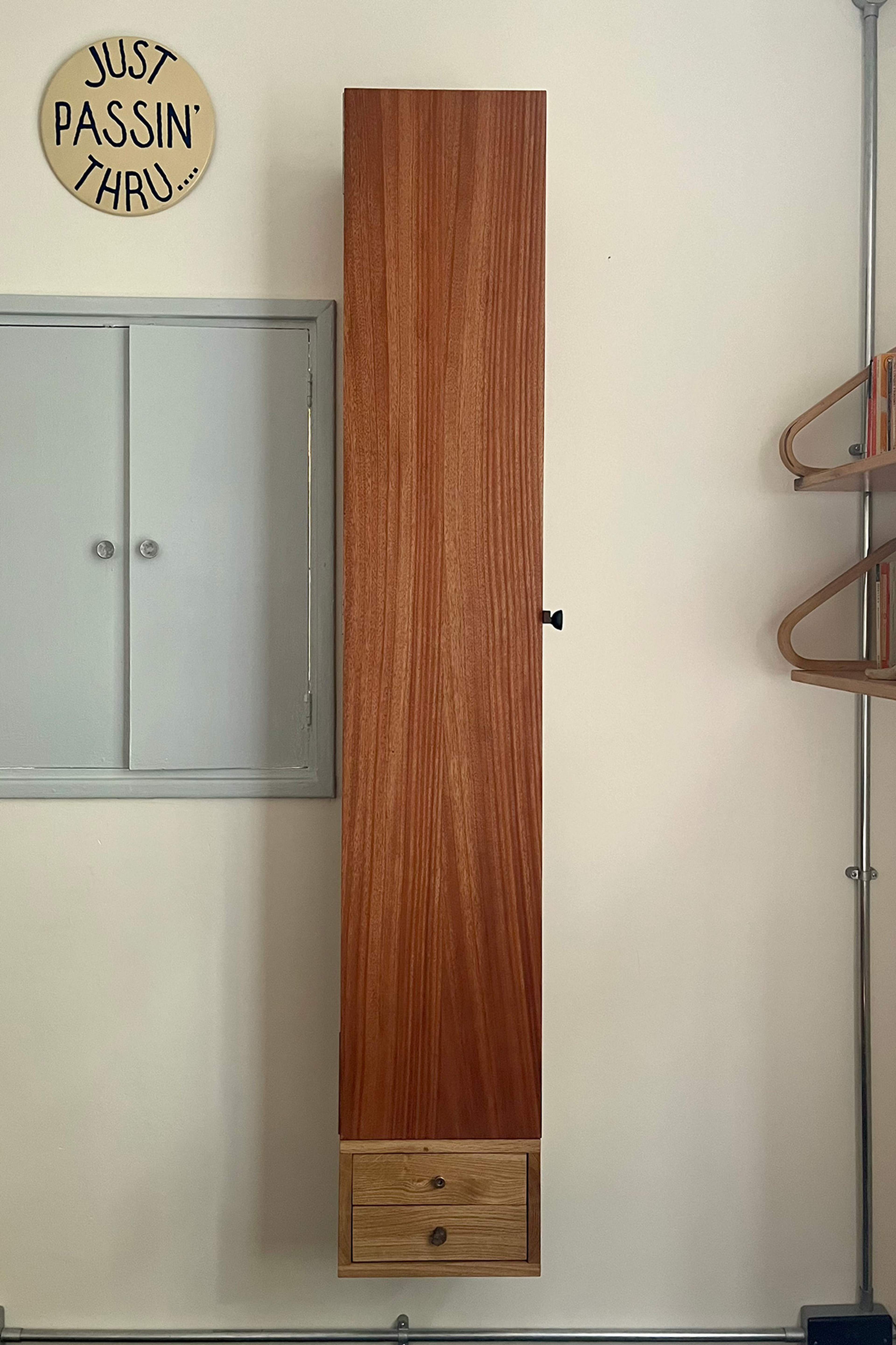 A tall narrow wall cupboard with drawers hung from its base, the one cannot exist without the other. Designed to house stationary at arms length in order to change dining table to desk without leaving your seat.