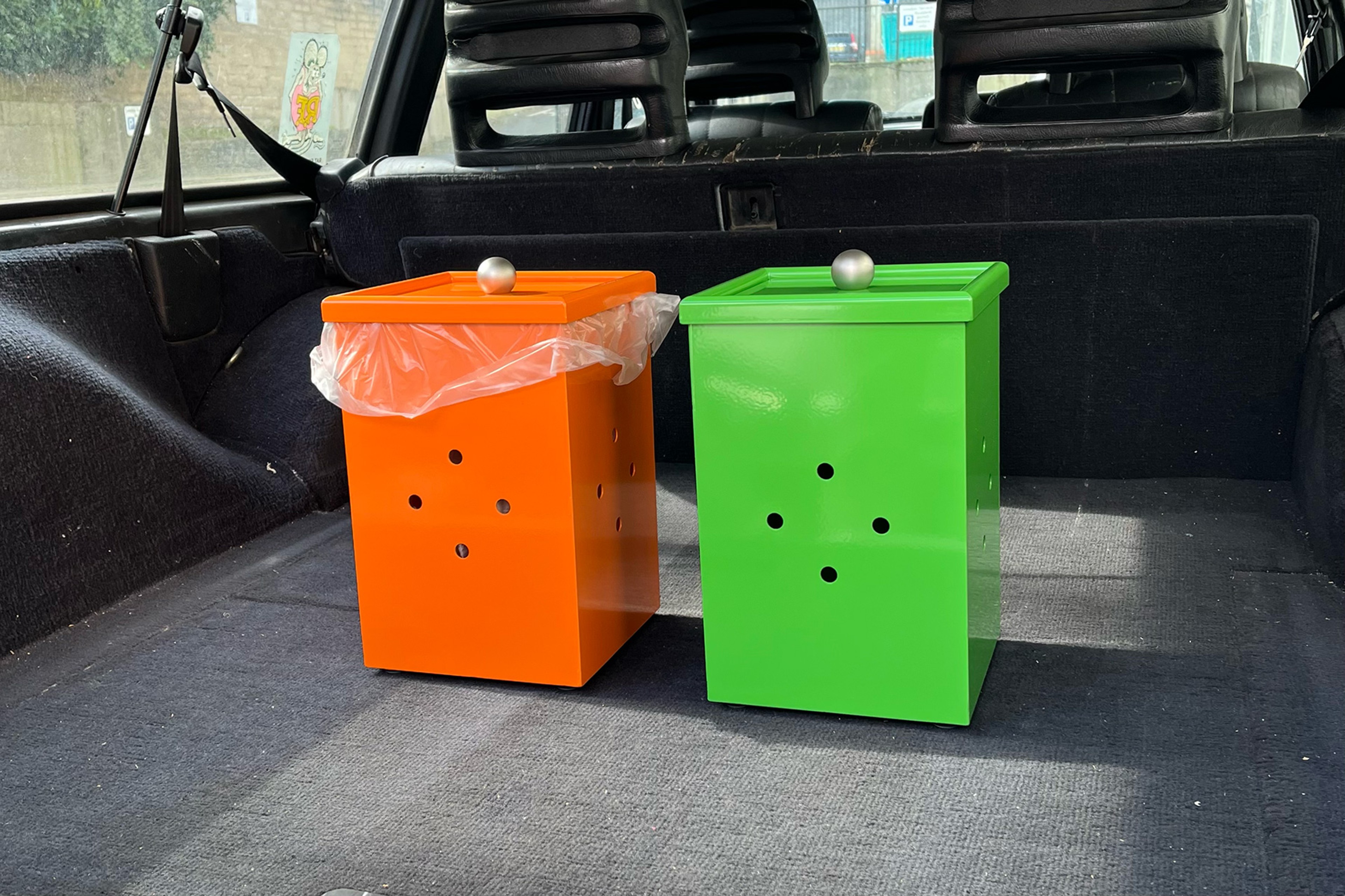 A pair of bathroom bins to match earlier cabinets. The lid locates into a bag securing collar.