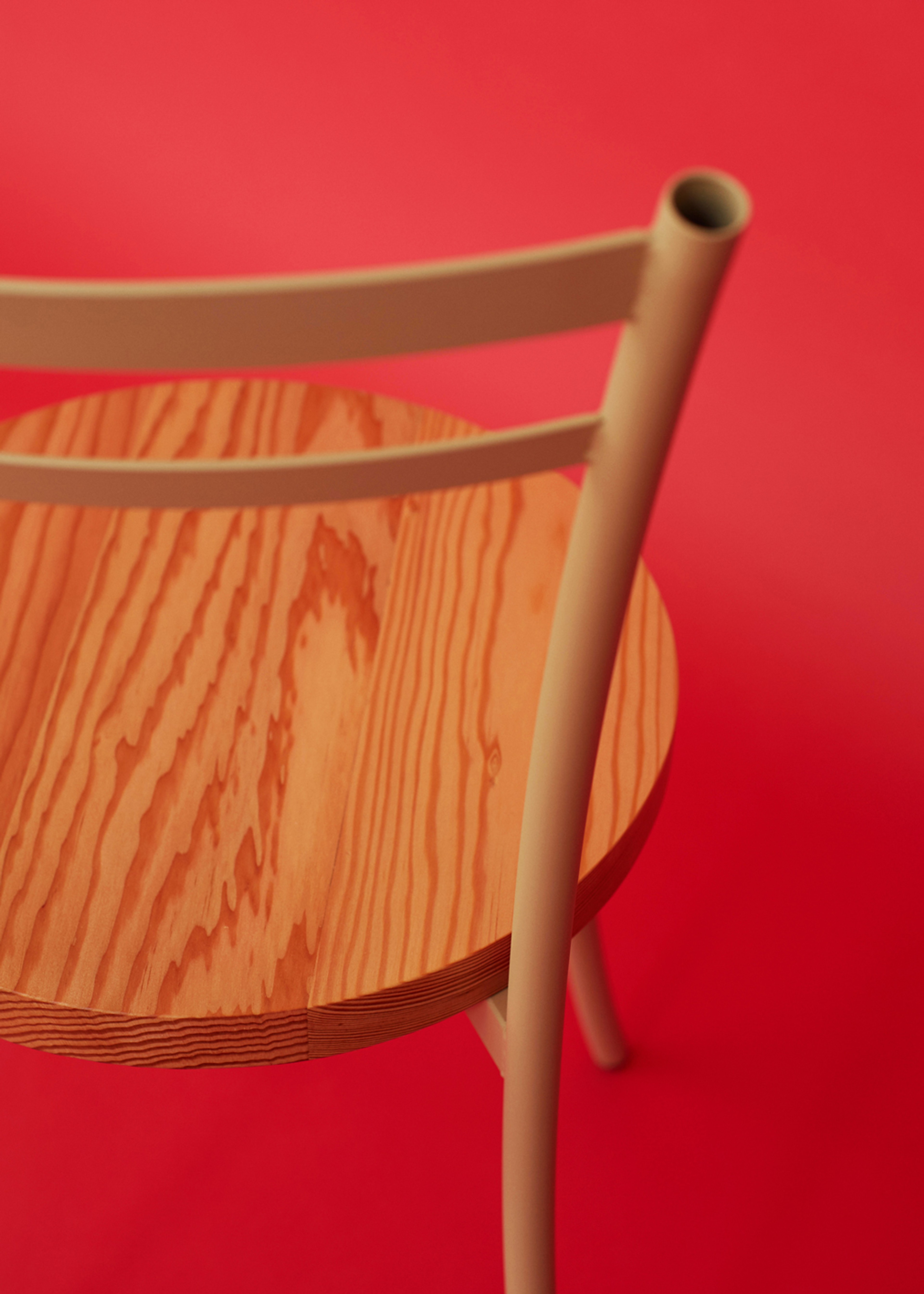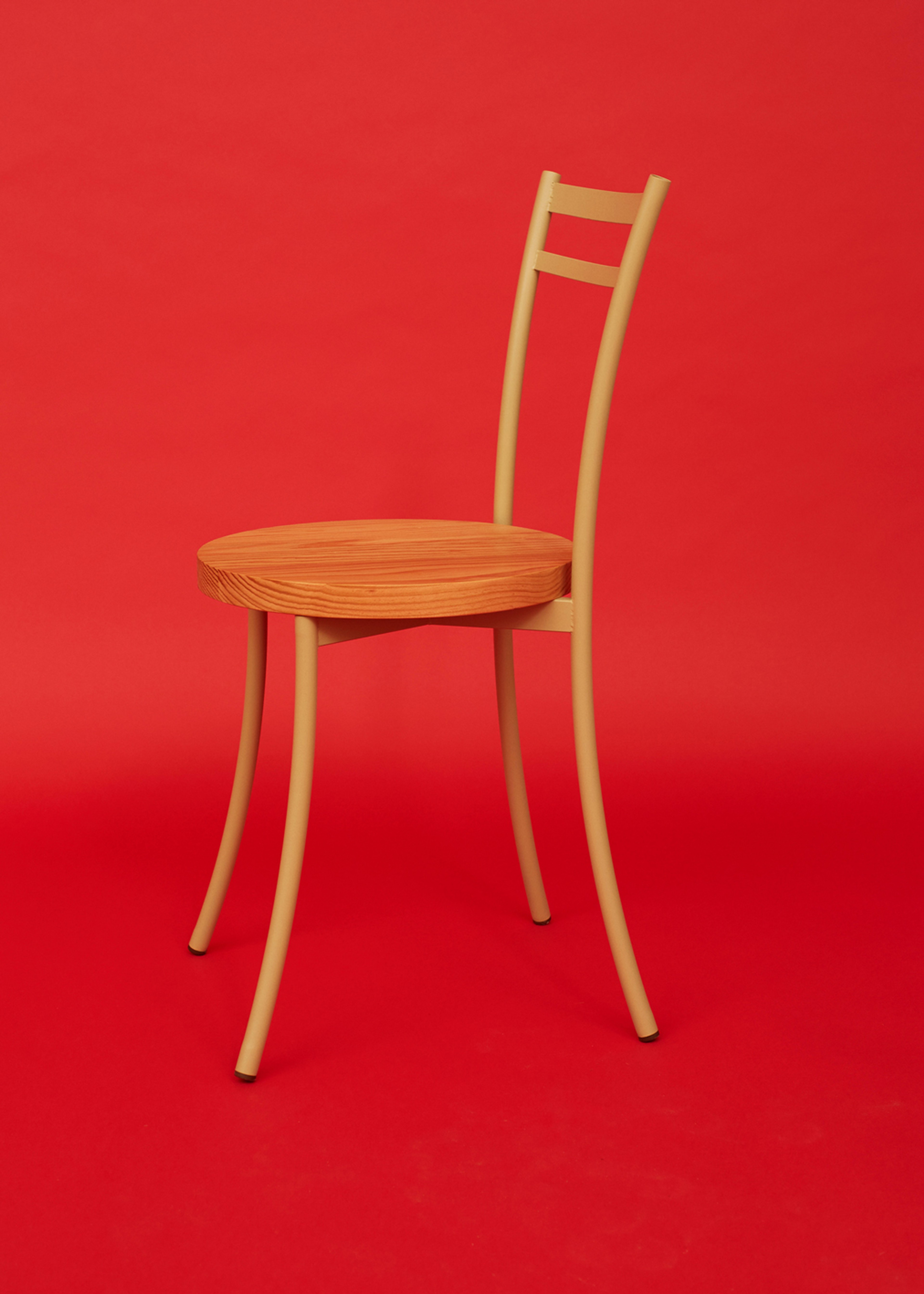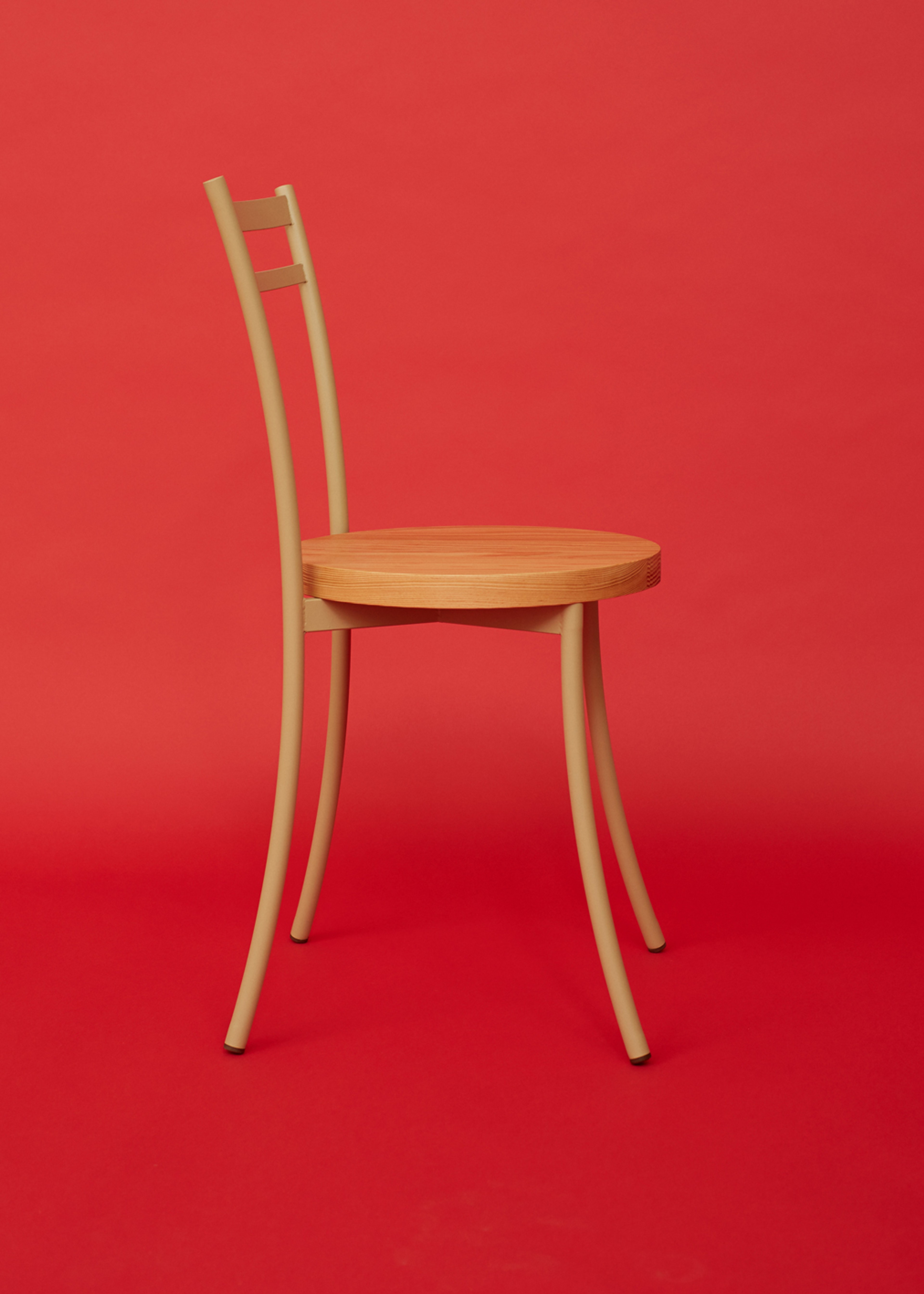 A homage to Thonet in steel. A light weight versatile chair with rolled 20mm Tubular ERW Steel frame. The tubular steel creates a surprisingly light yet strong frame which is intended to work with either an upholstered or wooden seat.