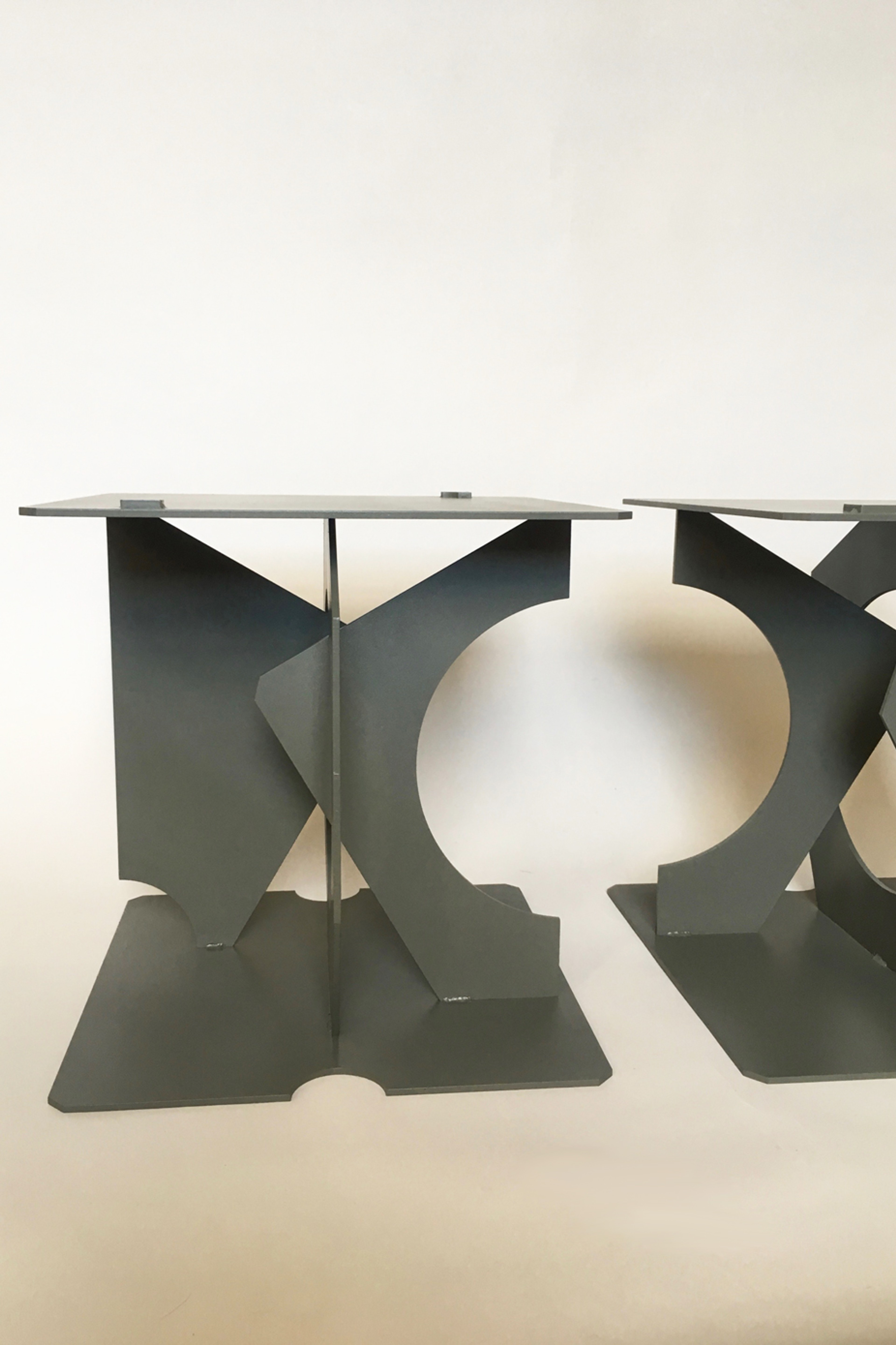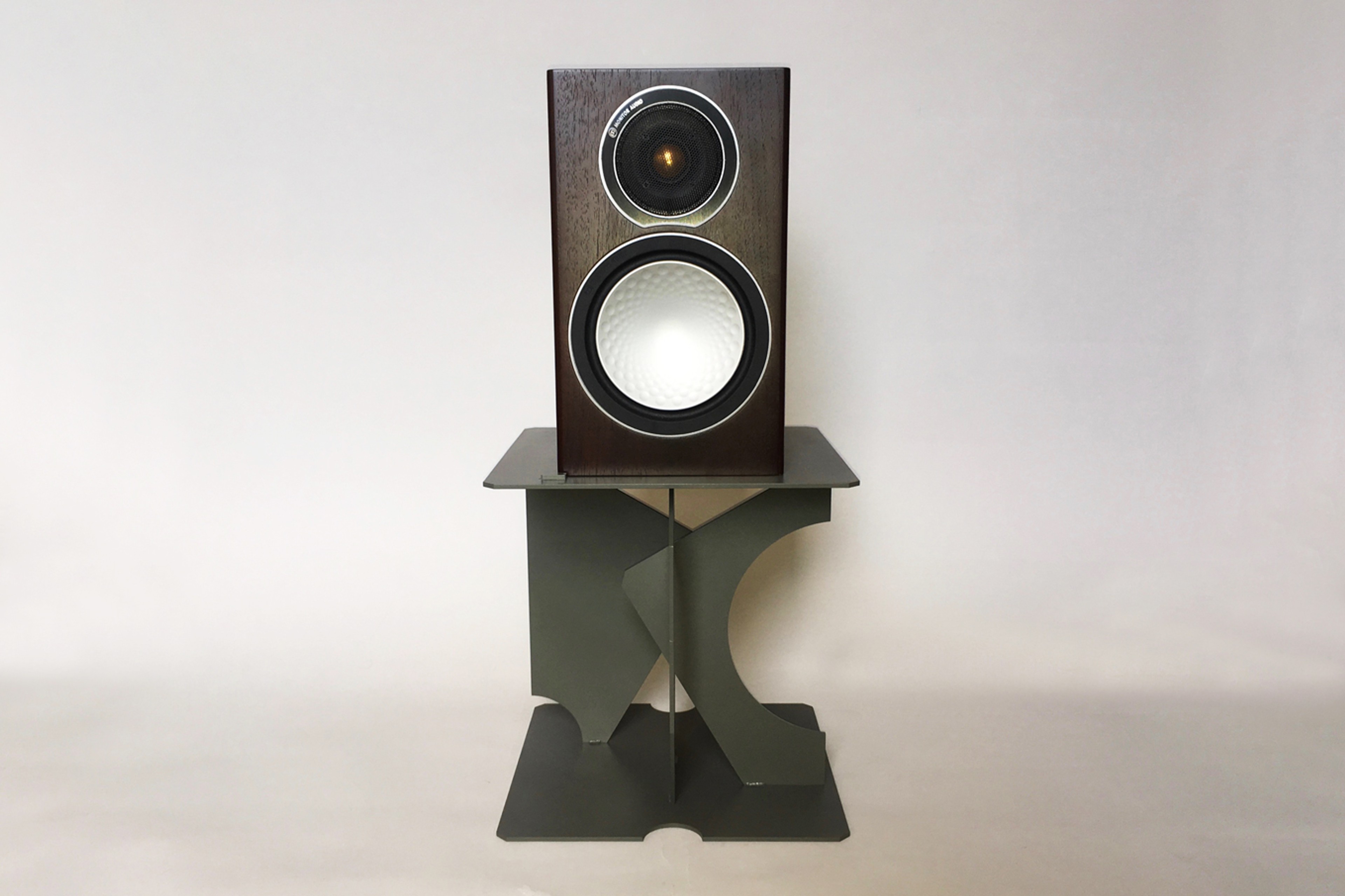 A pair of speaker stands specifically designed to work with Monitor Audio speakers. The forms consist of 300mm Square plates welded together, each of the vertical plates has had surface area removed through the drawing of lines and radius’ using a grid spaced at 50mm. The stands can also stack to achieve extra height.