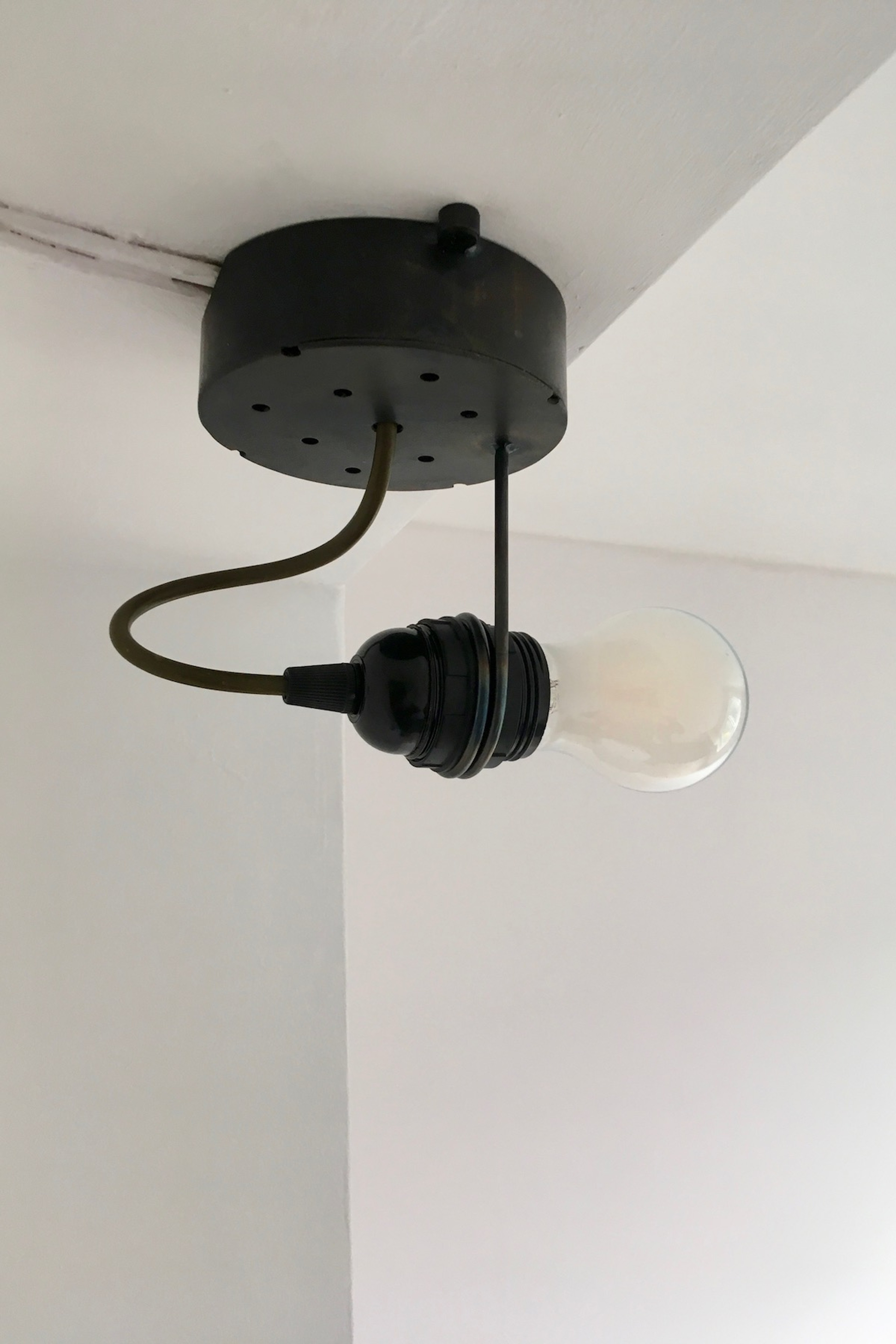 Ceiling lamp designed to fit over an existing ceiling rose, securing a lamp holder parallel with the ceiling.