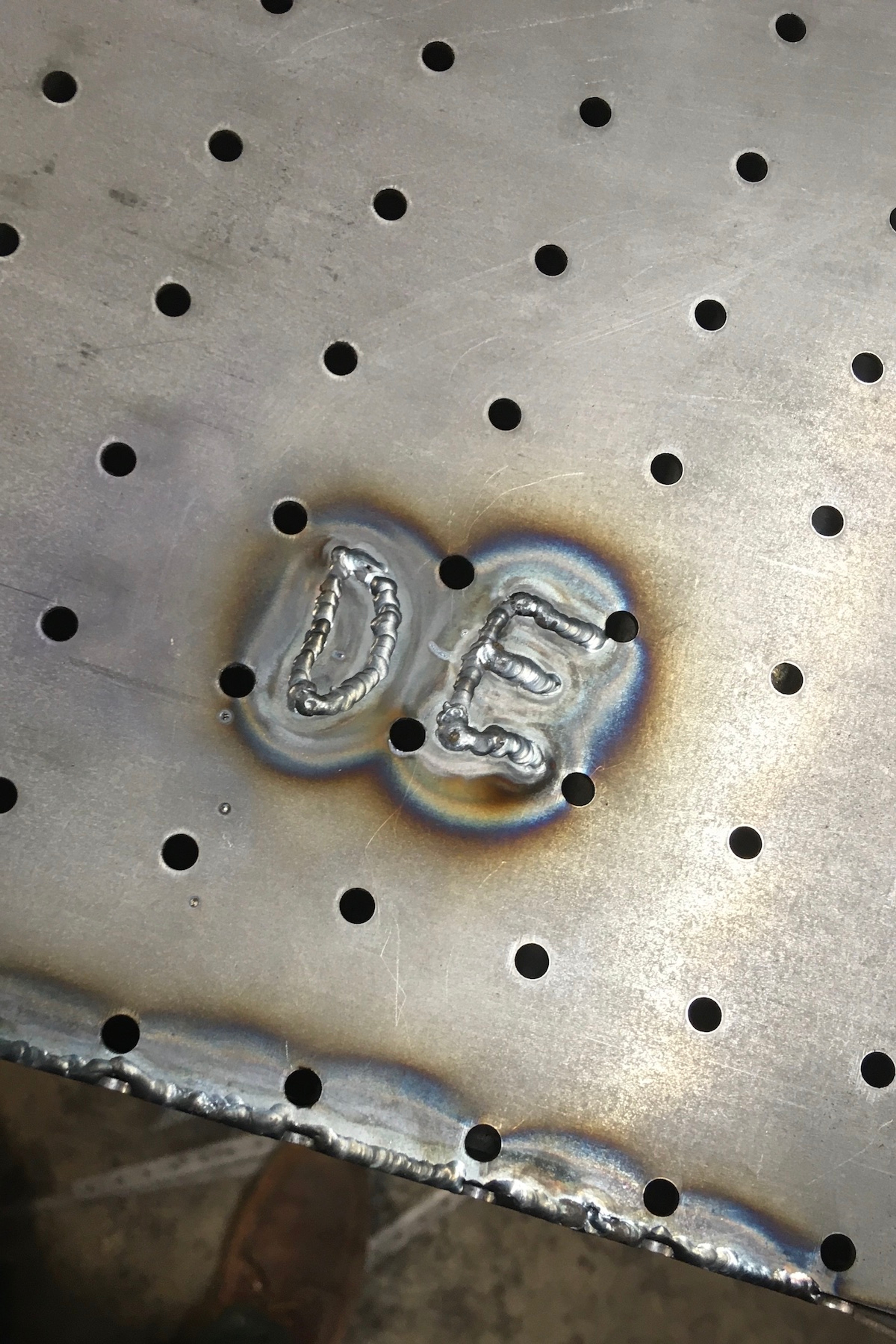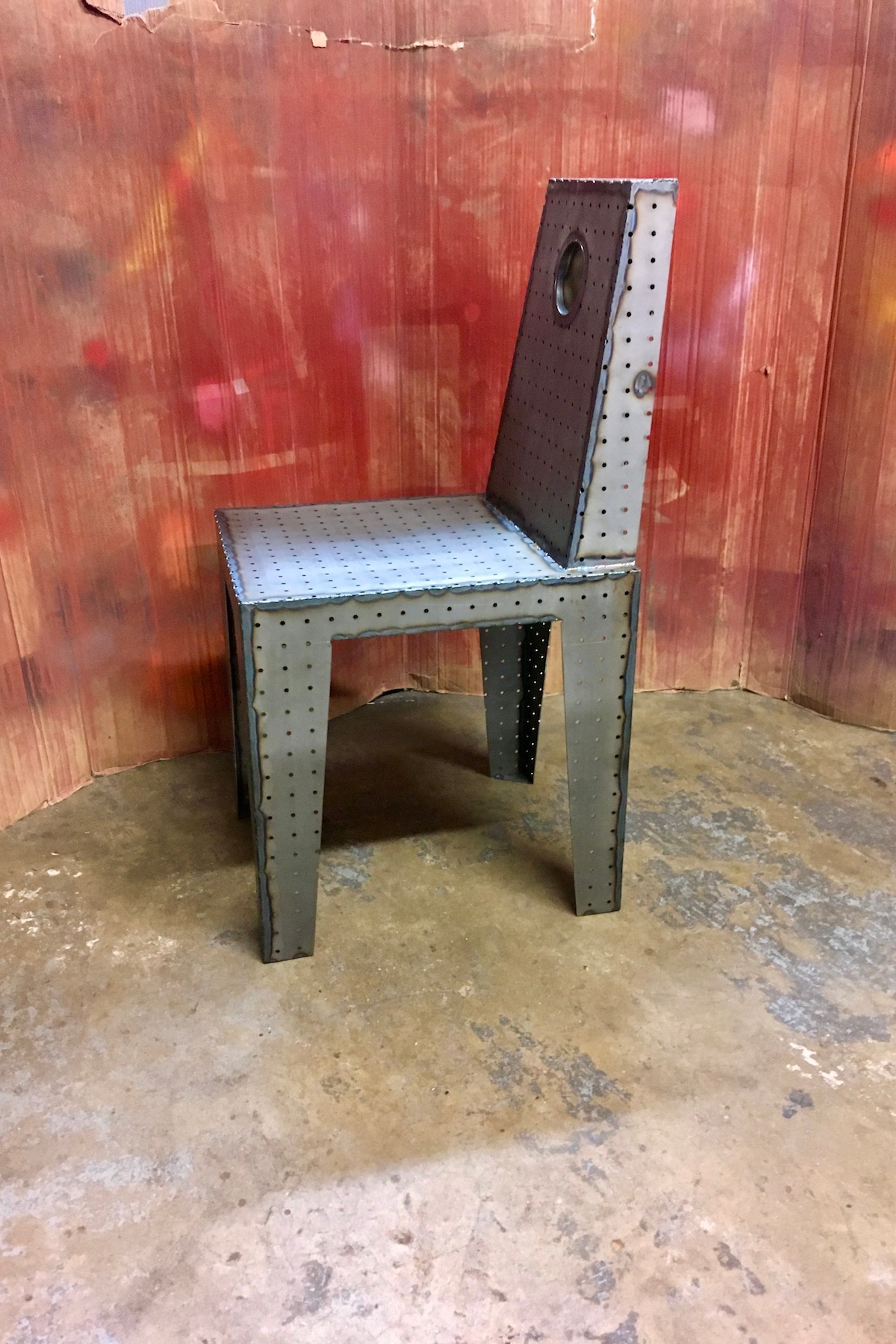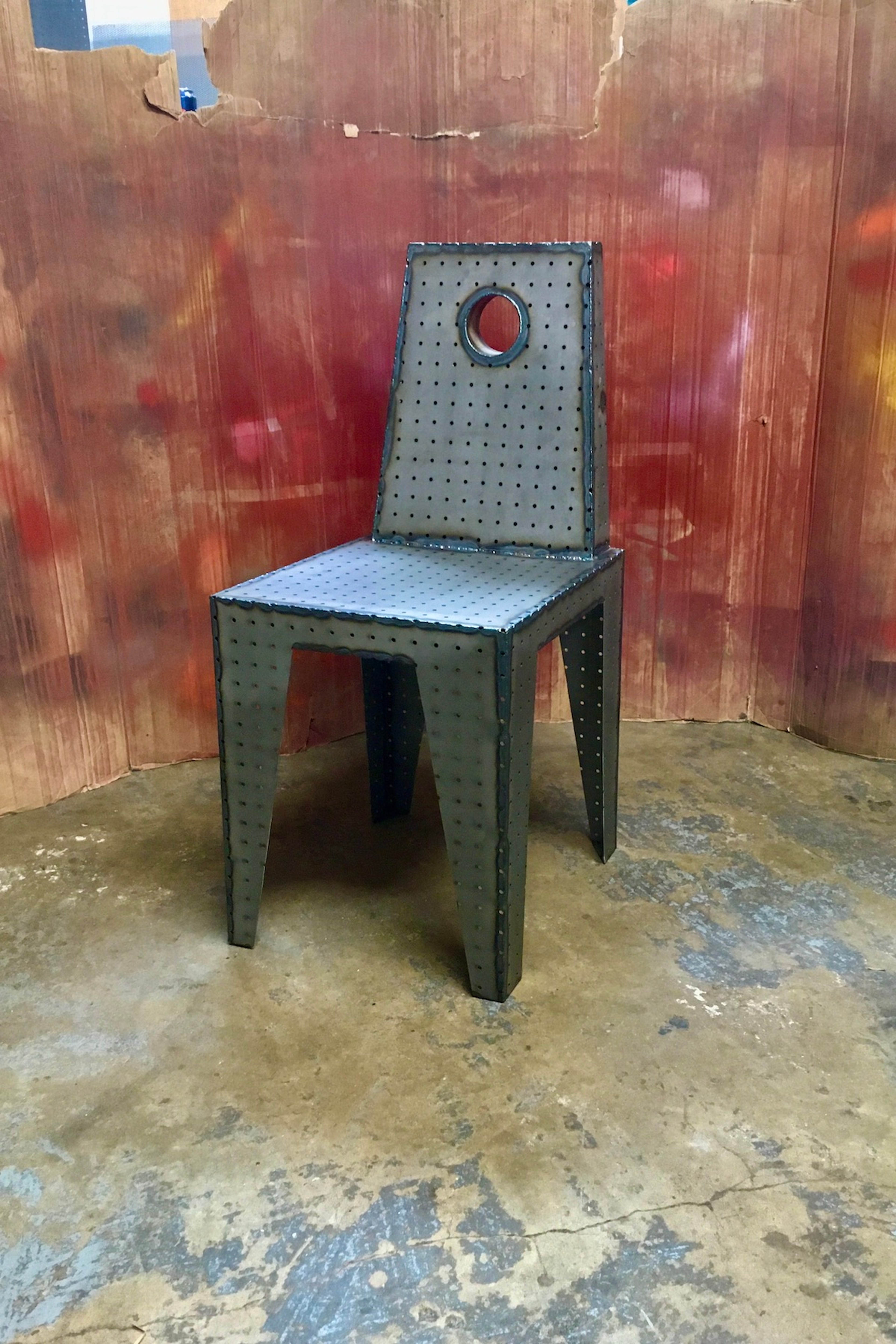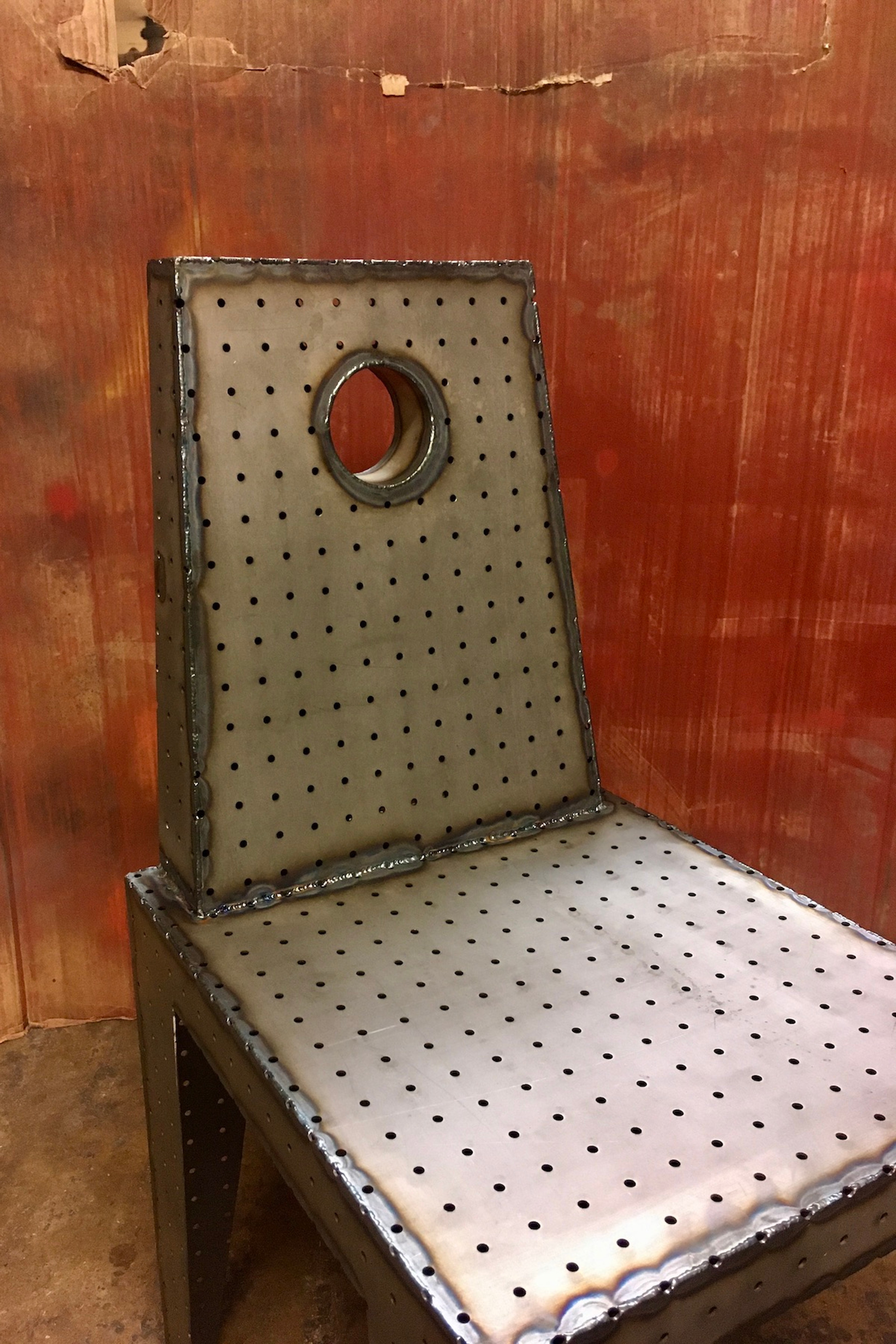 A chair designed to work specifically with square pitch perforated sheet the idea being to work with the material and reduce waste. The pattern of the perforation guides the overall shape and in turn the negative spaces of leg panels become the backrest.