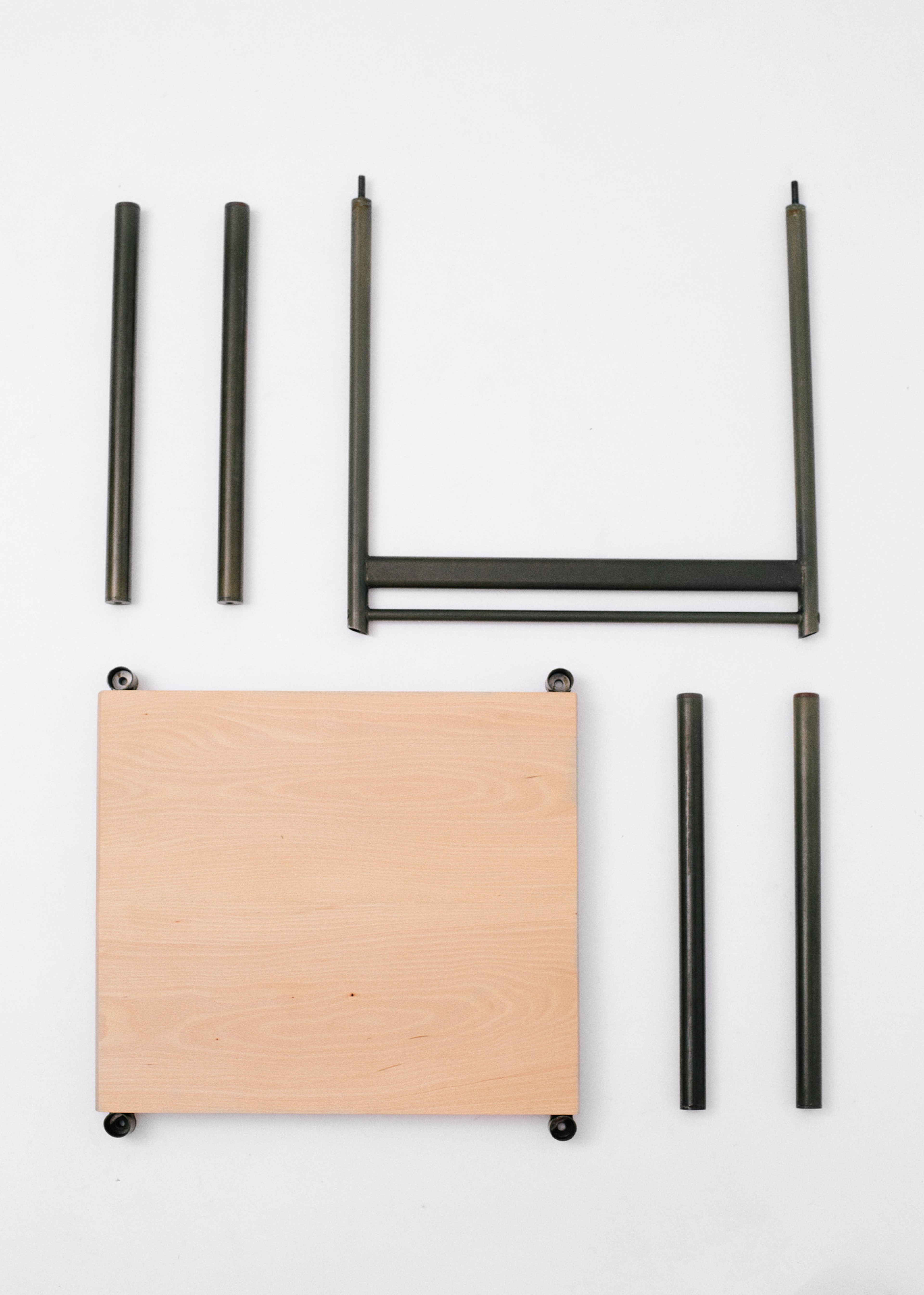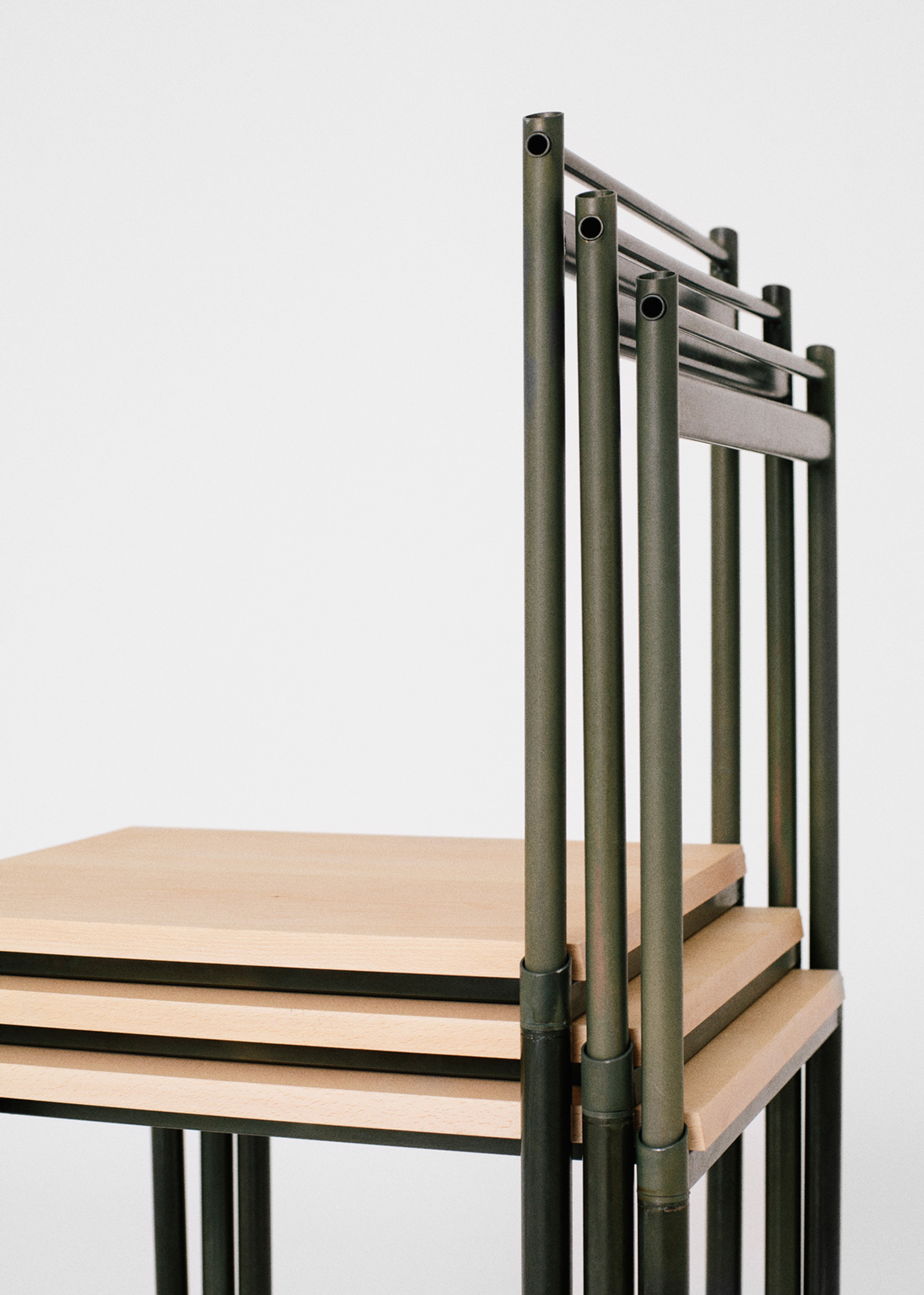 A collection of seating that stacks and packs. Designed to fit within a modern lifestyle of frequent moves and smaller spaces. The self-assembly Stool and Chair are intended to provide an affordable and flexible option that can easily be packed for a move or stacked when space is needed. Stacking/Packing has been produced in a way that could easily be made in larger runs with the same components and Tubular steel used throughout further extending the idea of an affordable utilitarian piece. The frames have been finished with a Passivated Zinc coating, an industrial process generally used on large runs of smaller components rarely seen on items of this size.