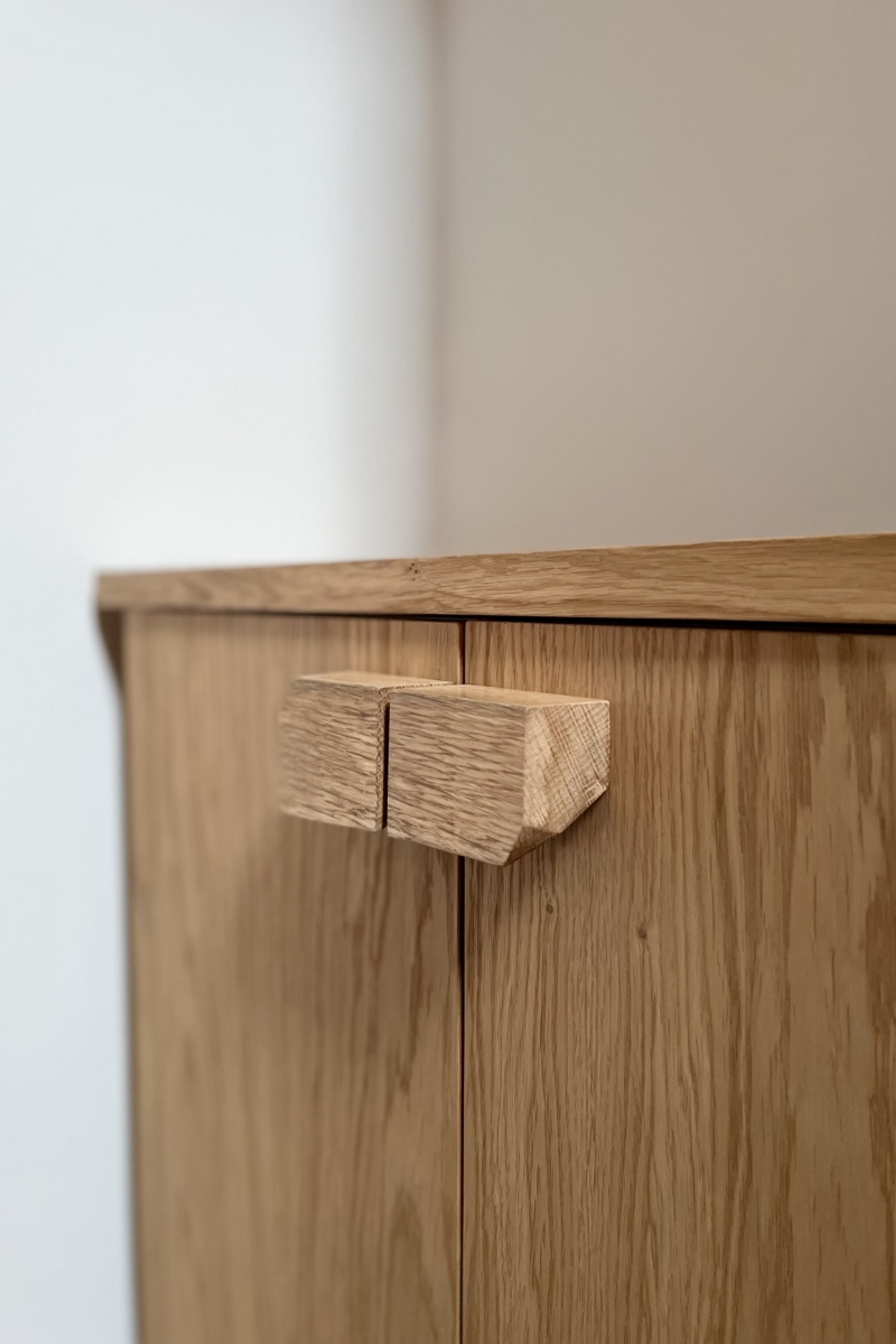 A small cupboard that acts as both storage and landing barrier. Designed as part of a larger interior project.