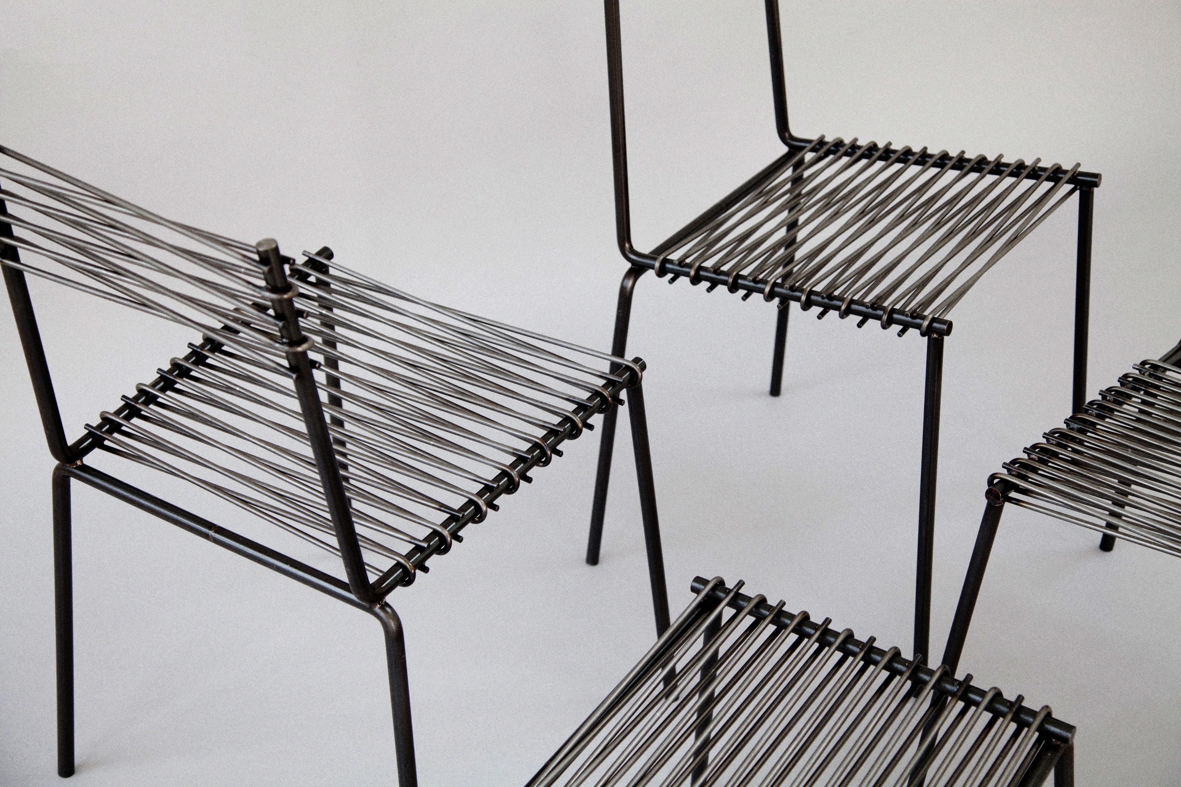 The work is an experiment in steel whilst also an homage to the string chair. By using an all steel construction the string has become a structural element in turn reducing the structure itself. Although at first brutal in appearance I hope to show the beauty and fragility that steel can possess much like the string of the chair that was at first the inspiration.