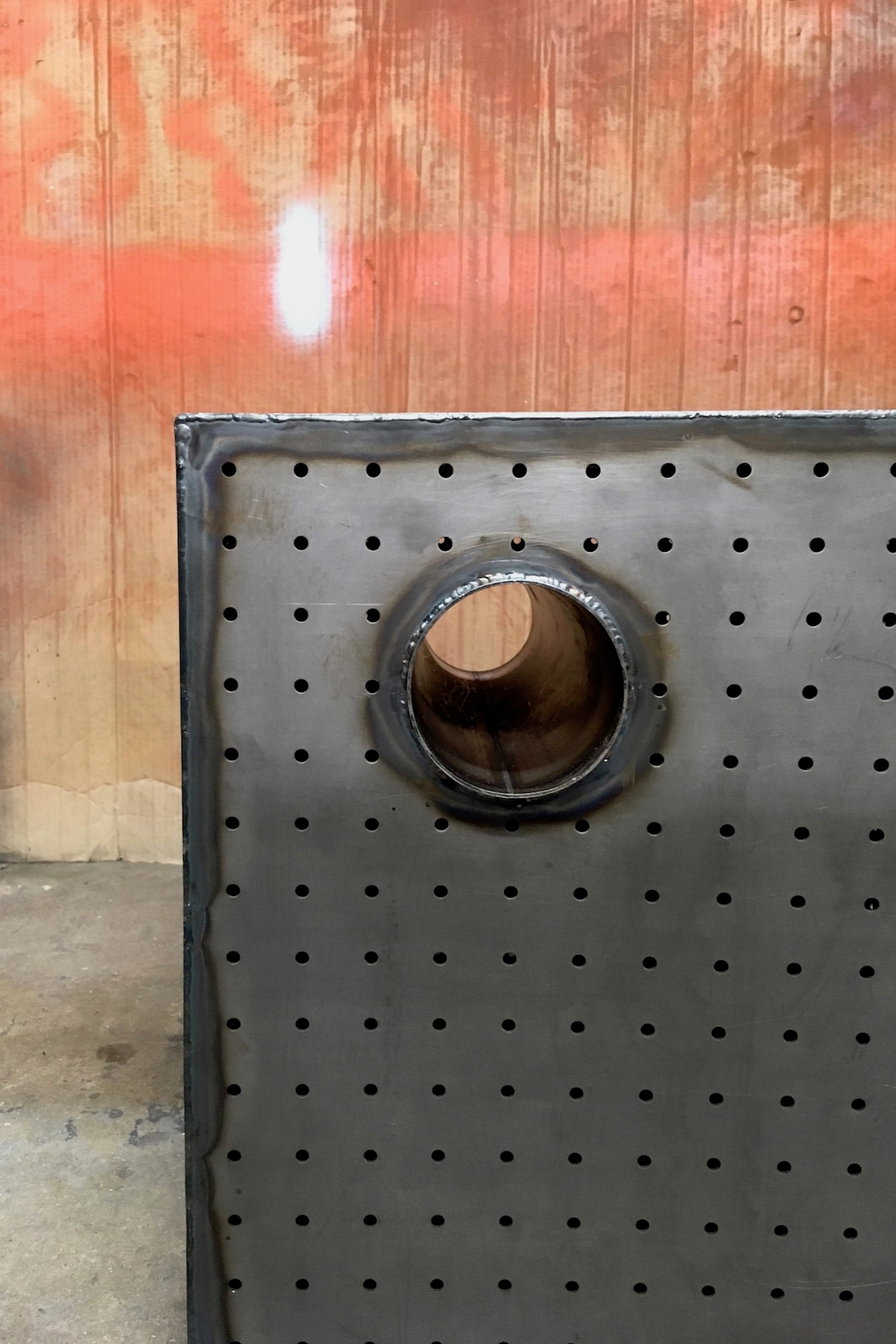 Side table with a hole through. The tube stiffens the sheet steel structure while providing a route for cables.