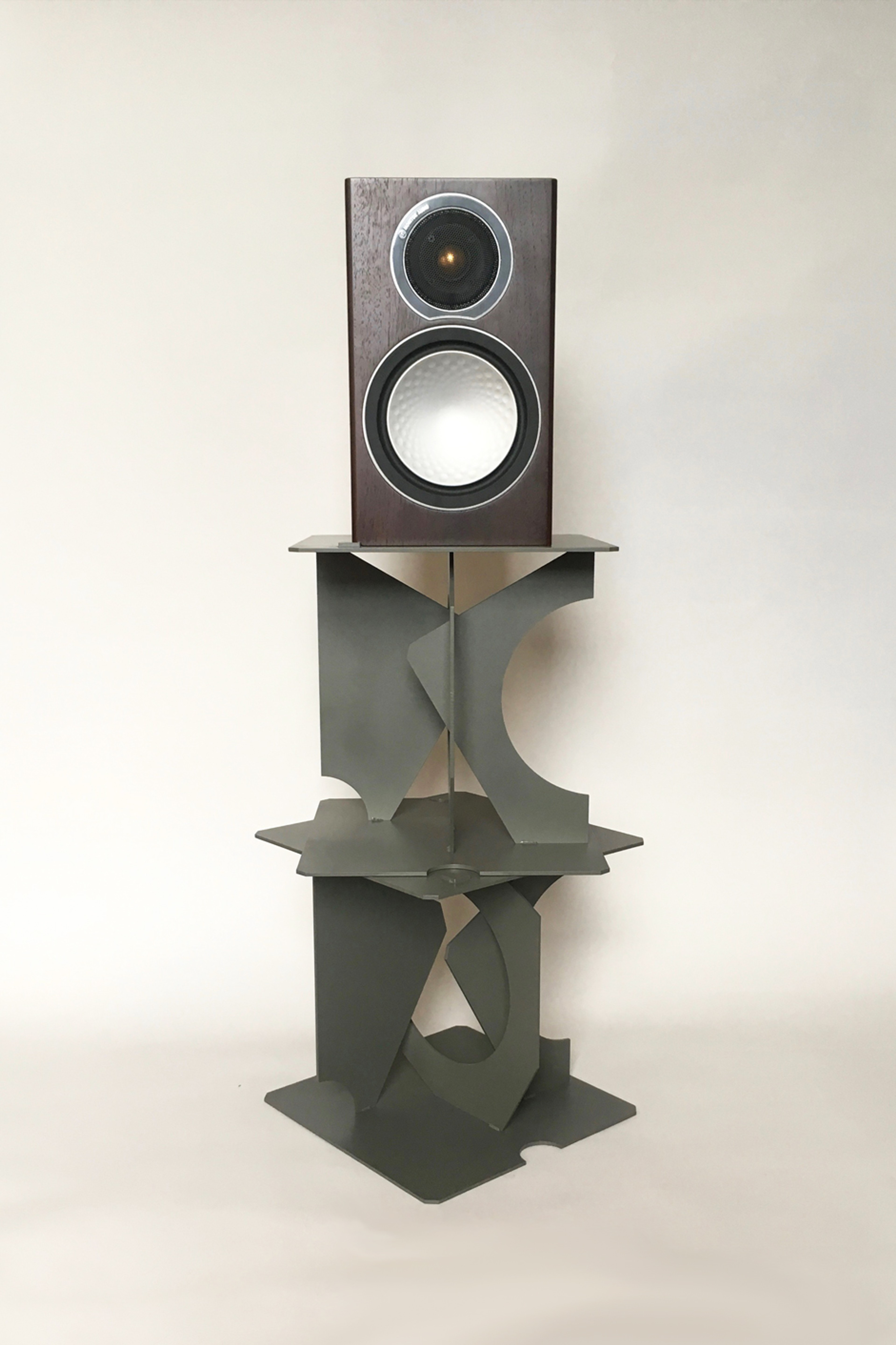 A pair of speaker stands specifically designed to work with Monitor Audio speakers. The forms consist of 300mm Square plates welded together, each of the vertical plates has had surface area removed through the drawing of lines and radius’ using a grid spaced at 50mm. The stands can also stack to achieve extra height.