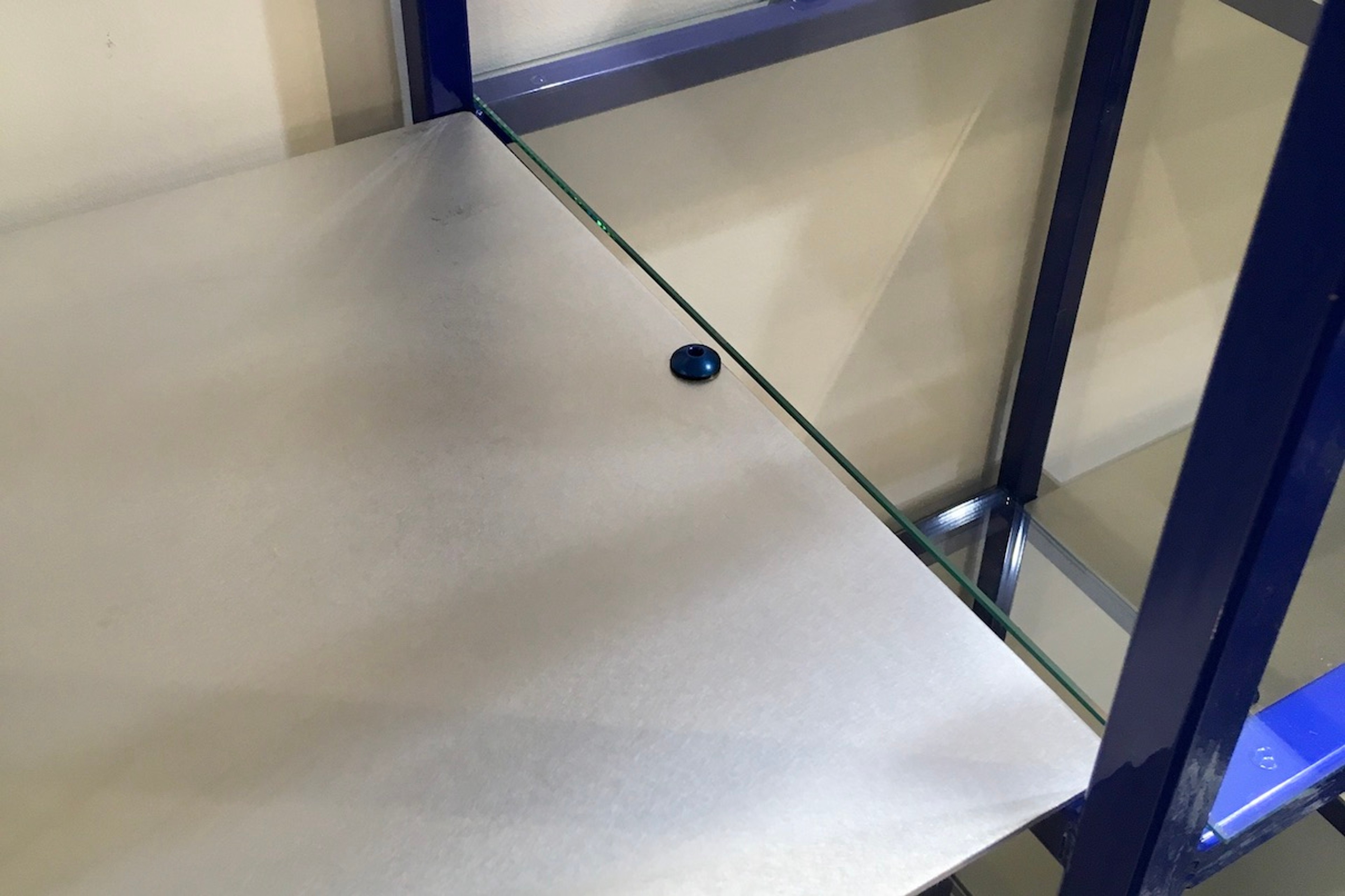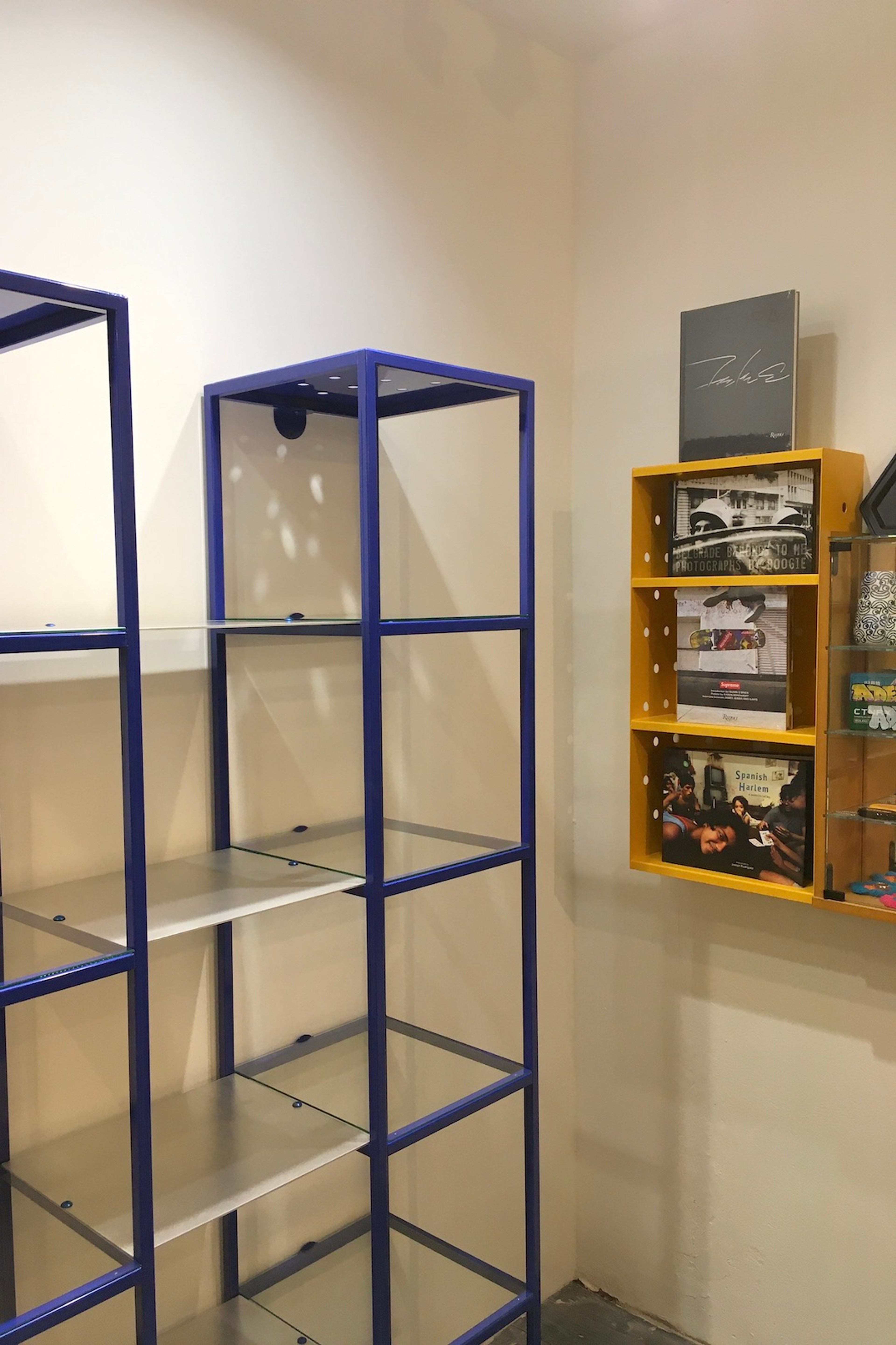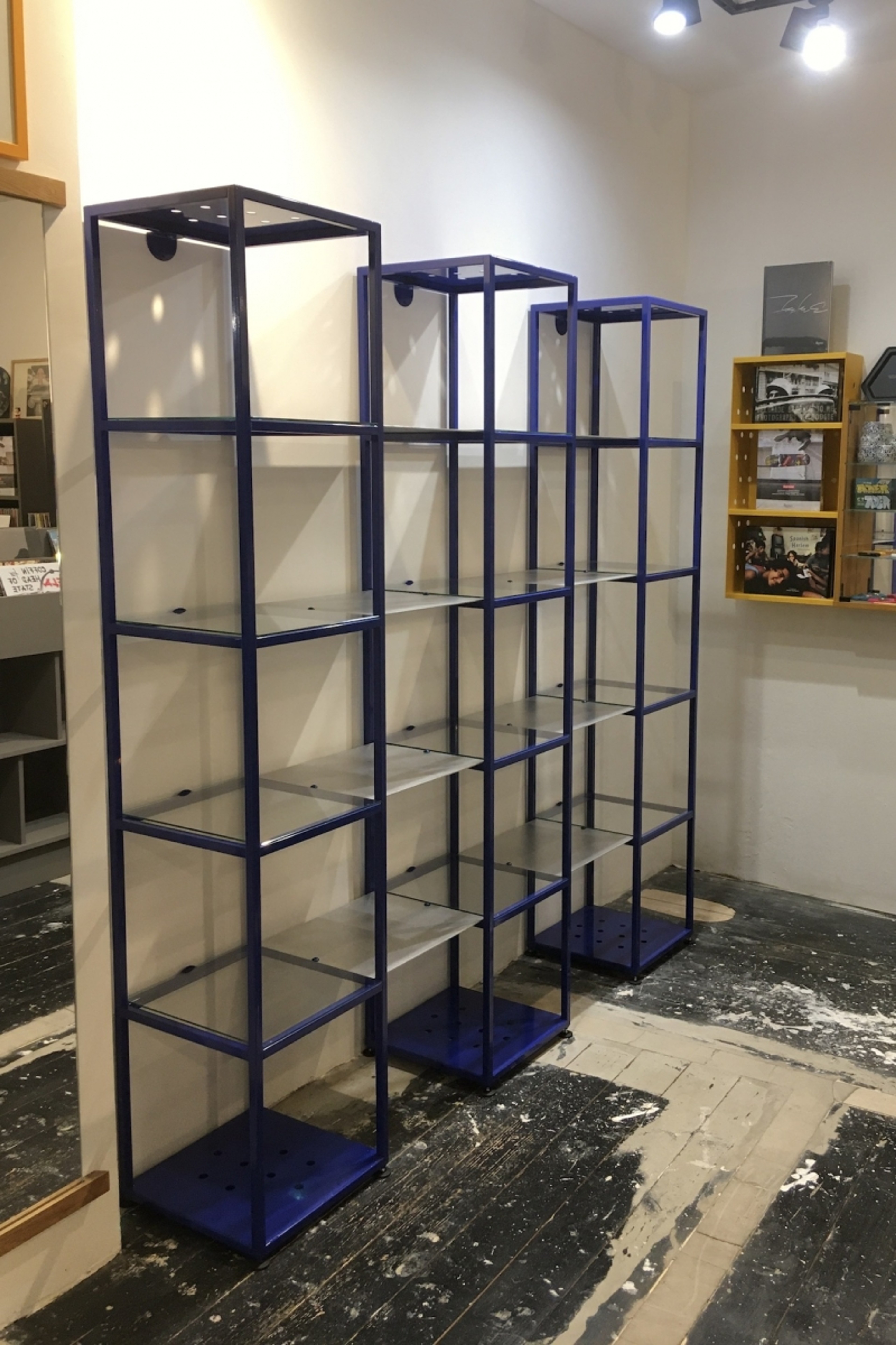 Additional upright display shelving for Bankrupt. 3 steel framed towers with inlaid glass surfaces, tied with aluminium shelves.
