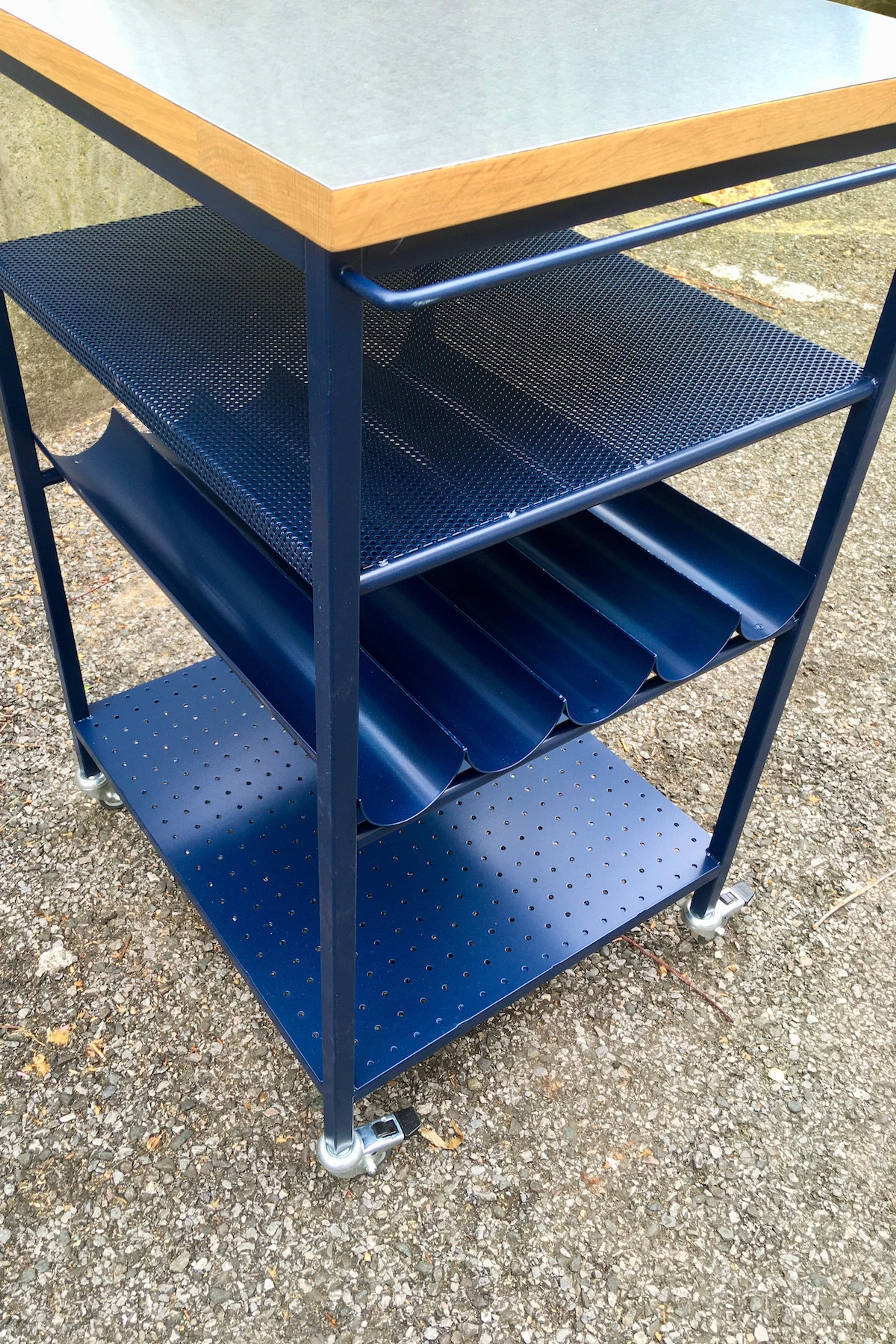 Kitchen cart with a hard wearing stainless top, bottle store and shelves.