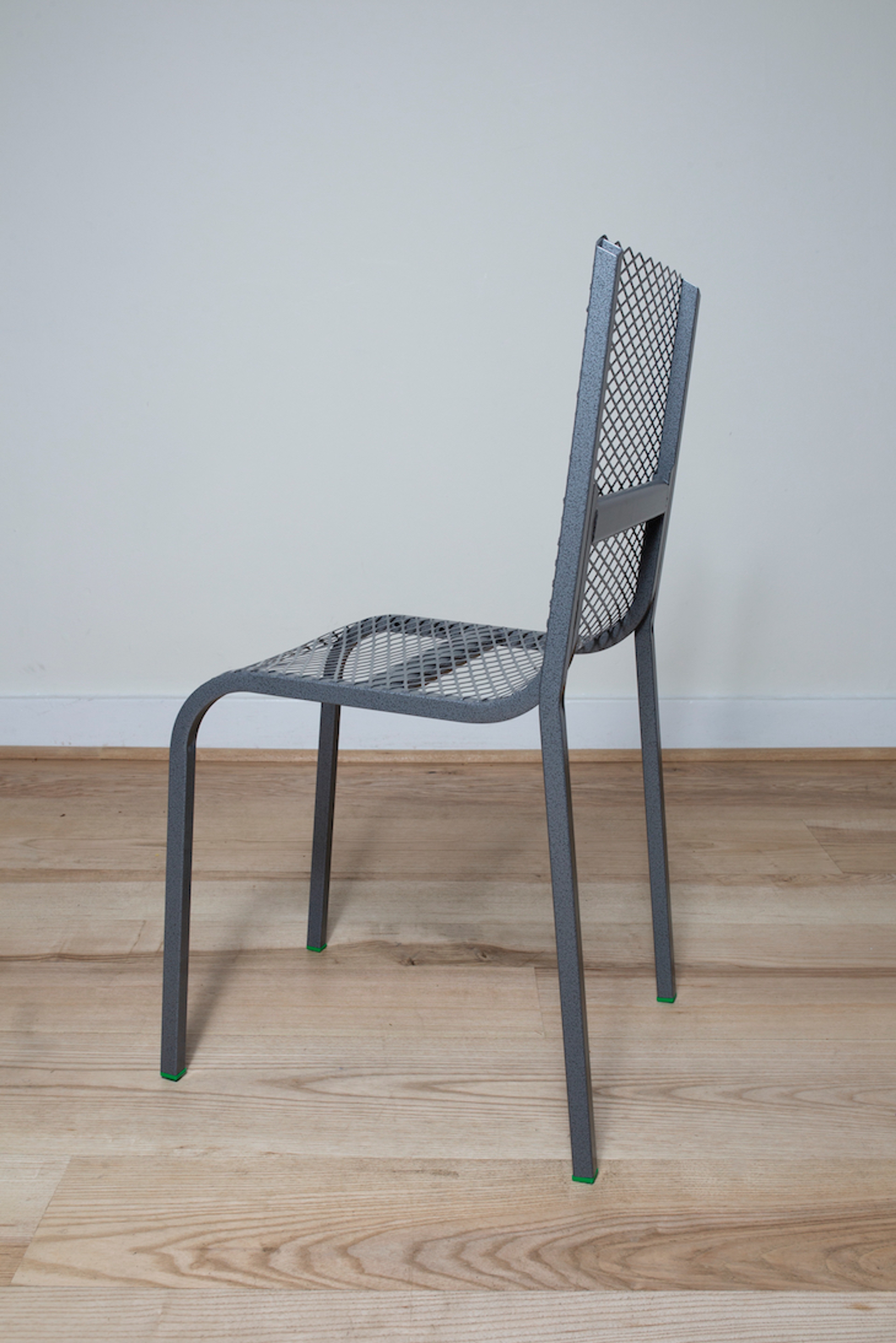 A lightweight chair in bent box section and expanded mesh. Part of a series of one-off/improvised chairs for Redemption Roasters.