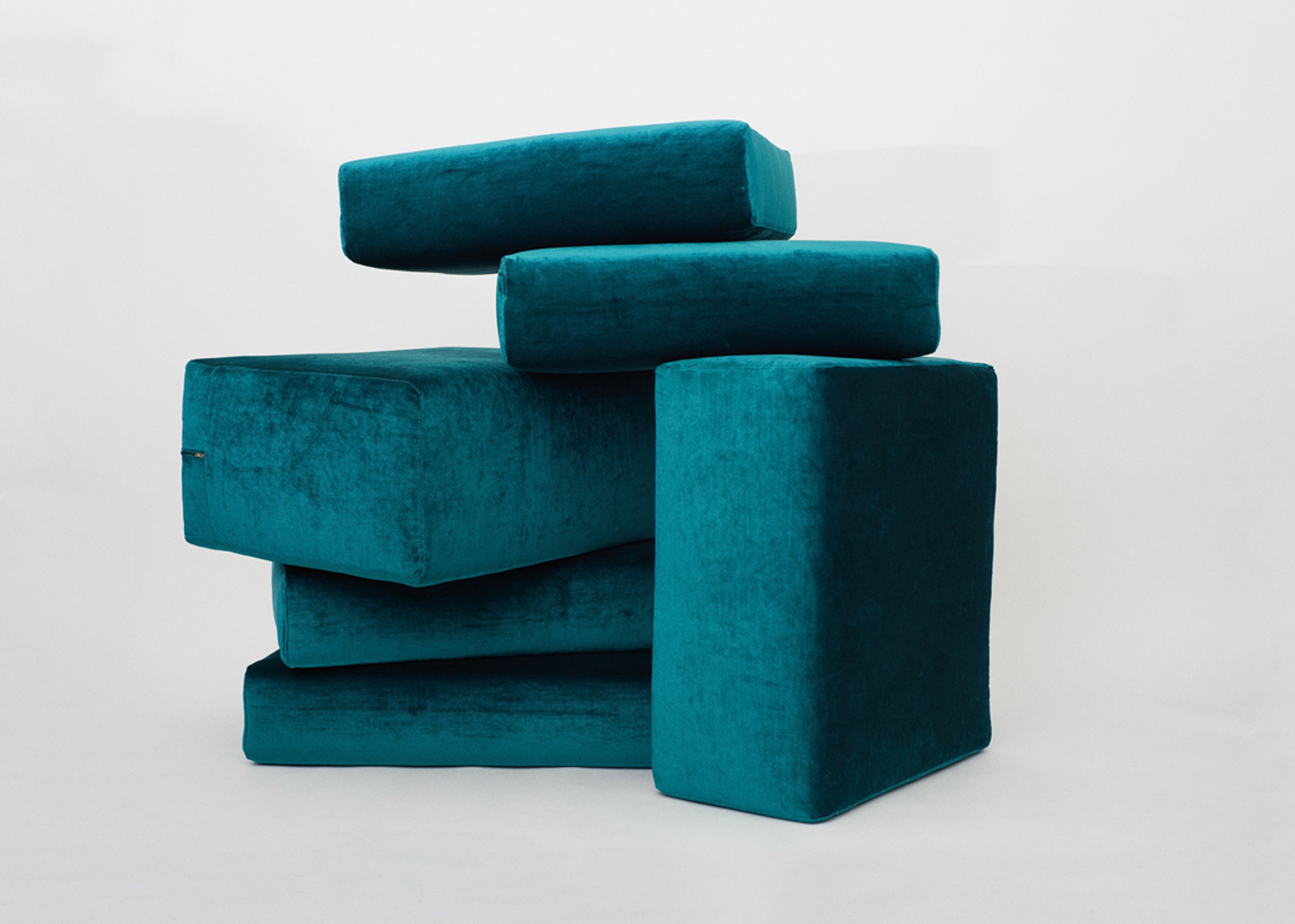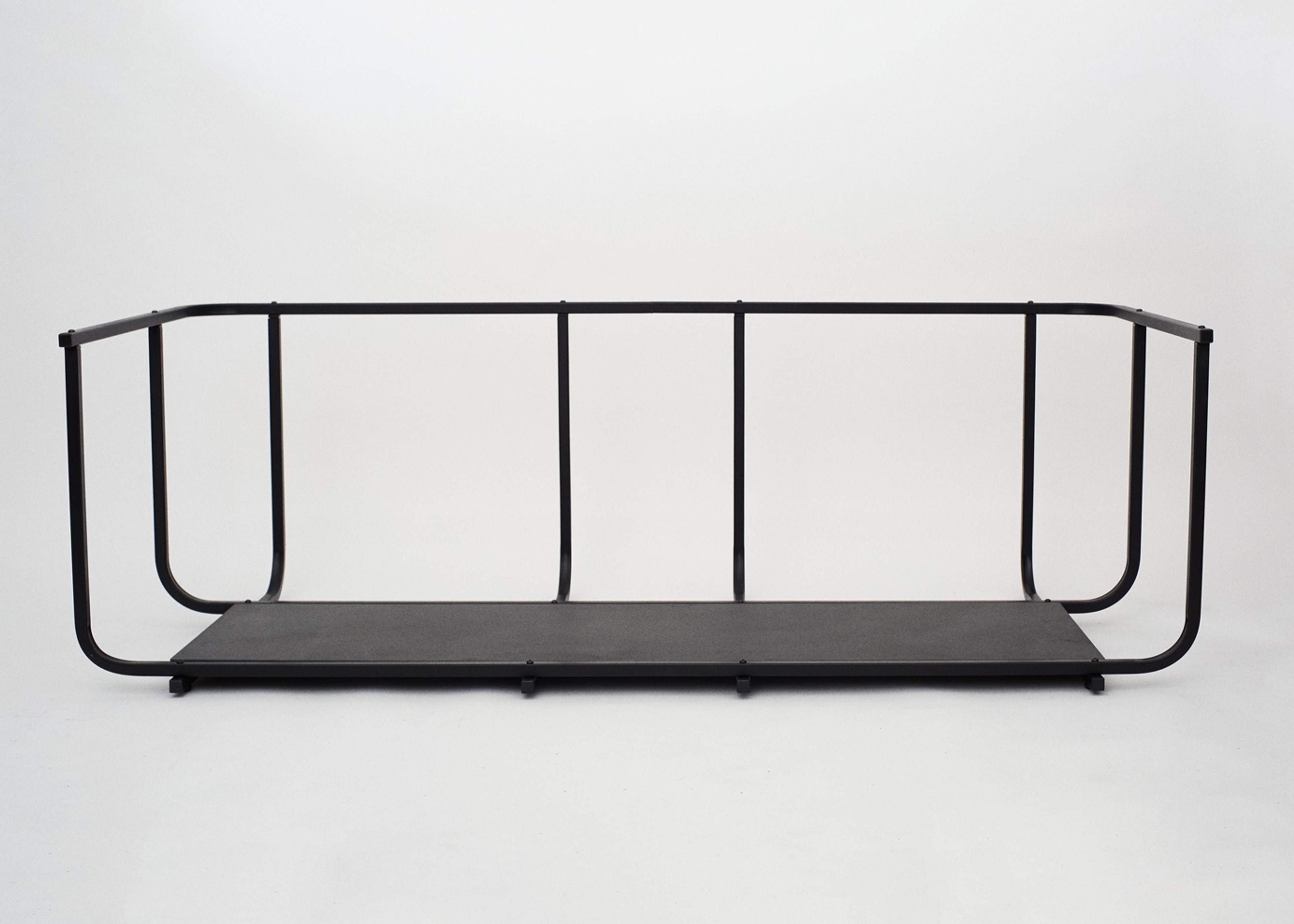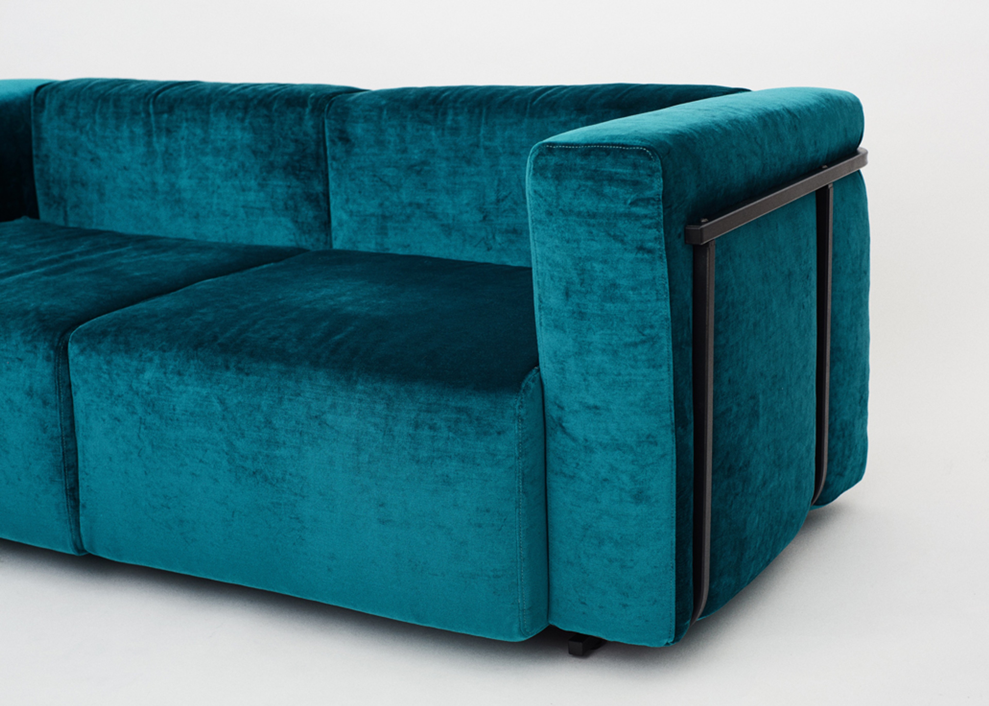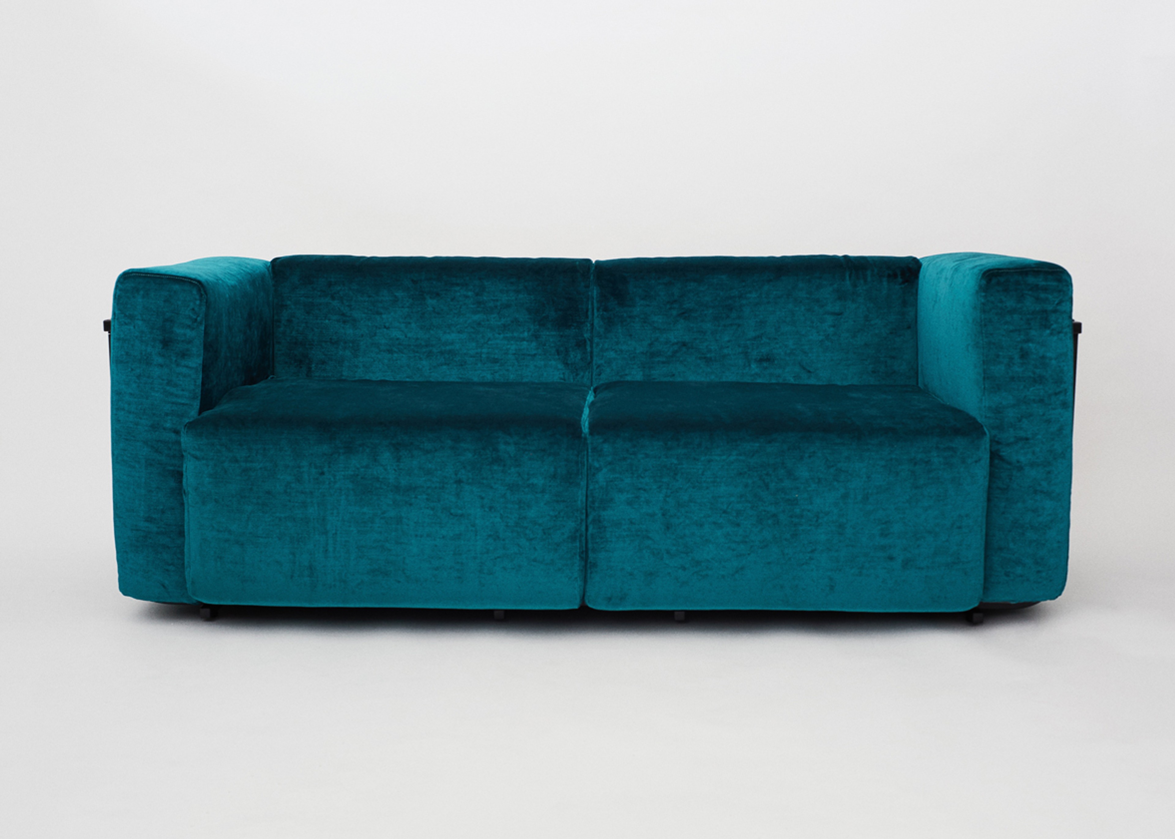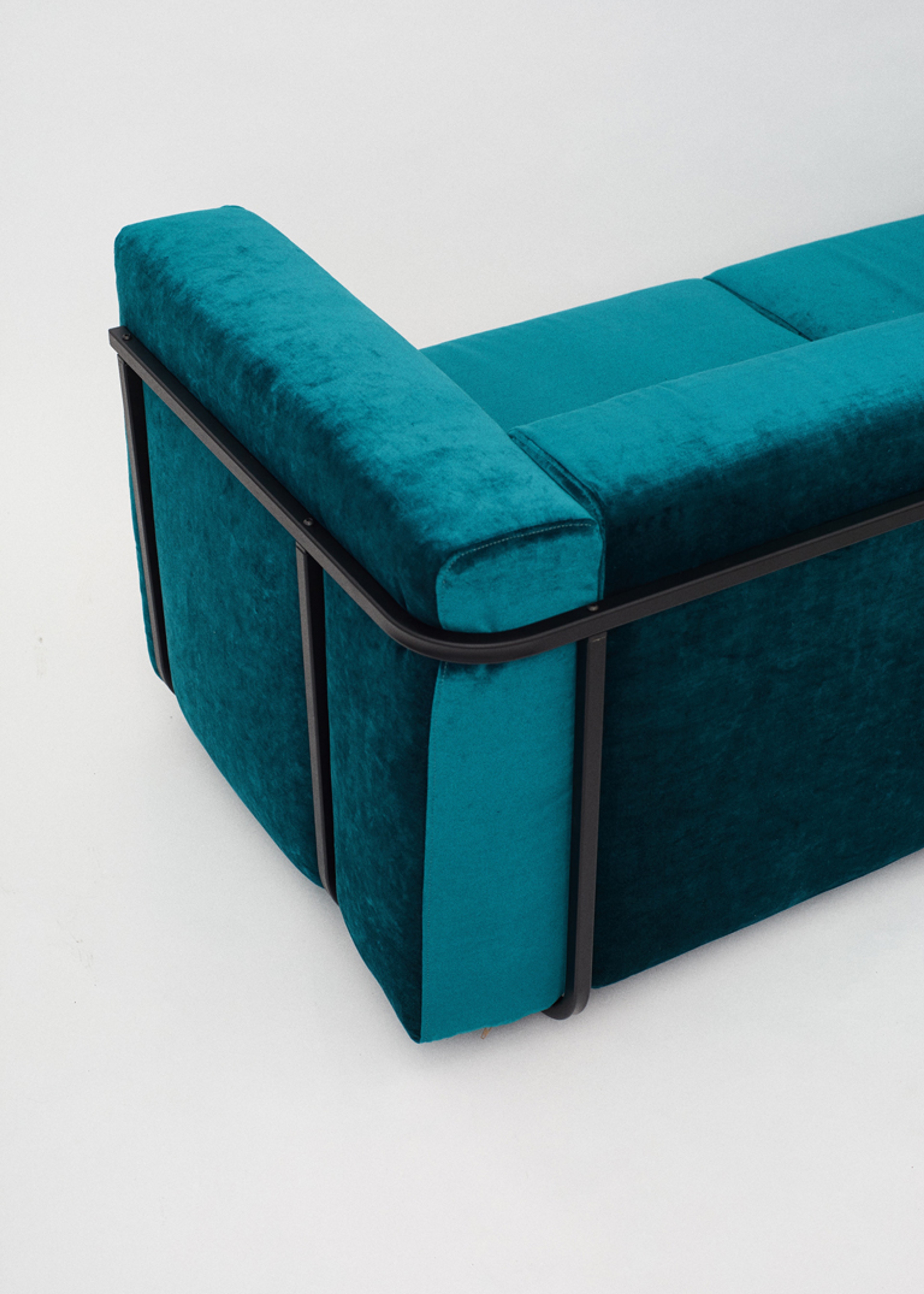 A sofa designed for my step son Nicholas, his only requests – It has to be comfy, Seat himself and two friends and he was to choose the fabric (to match his green velvet Vans). From there I decided to keep all elements beyond the upholstery to a minimum, all that seemed to be needed was a simple frame to keep the cushions together. The frame consists of two U shapes and four angles bent from 3/4 inch ERW box section by my Dad on a machine he uses daily in his workshop. The frame requires no welding and little finishing, bolting together allowing for an easy to assemble and less labour intensive construction. The overall idea being to create an economical sofa that can be knocked down and reassembled multiple times with the hope that Nicholas can take it with wherever life takes him.