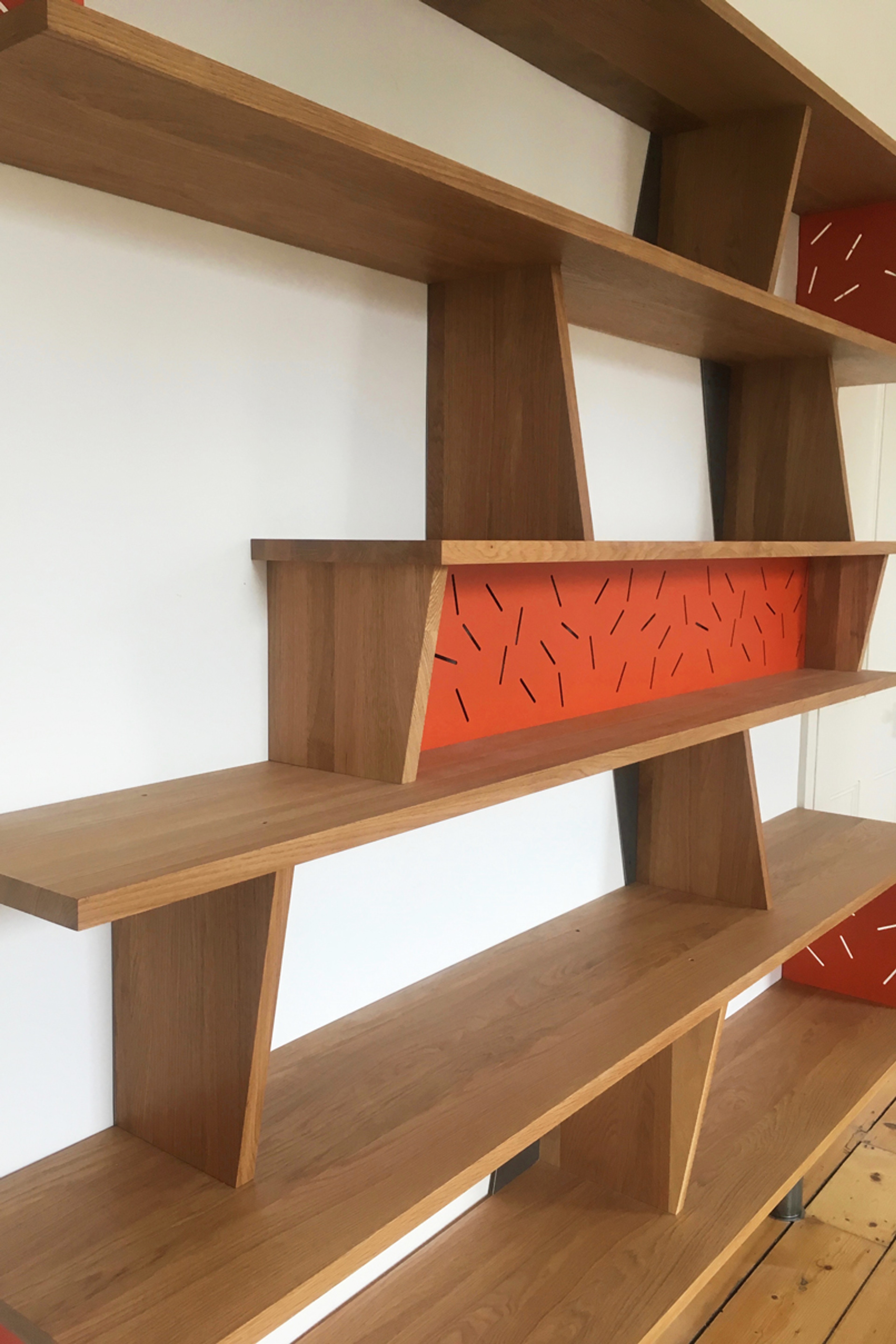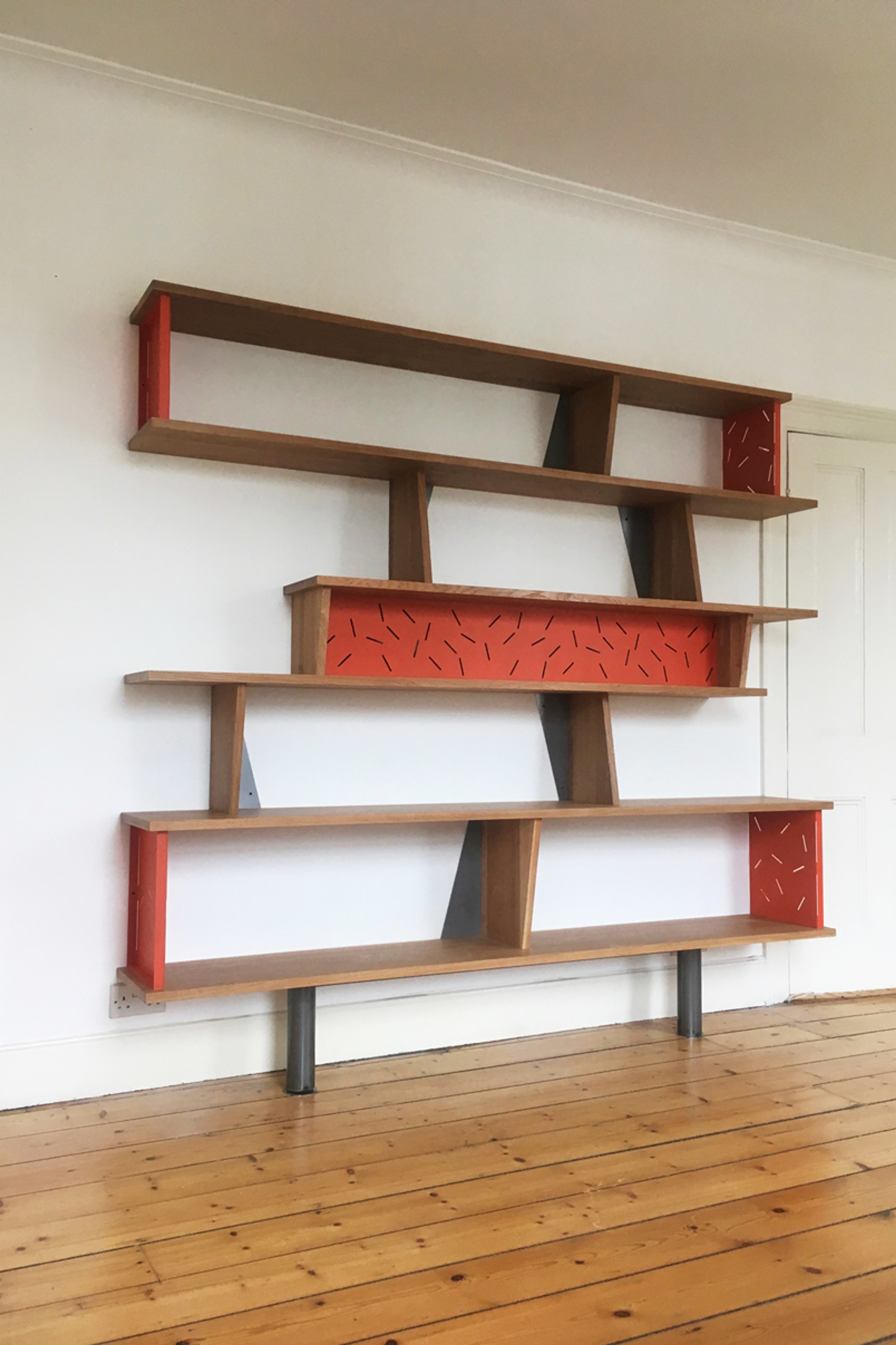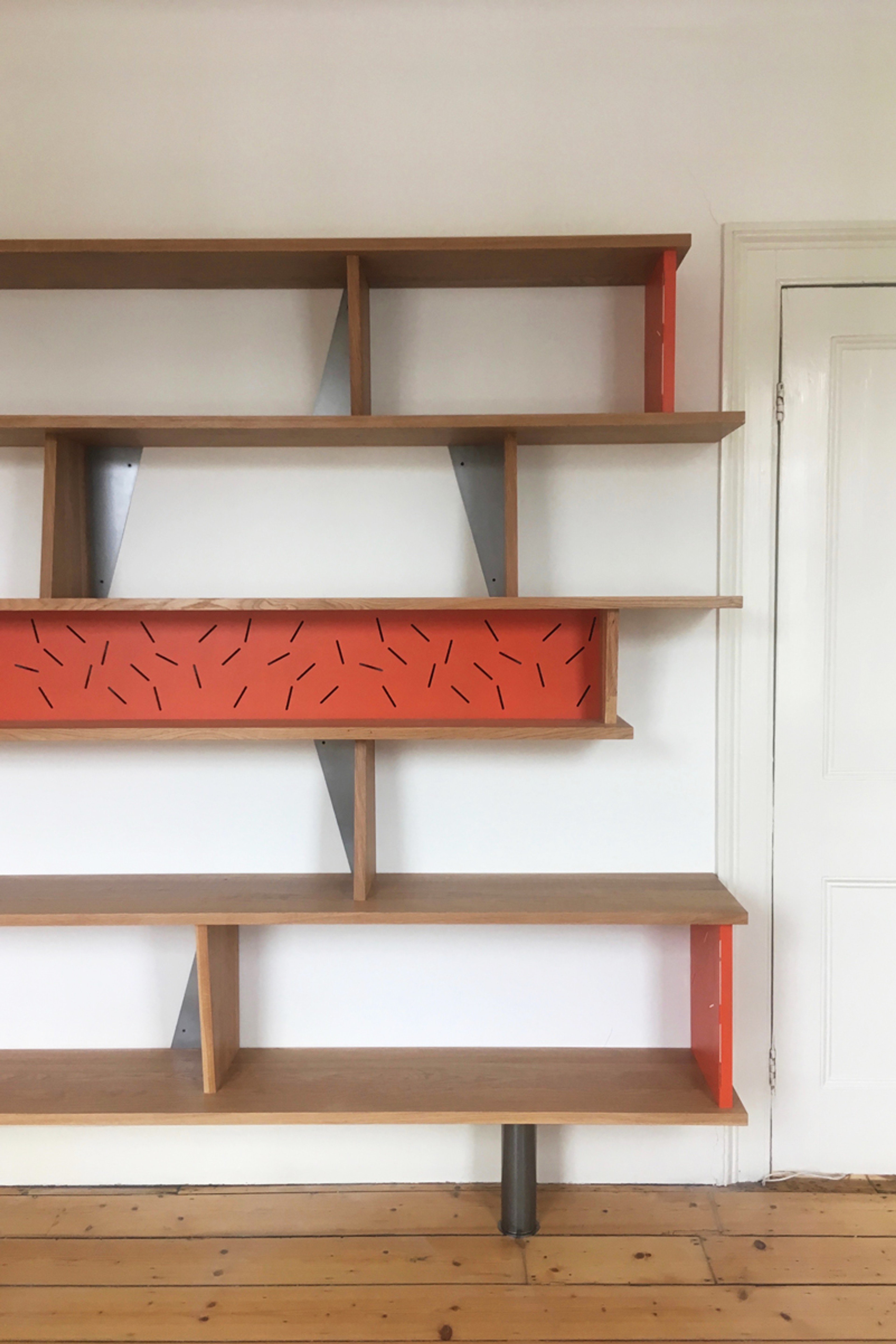 A large bookcase unit designed to hold various sizes of book. The middle shelf has a steel back reducing the depth for smaller books.