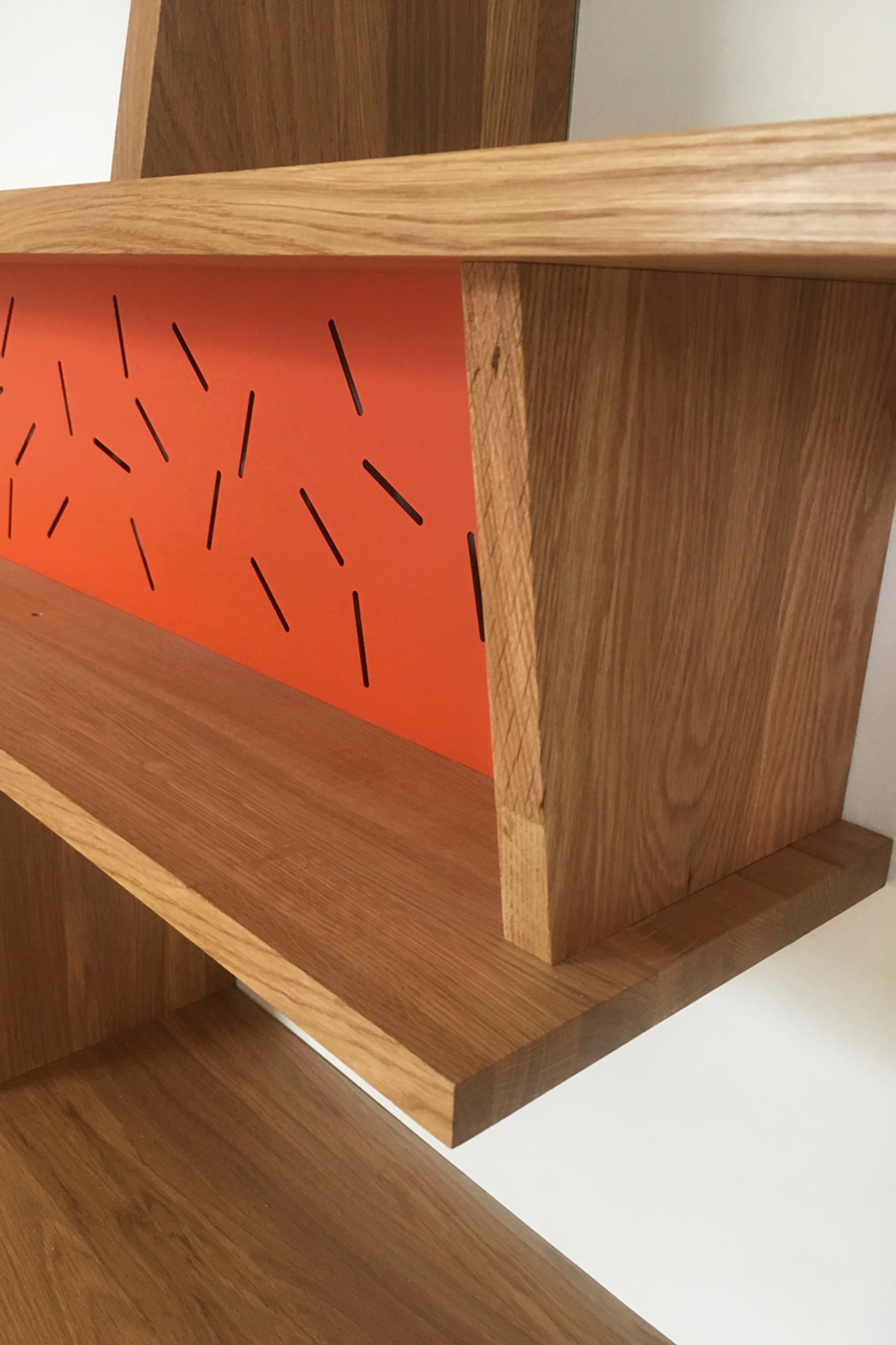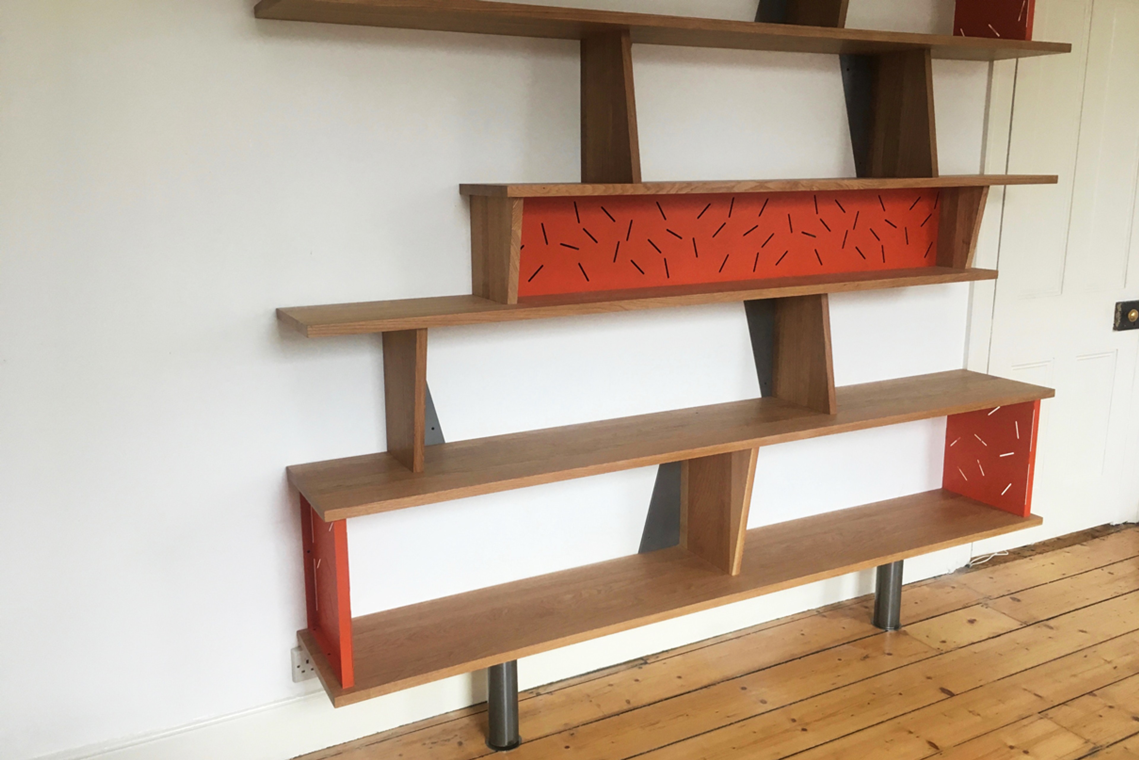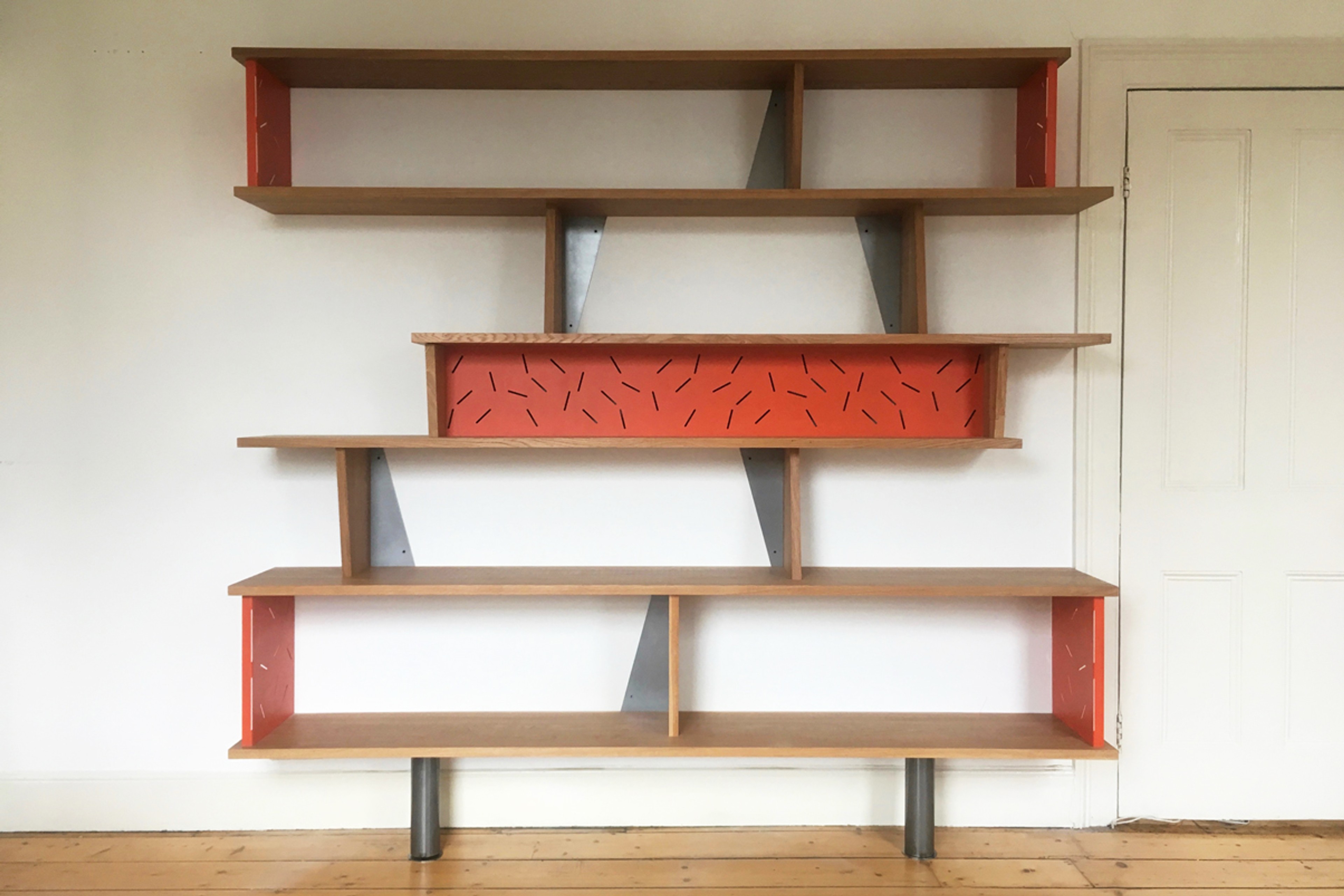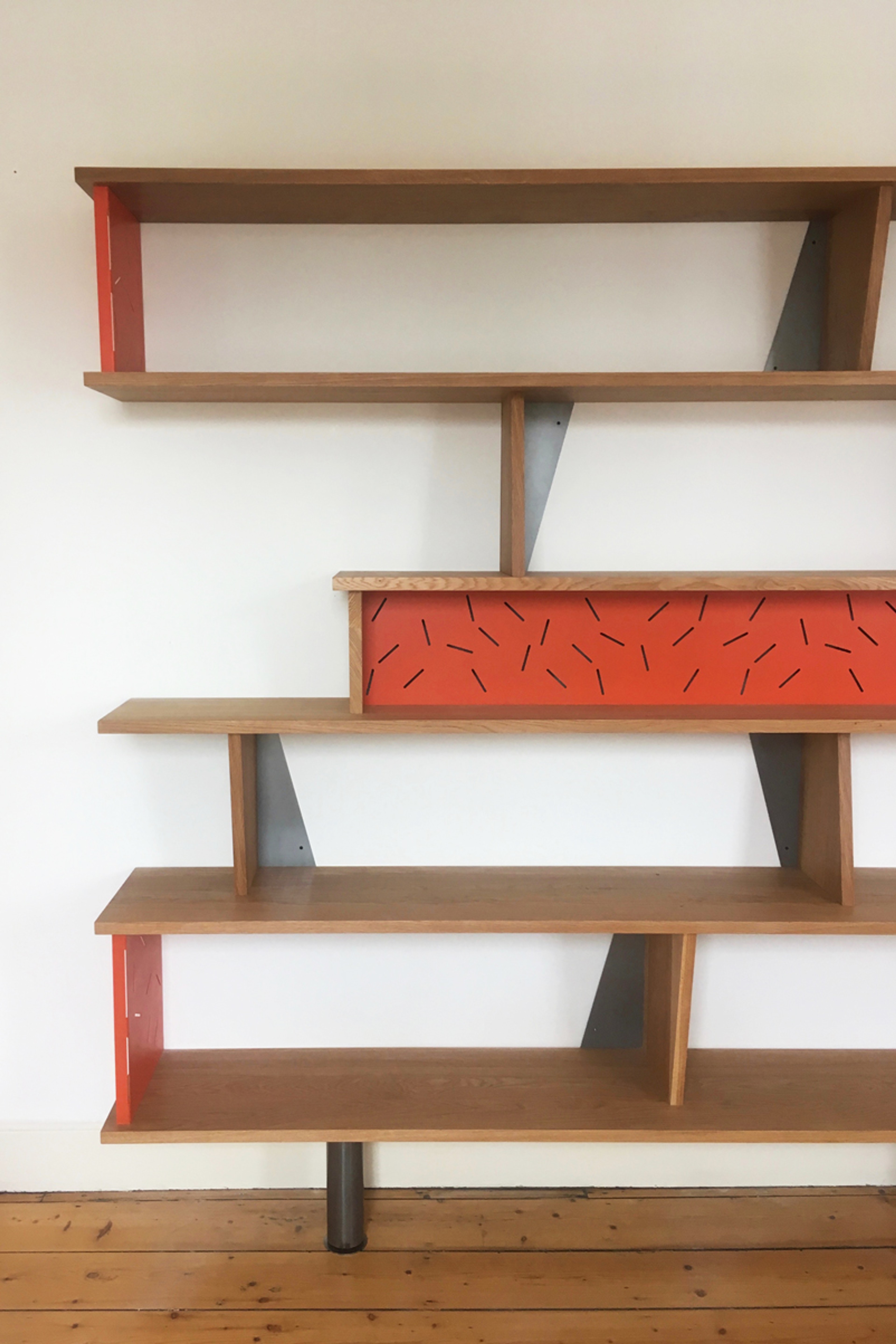 A large bookcase unit designed to hold various sizes of book. The middle shelf has a steel back reducing the depth for smaller books.