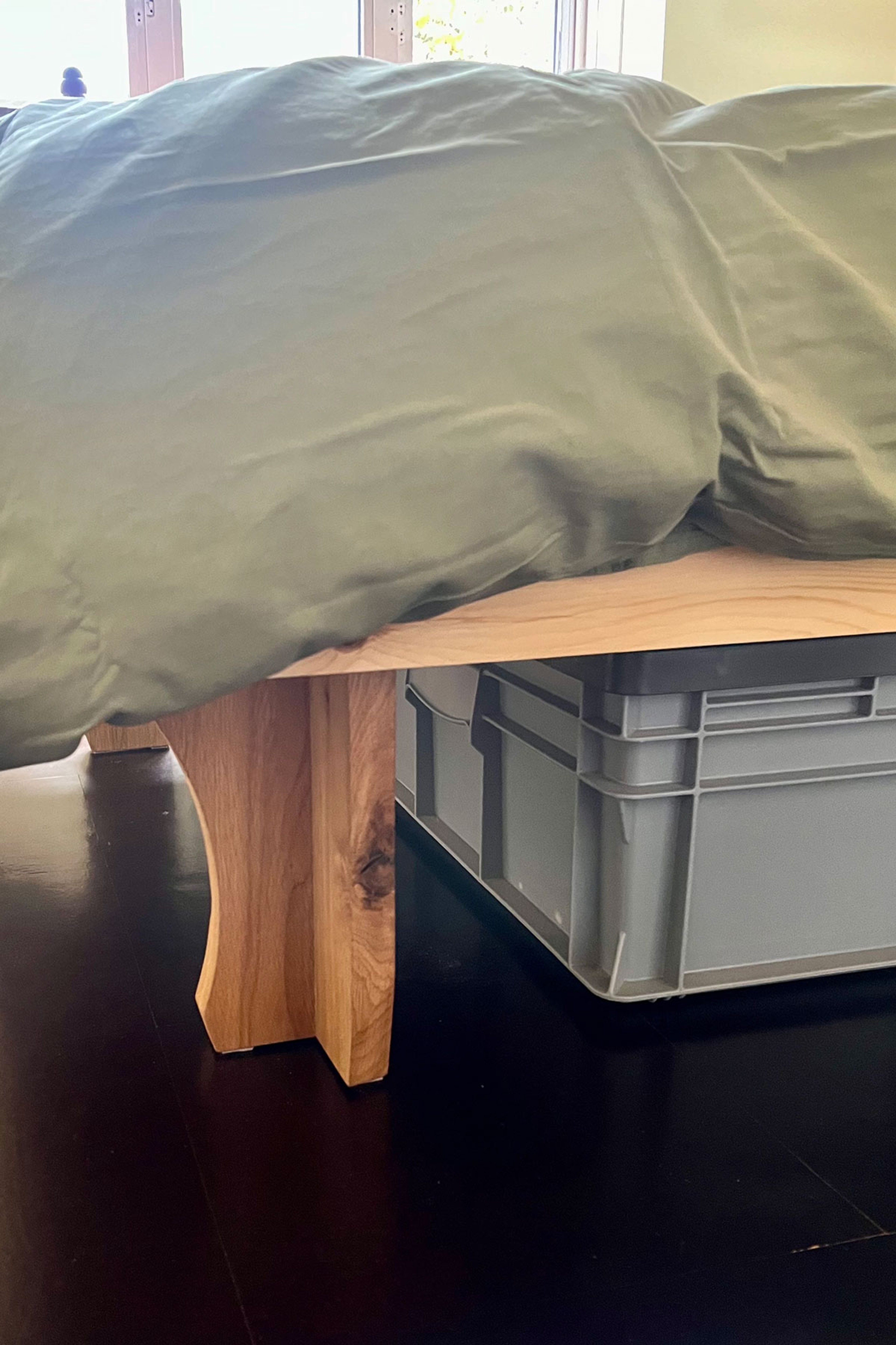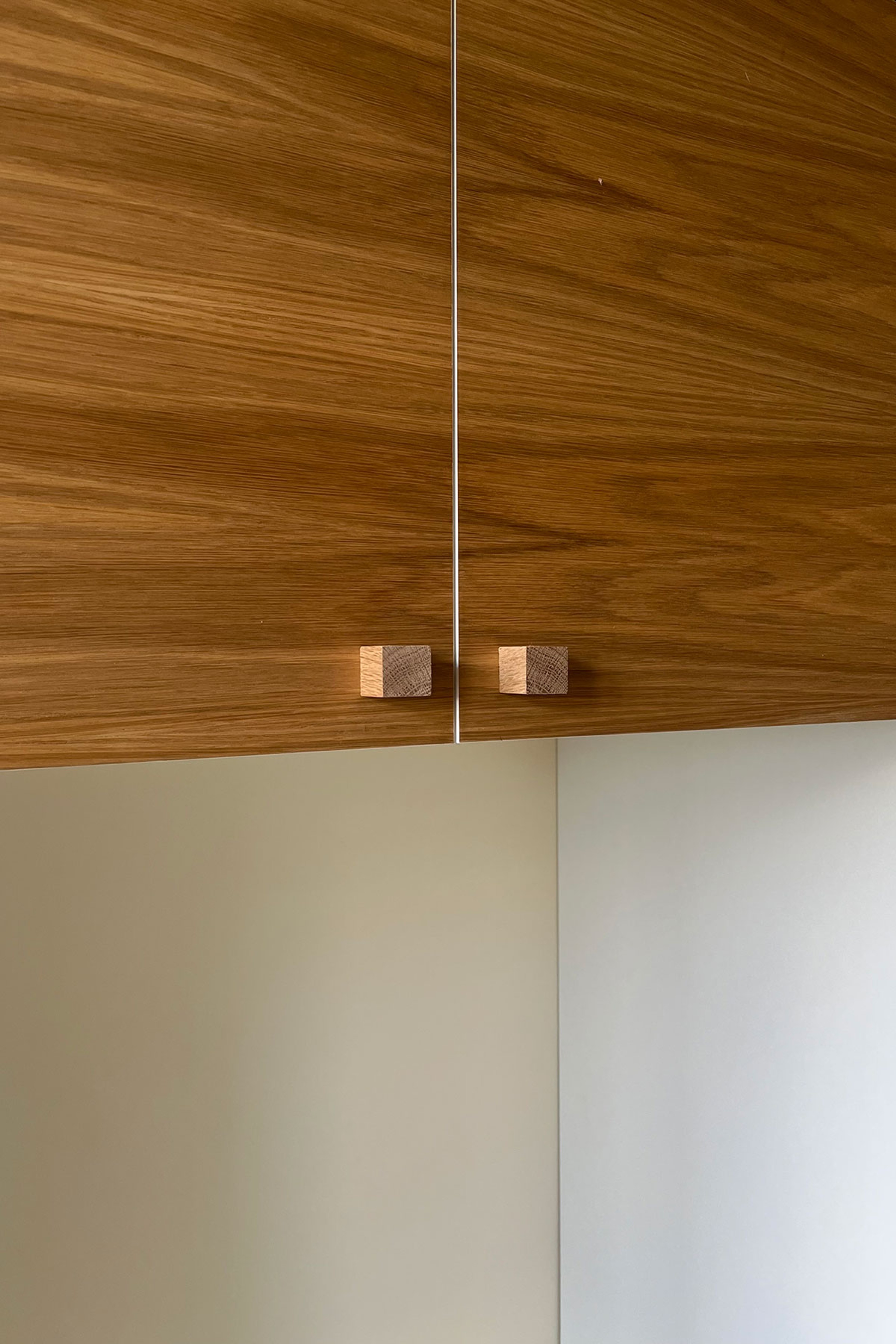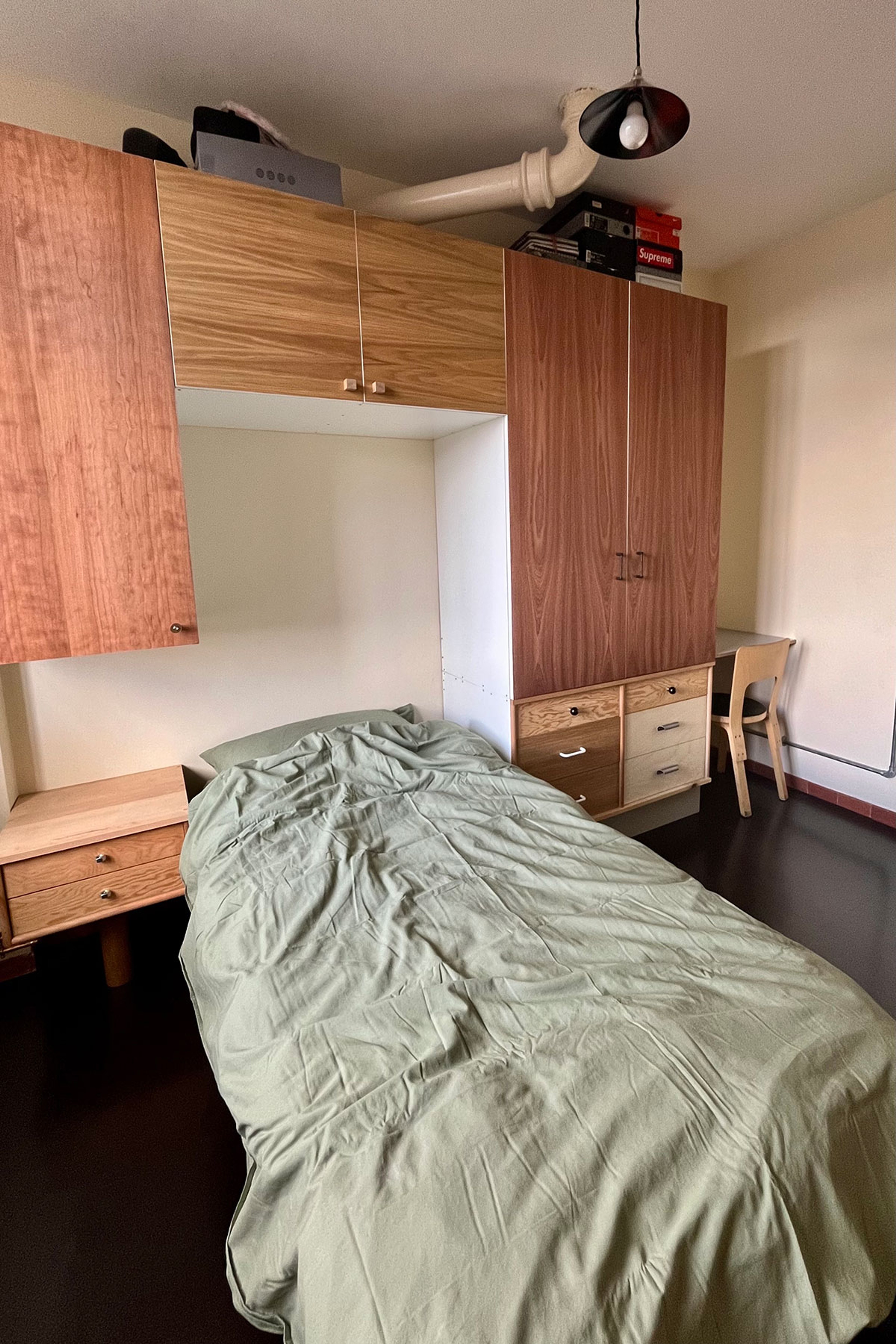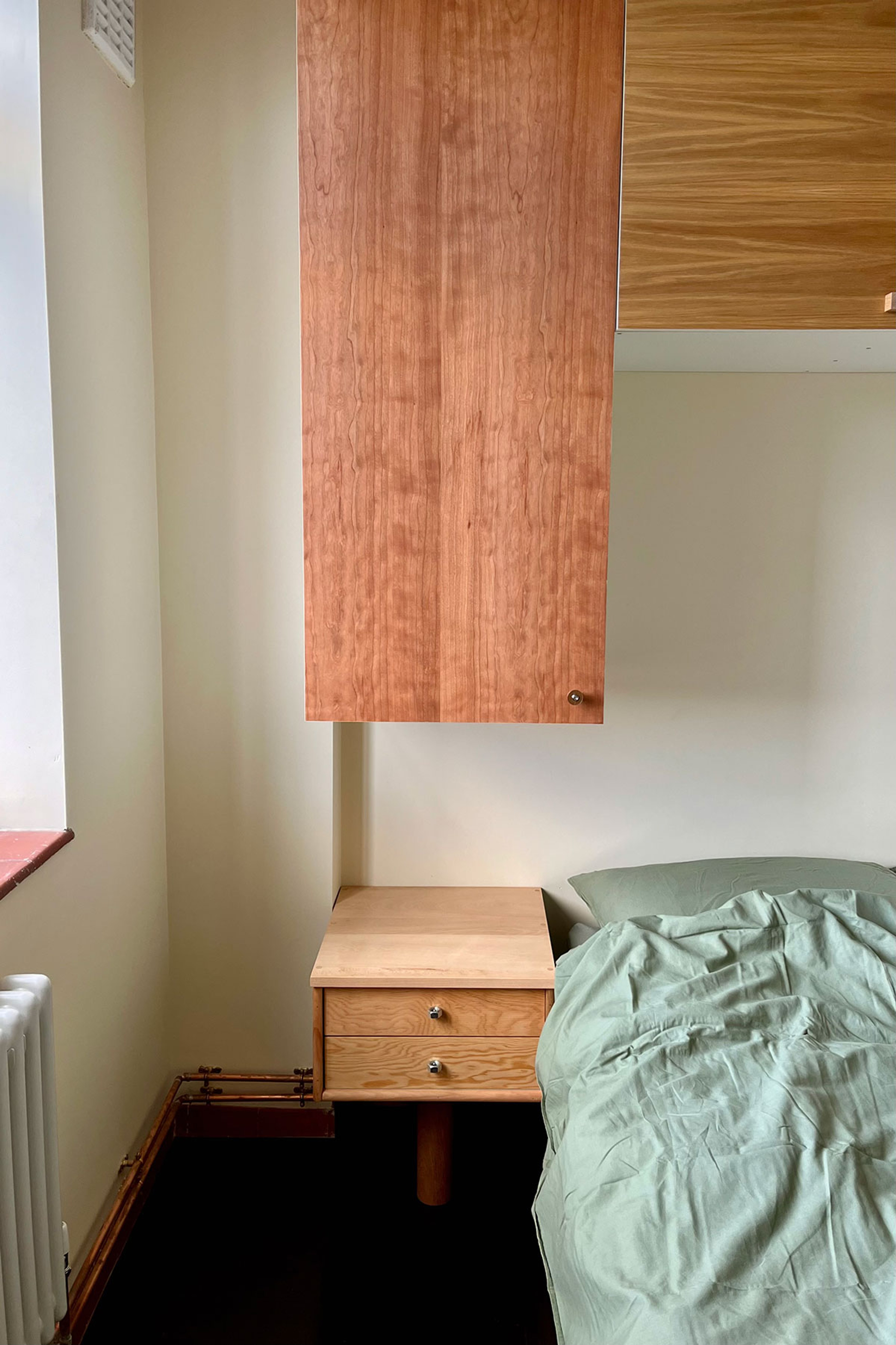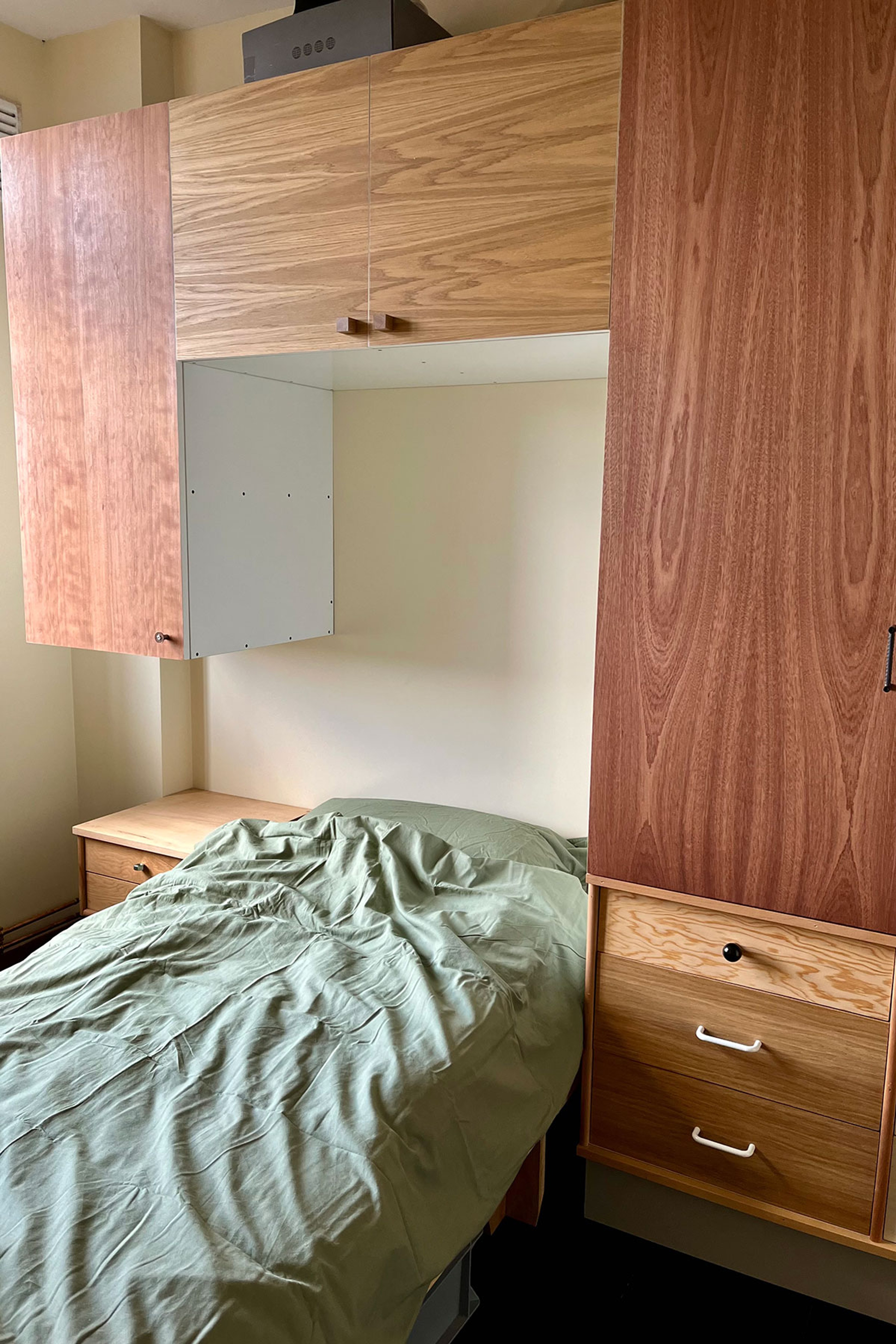 Bed and surrounding cupboards using materials mainly from our stock. Incorporating a clothes rail, desk, bedside cabinet, doored storage and bed.