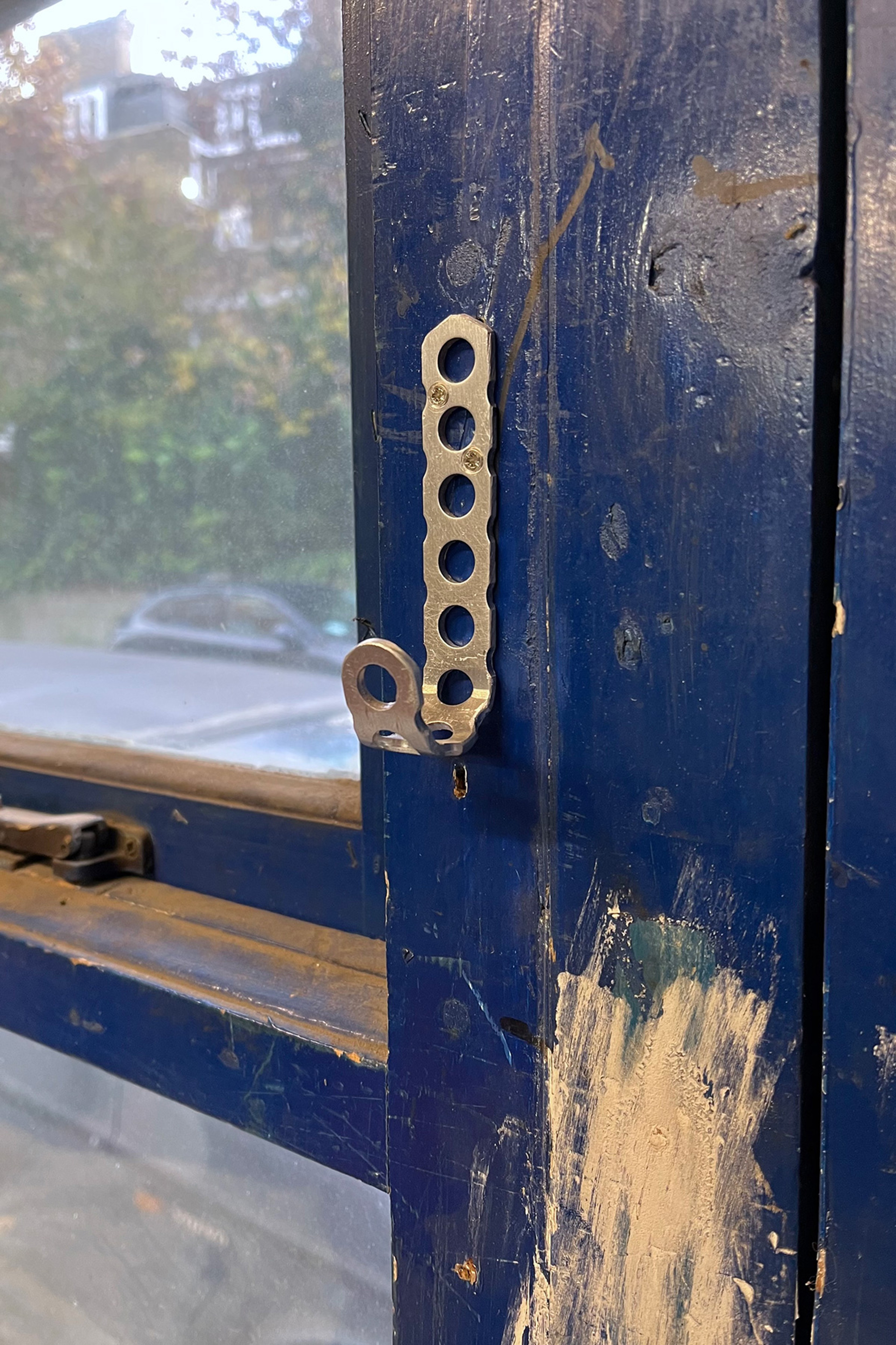 An improvised wall hook made from hand cut and formed perforated aluminium sheet.