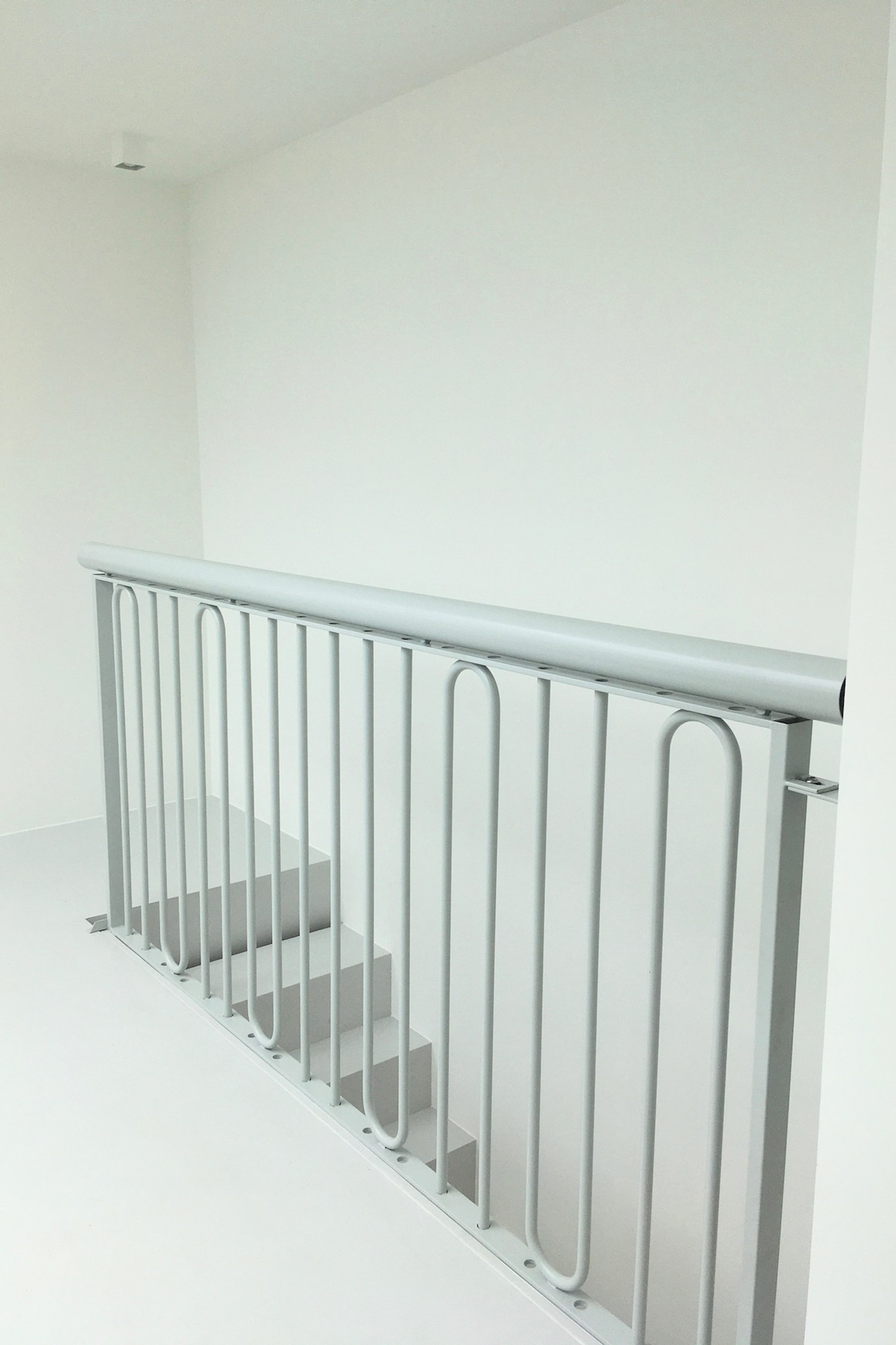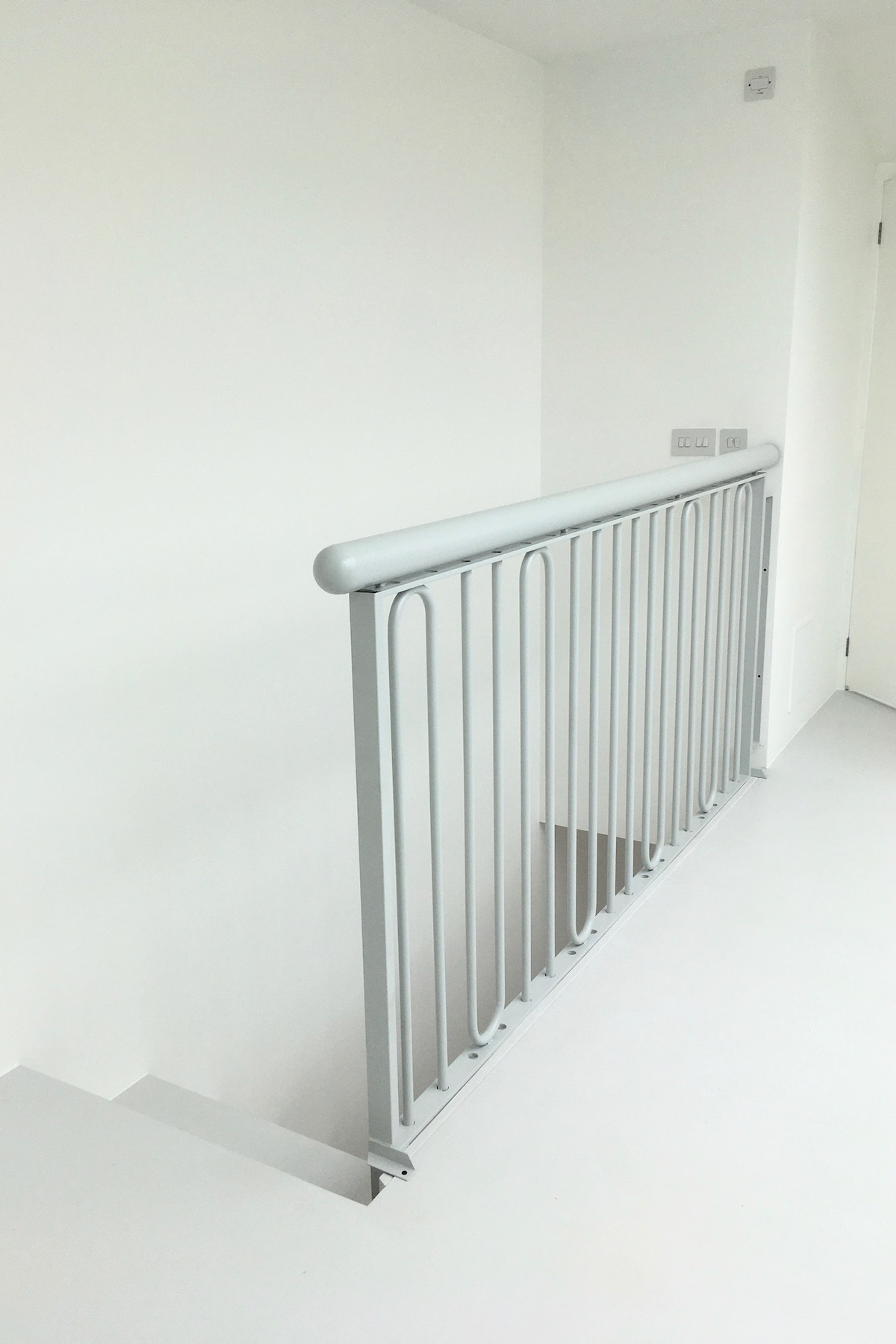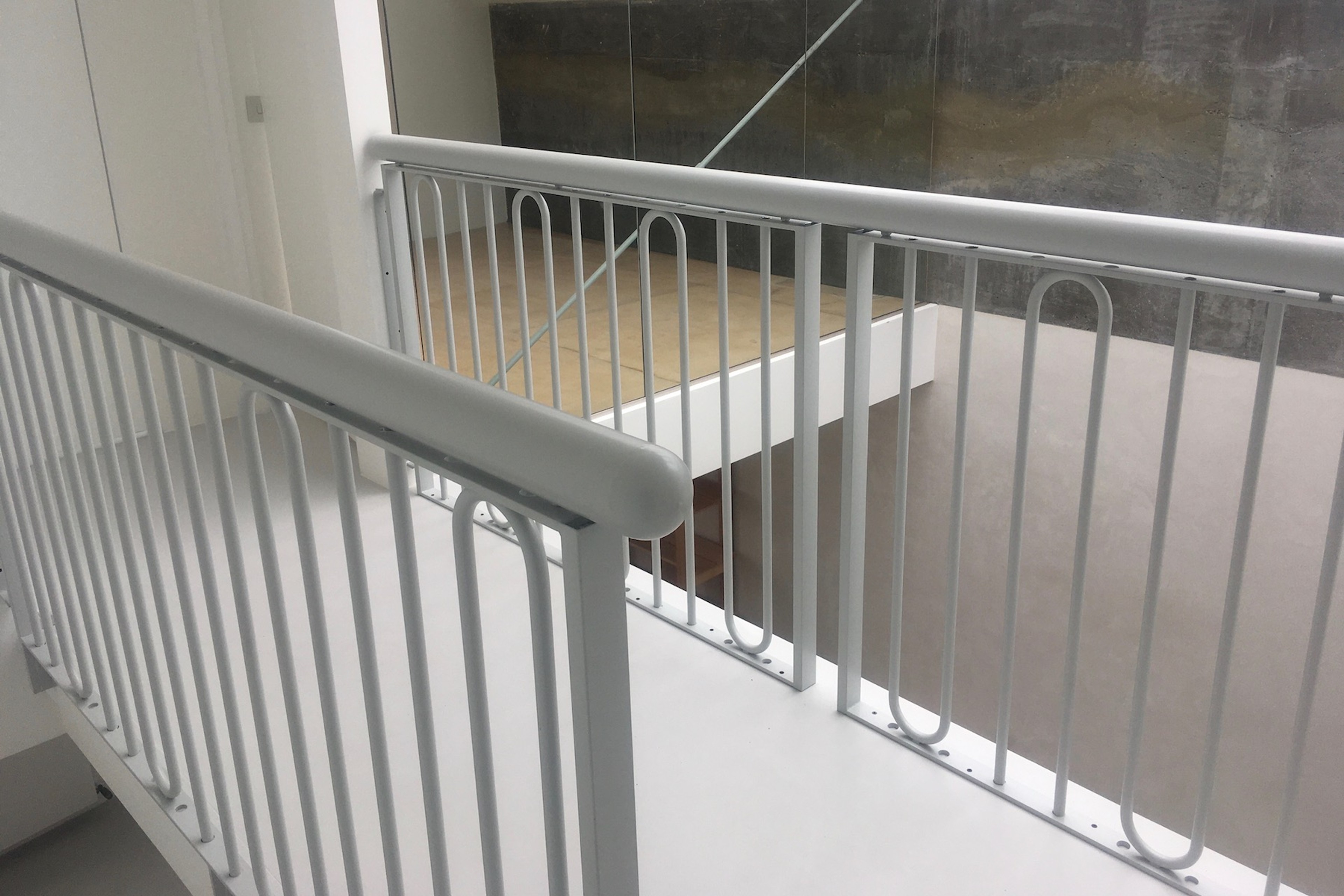A pair of balustrades using bow top railing components and 76mm diameter tube for the handrail.