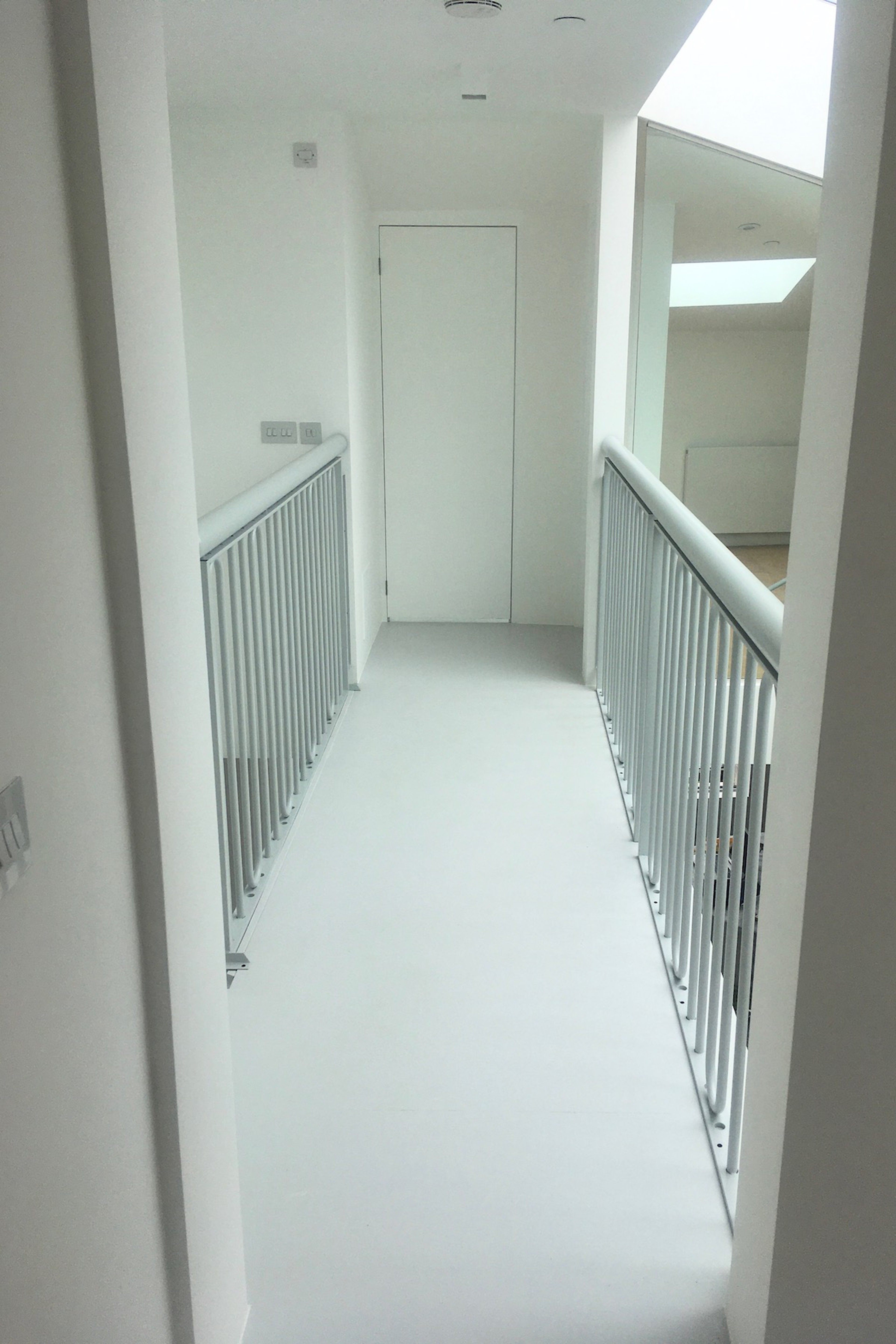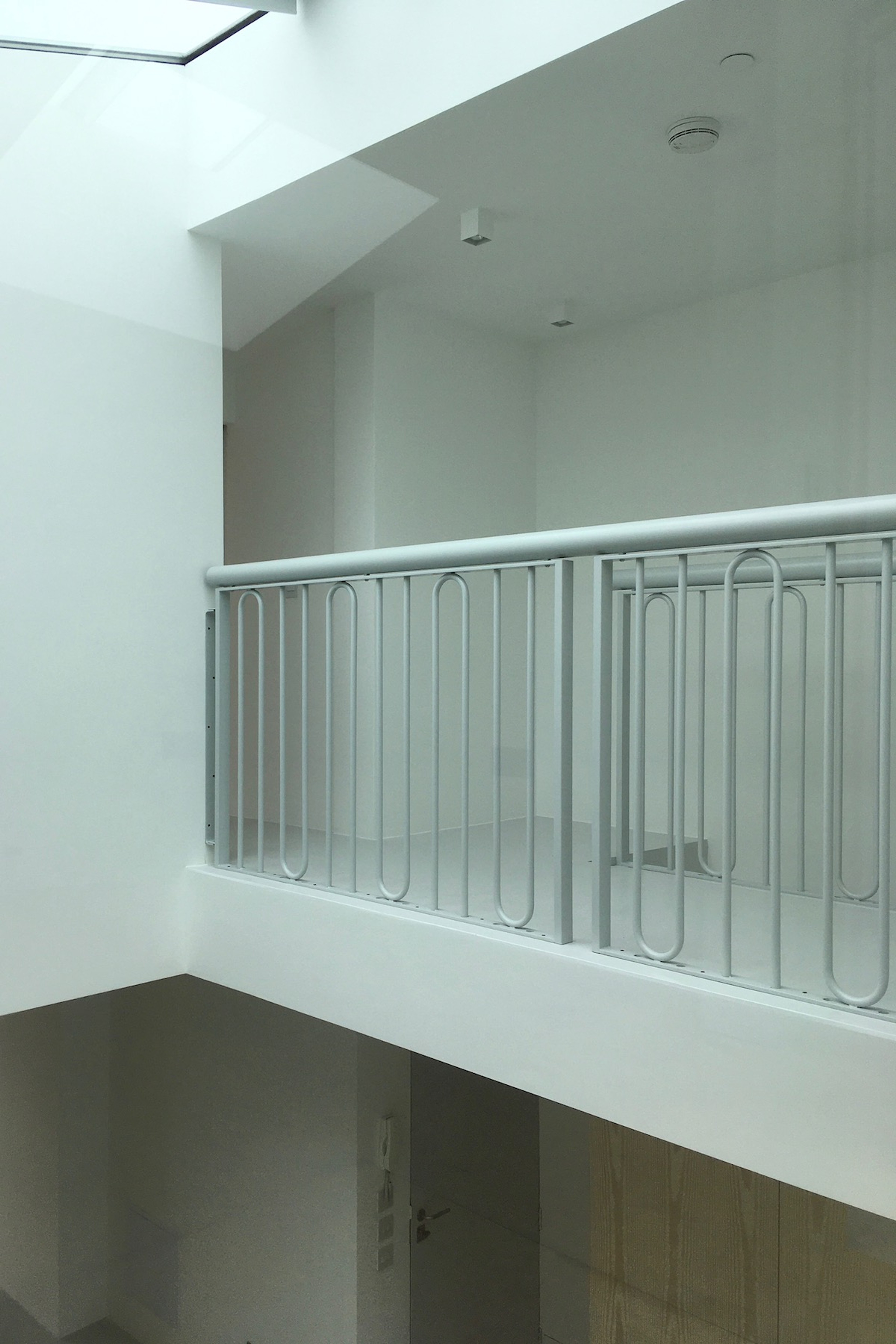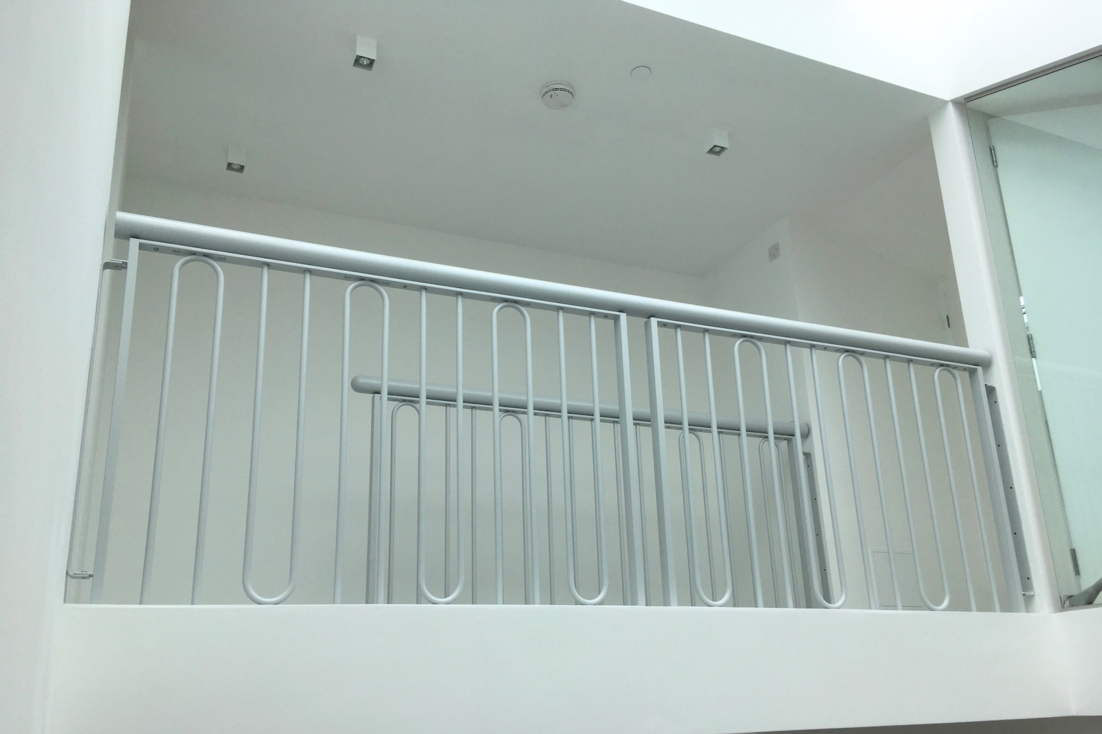 A pair of balustrades using bow top railing components and 76mm diameter tube for the handrail.