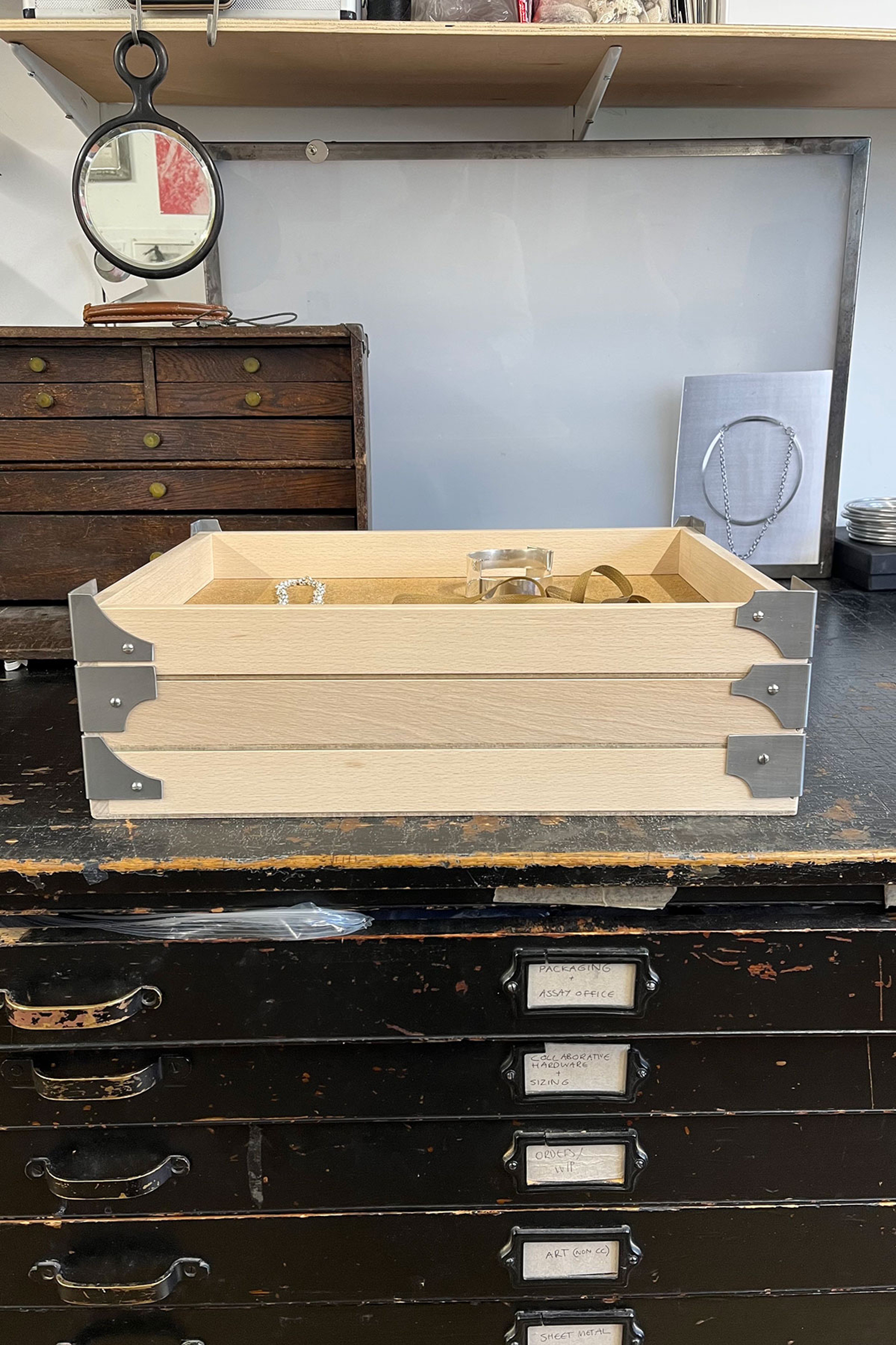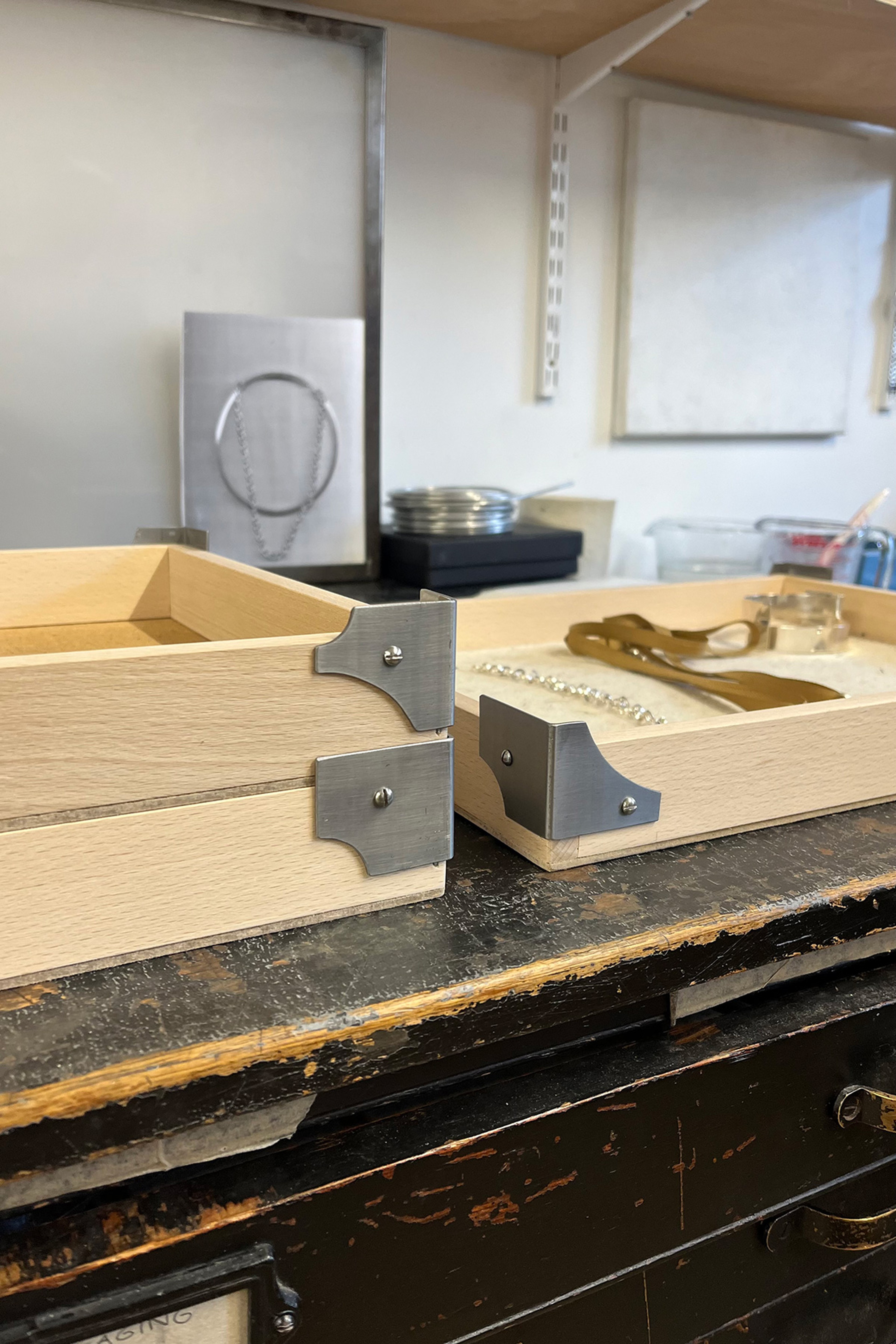 Stacking display trays for CC-Steding. The steel corners are each unique and cut from box section.