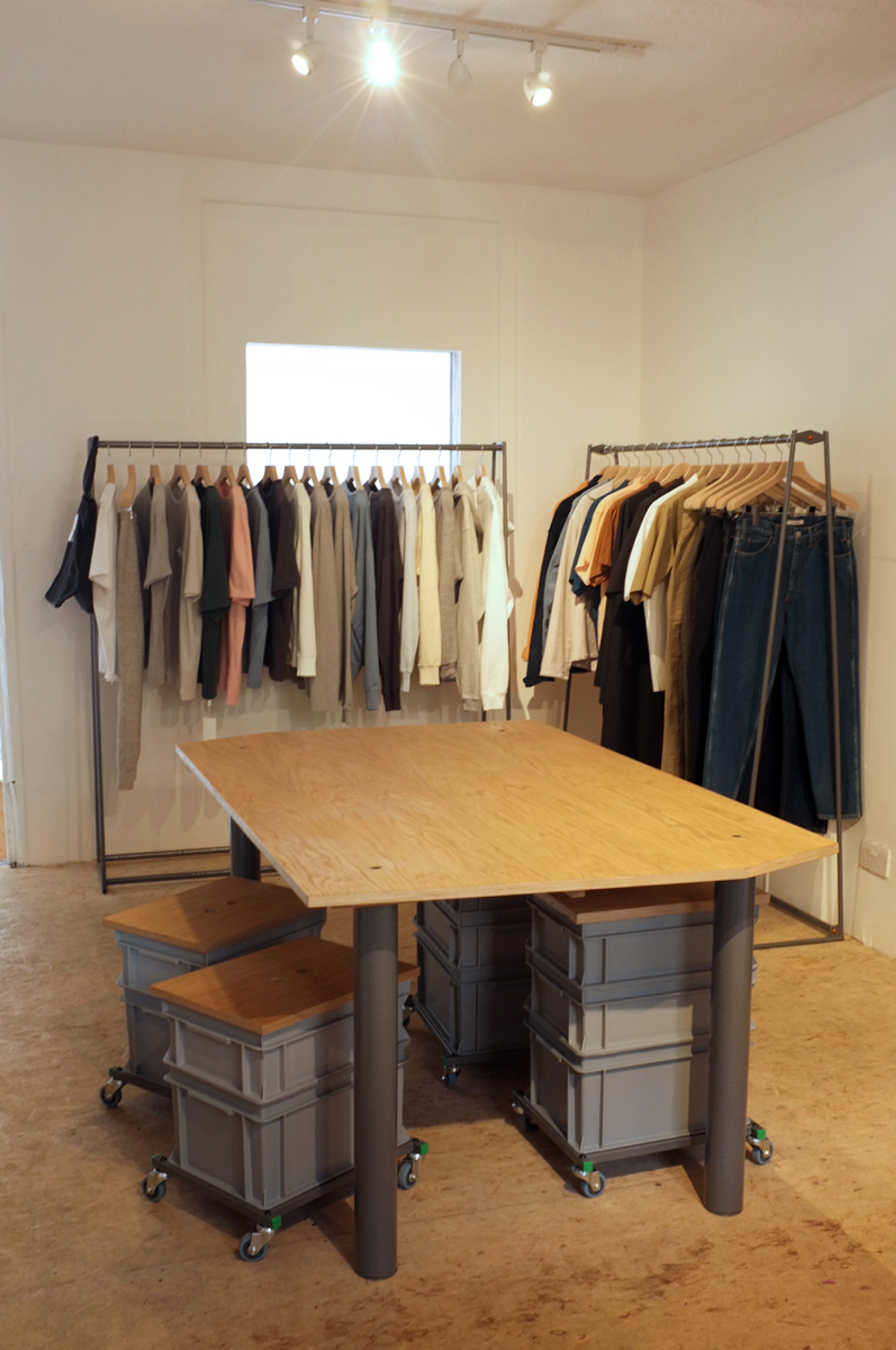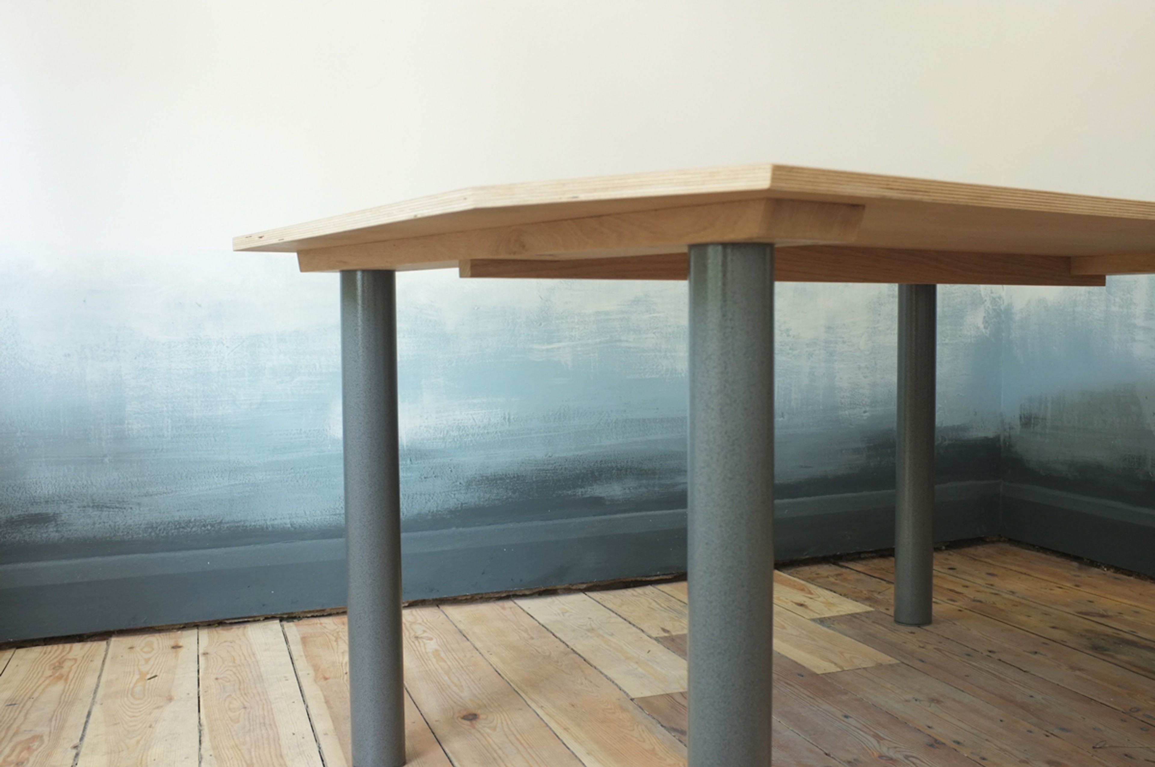 A demountable Table with large diameter column like legs. These legs locate into an Oak subframe and are then secured by allen bolts through the top. Designed for Open as Usual as a multi use table that combines with the Euro Stools to give a flexible work/storage/display solution.