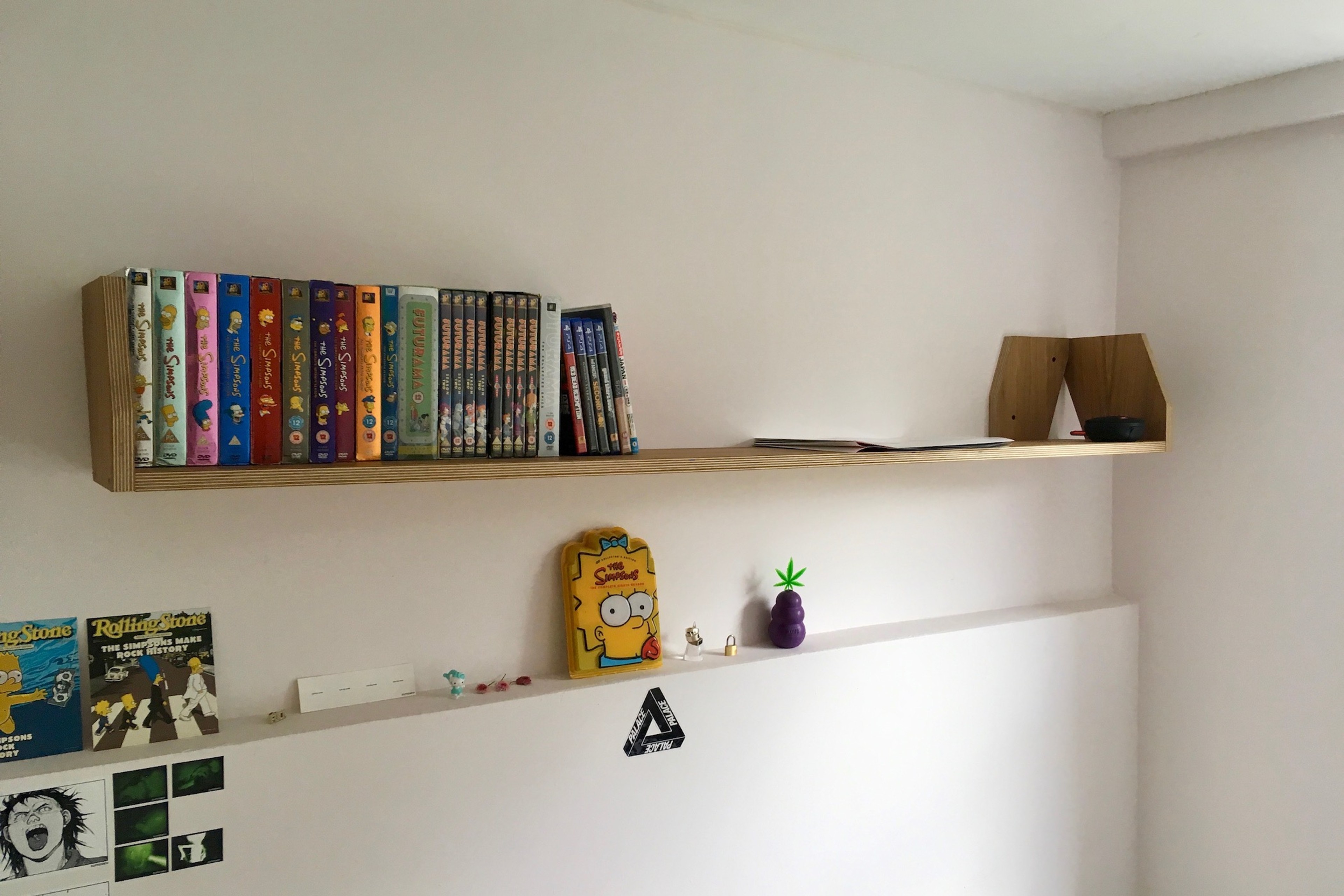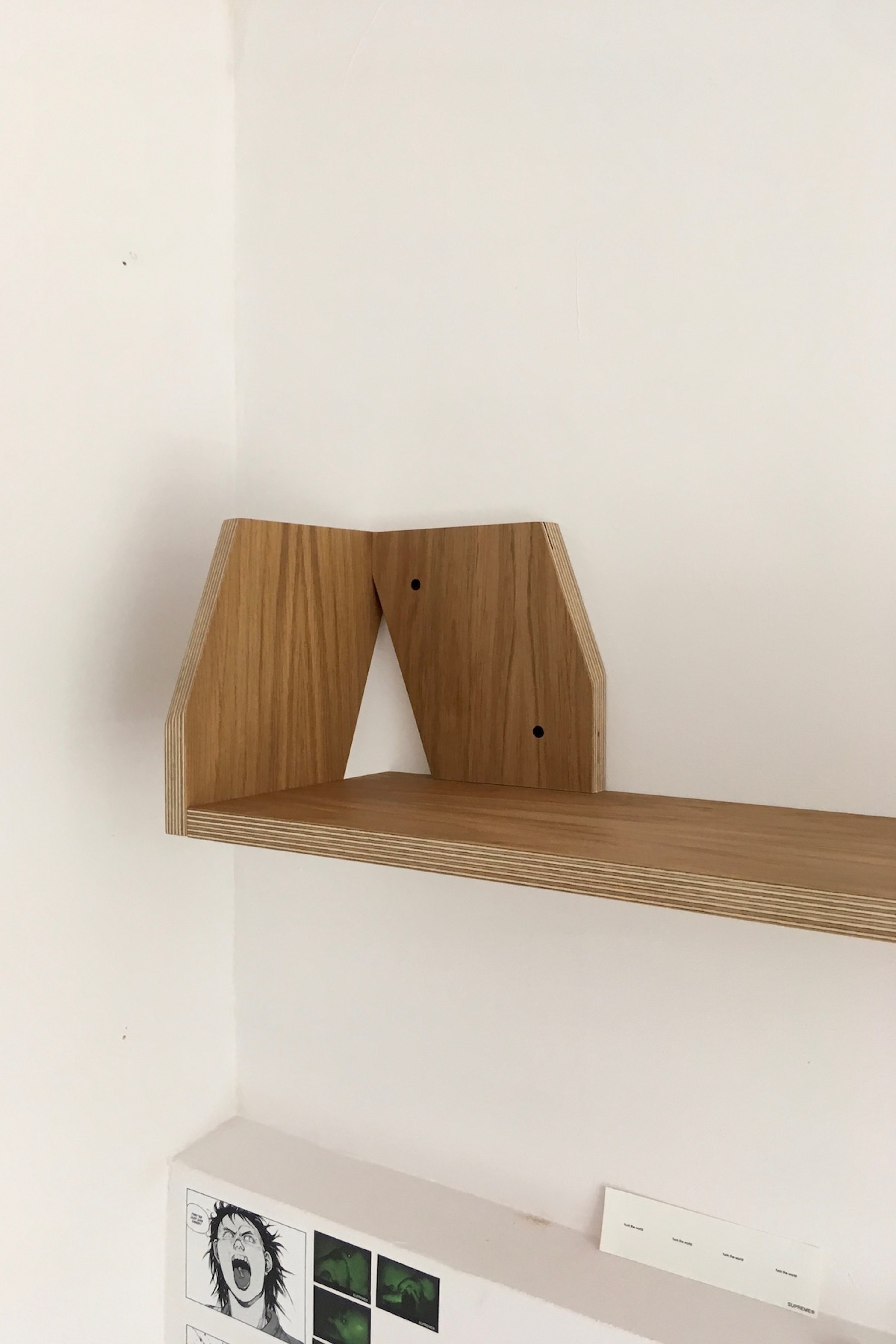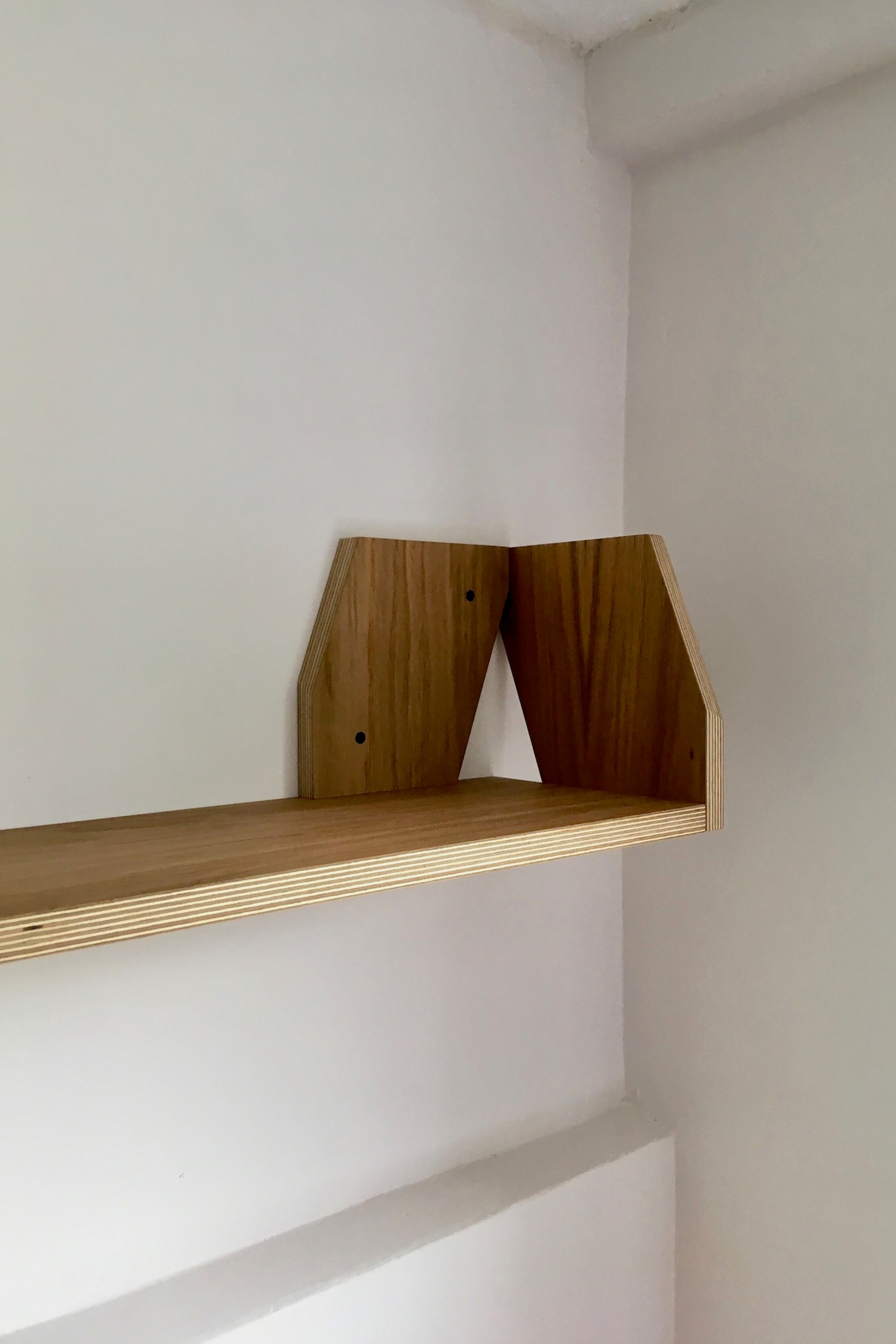 A ply shelf with compound mitred brackets. The brackets and shelf are cut from a single strip of ply 210mm wide.