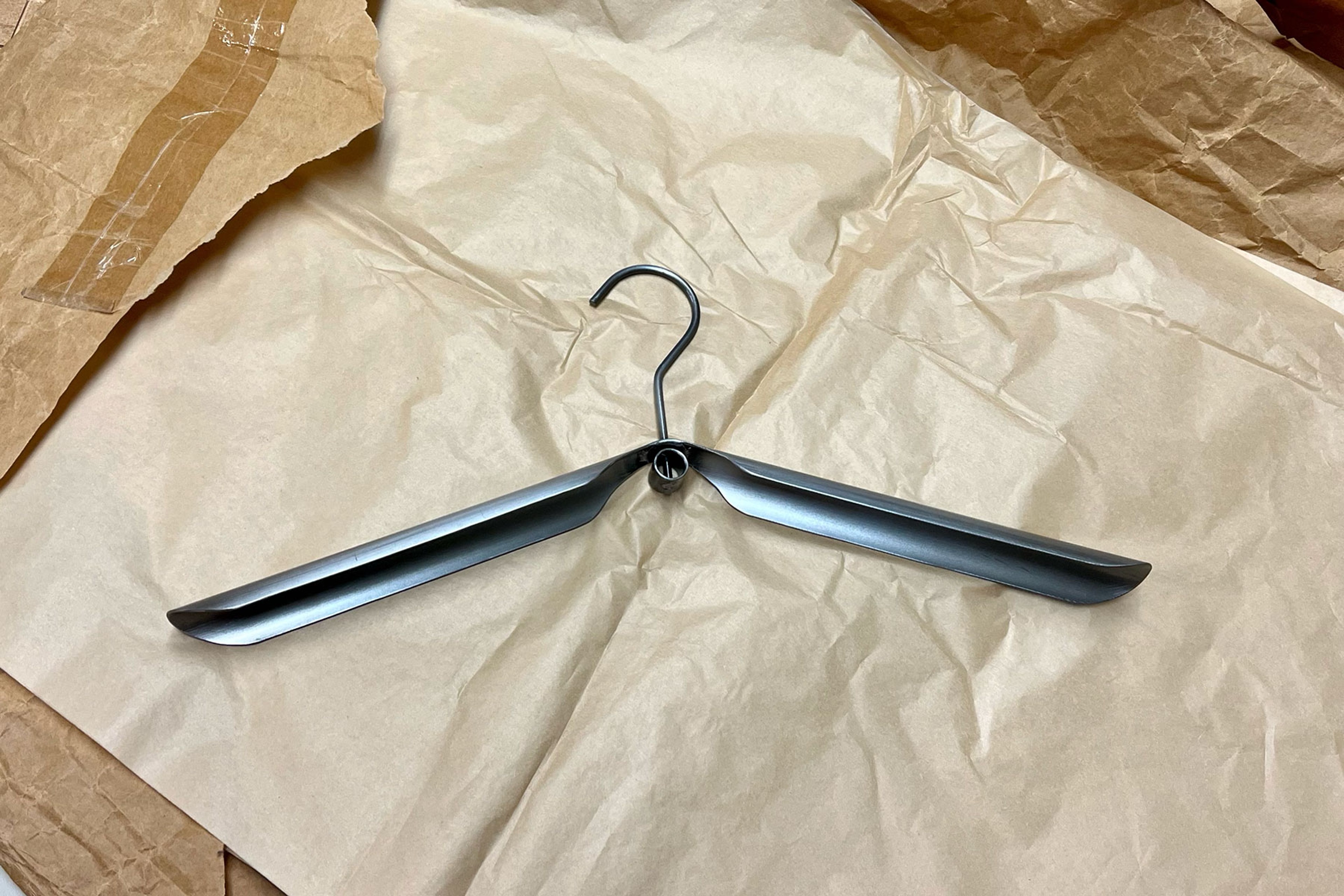 Clothes hanger made with a section of 30mm diameter ERW tube cut and formed by hand.