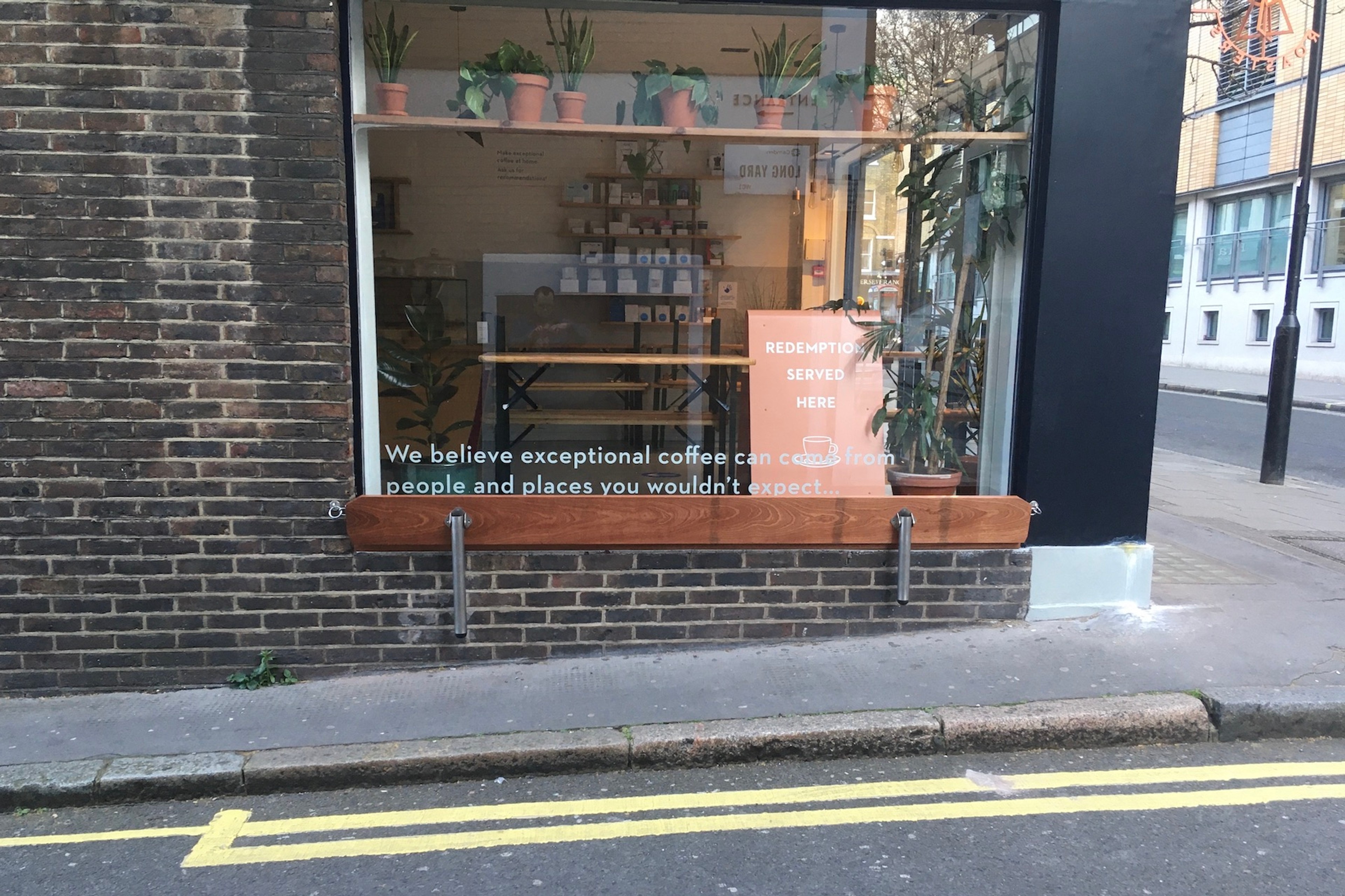 Flip down bench for Redemption. The bench drops down in one motion the legs dropping into place with gravity.